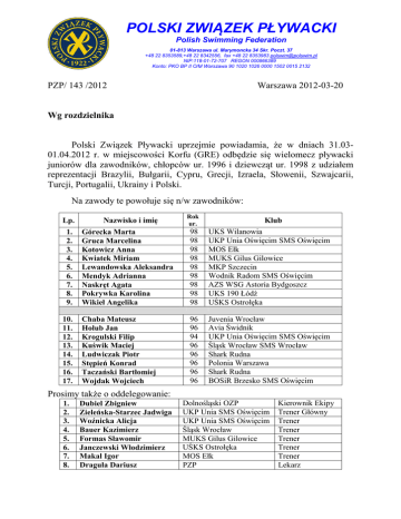 POLSKI ZWIĄZEK PŁYWACKI Polish Swimming Federation 01-813 Warszawa ul. Marymoncka 34 Skr. Poczt. 37 +48 22 8353589,+48 22 8342556, fax +48 22 8353983 [email protected] NIP:118-01-72-707 REGON 000866389 Konto: PKO BP II O/M Warszawa 90 1020 1026 0000 1502 0015 2132 PZP/ 143 /2012 Warszawa 2012-03-20 Wg rozdzielnika Polski Związek Pływacki uprzejmie powiadamia, że w dniach 31.0301.04.2012 r. w miejscowości Korfu (GRE) odbędzie się wielomecz pływacki juniorów dla zawodników, chłopców ur. 1996 i dziewcząt ur. 1998 z udziałem reprezentacji Brazylii, Bułgarii, Cypru, Grecji, Izraela, Słowenii, Szwajcarii, Turcji, Portugalii, Ukrainy i Polski. Na zawody te powołuje się n/w zawodników: Lp. 1. 2. 3. 4. 5. 6. 7. 8. 9. 10. 11. 12. 13. 14. 15. 16. 17. Nazwisko i imię Rok ur. Klub Górecka Marta Gruca Marcelina Kotowicz Anna Kwiatek Miriam Lewandowska Aleksandra Mendyk Adrianna Naskręt Agata Pokrywka Karolina Wikieł Angelika 98 98 98 98 98 98 98 98 98 UKS Wilanowia UKP Unia Oświęcim SMS Oświęcim MOS Ełk MUKS Gilus Gilowice MKP Szczecin Wodnik Radom SMS Oświęcim AZS WSG Astoria Bydgoszcz UKS 190 Łódź UŚKS Ostrołęka Chaba Mateusz Hołub Jan Krogulski Filip Kuświk Maciej Ludwiczak Piotr Stępień Konrad Taczański Bartłomiej Wojdak Wojciech 96 96 94 96 96 96 96 96 Juvenia Wrocław Avia Świdnik UKP Unia Oświęcim SMS Oświęcim Śląsk Wrocław SMS Wrocław Shark Rudna Polonia Warszawa Shark Rudna BOSiR Brzesko SMS Oświęcim Prosimy także o oddelegowanie: 1. 2. 3. 4. 5. 6. 7. 8. Dubiel Zbigniew Zieleńska-Starzec Jadwiga Woźnicka Alicja Bauer Kazimierz Formas Sławomir Janczewski Włodzimierz Makal Igor Draguła Dariusz Dolnośląski OZP UKP Unia SMS Oświęcim UKP Unia SMS Oświęcim Śląsk Wrocław MUKS Gilus Gilowice UŚKS Ostrołęka MOS Ełk PZP Kierownik Ekipy Trener Główny Trener Trener Trener Trener Trener Lekarz Wyjazd na zawody nastąpi 29 marca 2012 z MDL Warszawa Okęcie o godz. 11.05 rejsem LO603 do Aten, powrót (lądowanie w Warszawie) 02 kwietnia 2011 o godz. 17.20 rejsem LO604 z Aten. Zbiórka powołanych 29 marca 2012 w Hali Odlotów MDL im. F. Chopina o godz. 09.00 (Terminal 2). Dla powołanych spoza Warszawy został zarezerwowany nocleg w Warszawie z 28 na 29 marca 2012 w hotelu Aramis, ul. Mangalia 3 B, Warszawa. Osobom korzystającym z noclegu zostanie zapewniona kolacja 28.03. śniadanie 29.03. oraz transport na MDL Okęcie. W hotelu należy się stawić 28 marca do godz. 19.00. Program zawodów i propozycje obsady konkurencji w załączeniu. Powołani zostaną wyposażeni w dresy reprezentacyjne, koszulkę, szorty, klapki, - firmy - ARENA (zawodnicy ponadto w czepki, slipy/kostiumy, okulary), pozostały sprzęt indywidualny do zawodów należy zabrać ze sobą. Prosimy o bezzwłoczne podanie rozmiarów: koszulki i dresy (XL, L, M, S), klapki, kostiumy startowe arena wg rozmiarów „INT” na adres [email protected] lub [email protected]. Uwaga: osoby, które otrzymały w ubiegłym roku dresy w bieżącym roku ich nie otrzymają, proszone są o zabranie posiadanego już sprzętu. Zawodnicy muszą posiadać pisemne zgody rodziców na wyjazd, a ci którzy po powrocie nie będą odbierani z lotniska przez swoich rodziców ponadto muszą posiadać pisemne upoważnienia opiekunów prawnych do odbioru przez wskazane osoby trzecie. Osoby wyjeżdżające z PZP po raz pierwszy proszone są o bezzwłoczne podanie (e-mailem [email protected] lub [email protected] faxem lub telefonicznie) dat urodzenia, adresu zamieszkania i nr paszportu do ubezpieczenia. Koszty przyjazdu do Warszawy i powrót do miejsc zamieszkania po zawodach pokrywają jednostki delegujące. Pozostałe koszty pokrywa PZP. Kierownik Organizacyjno-Szkoleniowy PZP mgr Jerzy Kowalski Otrzymują: 1. Zainteresowane Kluby/SMS 2. a/a PREZES mgr Krzysztof Usielski FINAL ENTRY FORM BOYS Distance 100 200 400 4x100 Event Freestyle Backstroke Ind. Medley Medley Gender M M M M Surname and given Name Hołub Jan Krogulski Filip Kuświk Maciej Date of Birth 1996 1996 1996 Distance 400 100 100 4x200 Event Freestyle Breaststroke Butterfly Freestyle Gender M M M M Surname and given Name Kuświk Maciej Stępień Konrad Chaba Mateusz Date of Birth 1996 1996 1996 Distance 200 100 1500 Event Breaststroke Backstroke Freestyle Gender M M M Surname and given Name Stępień Konrad Krogulski Filip Wojdak Wojciech Date of Birth 1996 1996 1996 Distance 200 200 200 Event Freestyle Butterfly IM Gender M M M 4x100 Freestyle M Surname and given Name Wojdak Wojciech Kuświk Maciej Krogulski Filip Ludwiczak Piotr Taczański Bartłomiej Date of Birth 1996 1996 1996 1996 1996 FINAL ENTRY FORM GIRLS Distance 100 200 400 4x100 Event Freestyle Backstroke Ind. Medley Medley Gender W W W W Surname and given Name Pokrywka Karolina Naskręt Agata Mendyk Adrianna Date of Birth 1998 1998 1998 Distance 400 100 100 4x200 Event Freestyle Breaststroke Butterfly Freestyle Gender W W W W Surname and given Name Kotowicz Anna Wikieł Manuela Kwiatek Miriam Date of Birth 1998 1998 1998 Distance 800 200 100 Event Freestyle Breaststroke Backstroke Gender W W W Surname and given Name Kotowicz Anna Wikieł Manuela Naskręt Agata Date of Birth 1998 1998 1998 Distance 200 200 200 4x100 Event Freestyle Butterfly IM Freestyle Gender W W W W Surname and given Name Pokrywka Karolina Gruca Marcelina Kwiatek Miriam Date of Birth 1998 1998 1998