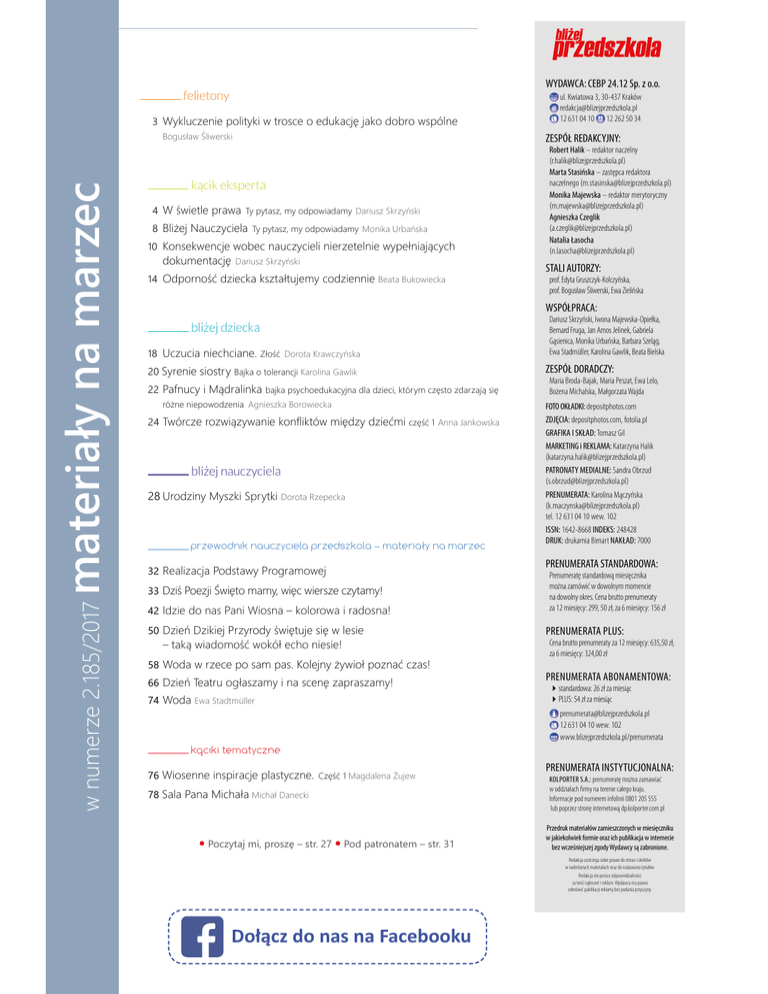 WYDAWCA: CEBP 24.12 Sp. z o.o. felietony 3 Wykluczeniepolitykiwtrosceoedukacjęjakodobrowspólne w numerze 2.185/2017 materiały na marzec BogusławŚliwerski ZESPÓŁ REDAKCYJNY: kącik eksperta 4 Wświetleprawa Ty pytasz, my odpowiadamy DariuszSkrzyński 8 BliżejNauczyciela Ty pytasz, my odpowiadamy MonikaUrbańska 10 Konsekwencjewobecnauczycielinierzetelniewypełniających dokumentację ul. Kwiatowa 3, 30-437 Kraków [email protected] 12 631 04 10 12 262 50 34 DariuszSkrzyński 14 OdpornośćdzieckakształtujemycodziennieBeata Bukowiecka Robert Halik – redaktor naczelny ([email protected]) Marta Stasińska – zastępca redaktora naczelnego ([email protected]) Monika Majewska – redaktor merytoryczny ([email protected]) Agnieszka Czeglik ([email protected]) Natalia Łasocha ([email protected]) STALI AUTORZY: prof. Edyta Gruszczyk-Kolczyńska, prof. Bogusław Śliwerski, Ewa Zielińska WSPÓŁPRACA: bliżej dziecka 18 Uczucianiechciane.Złość DorotaKrawczyńska 20 Syrenie siostry Bajka o tolerancji Karolina Gawlik 22 PafnucyiMądralinkabajkapsychoedukacyjnadladzieci,którymczęstozdarzająsię różneniepowodzenia Agnieszka Borowiecka 24 Twórczerozwiązywaniekonfliktówmiędzydziećmiczęść1 Anna Jankowska bliżej nauczyciela 28 Urodziny Myszki Sprytki Dorota Rzepecka przewodnik nauczyciela przedszkola – materiały na marzec 32 Realizacja Podstawy Programowej 33 DziśPoezjiŚwiętomamy,więcwierszeczytamy! 42 IdziedonasPaniWiosna–kolorowairadosna! 50 DzieńDzikiejPrzyrodyświętujesięwlesie –takąwiadomośćwokółechoniesie! 58 Wodawrzeceposampas.Kolejnyżywiołpoznaćczas! 66 DzieńTeatruogłaszamyinascenęzapraszamy! 74 Woda Ewa Stadtmüller Dariusz Skrzyński, Iwona Majewska-Opiełka, Bernard Fruga, Jan Amos Jelinek, Gabriela Gąsienica, Monika Urbańska, Barbara Szeląg, Ewa Stadmüller, Karolina Gawlik, Beata Bielska ZESPÓŁ DORADCZY: Maria Broda-Bajak, Maria Peszat, Ewa Lelo, Bożena Michalska, Małgorzata Wajda FOTO OKŁADKI: depositphotos.com ZDJĘCIA: depositphotos.com, fotolia.pl GRAFIKA I SKŁAD: Tomasz Gil MARKETING i REKLAMA: Katarzyna Halik ([email protected]) PATRONATY MEDIALNE: Sandra Obrzud ([email protected]) PRENUMERATA: Karolina Mączyńska ([email protected]) tel. 12 631 04 10 wew. 102 ISSN: 1642-8668 INDEKS: 248428 DRUK: drukarnia Bimart NAKŁAD: 7000 PRENUMERATA STANDARDOWA: Prenumeratę standardową miesięcznika można zamówić w dowolnym momencie na dowolny okres. Cena brutto prenumeraty za 12 miesięcy: 299, 50 zł, za 6 miesięcy: 156 zł PRENUMERATA PLUS: Cena brutto prenumeraty za 12 miesięcy: 635,50 zł, za 6 miesięcy: 324,00 zł PRENUMERATA ABONAMENTOWA: standardowa: 26 zł za miesiąc PLUS: 54 zł za miesiąc [email protected] 12 631 04 10 wew. 102 www.blizejprzedszkola.pl/prenumerata kąciki tematyczne 76 Wiosenne inspiracje plastyczne. Część1MagdalenaŻujew 78 SalaPanaMichała MichałDanecki ● Poczytaj mi, proszę – str. 27 ● Pod patronatem – str. 31 PRENUMERATA INSTYTUCJONALNA: KOLPORTER S.A.: prenumeratę można zamawiać w oddziałach firmy na terenie całego kraju. Informacje pod numerem infolinii 0801 205 555 lub poprzez stronę internetową dp.kolporter.com.pl Przedruk materiałów zamieszczonych w miesięczniku w jakiekolwiek formie oraz ich publikacja w internecie bez wcześniejszej zgody Wydawcy są zabronione. Redakcja zastrzega sobie prawo do zmian i skrótów w nadesłanych materiałach oraz do nadawania tytułów. Redakcja nie ponosi odpowiedzialności za treść ogłoszeń i reklam. Wydawca ma prawo odmówić publikacji reklamy bez podania przyczyny. Dołącz do nas na Facebooku