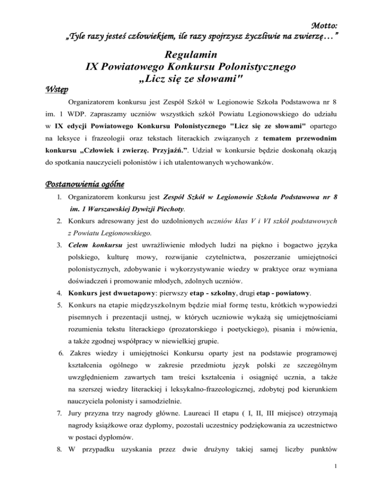 Motto: „Tyle razy jesteś człowiekiem, ile razy spojrzysz życzliwie na zwierzę…” Regulamin IX Powiatowego Konkursu Polonistycznego „Licz się ze słowami" Wstęp Organizatorem konkursu jest Zespół Szkół w Legionowie Szkoła Podstawowa nr 8 im. 1 WDP. Zapraszamy uczniów wszystkich szkół Powiatu Legionowskiego do udziału w IX edycji Powiatowego Konkursu Polonistycznego "Licz się ze słowami" opartego na leksyce i frazeologii oraz tekstach literackich związanych z tematem przewodnim konkursu „Człowiek i zwierzę. Przyjaźń.”. Udział w konkursie będzie doskonałą okazją do spotkania nauczycieli polonistów i ich utalentowanych wychowanków. Postanowienia ogólne 1. Organizatorem konkursu jest Zespół Szkół w Legionowie Szkoła Podstawowa nr 8 im. 1 Warszawskiej Dywizji Piechoty. 2. Konkurs adresowany jest do uzdolnionych uczniów klas V i VI szkół podstawowych z Powiatu Legionowskiego. 3. Celem konkursu jest uwrażliwienie młodych ludzi na piękno i bogactwo języka polskiego, kulturę mowy, rozwijanie czytelnictwa, poszerzanie umiejętności polonistycznych, zdobywanie i wykorzystywanie wiedzy w praktyce oraz wymiana doświadczeń i promowanie młodych, zdolnych uczniów. 4. Konkurs jest dwuetapowy: pierwszy etap - szkolny, drugi etap - powiatowy. 5. Konkurs na etapie międzyszkolnym będzie miał formę testu, krótkich wypowiedzi pisemnych i prezentacji ustnej, w których uczniowie wykażą się umiejętnościami rozumienia tekstu literackiego (prozatorskiego i poetyckiego), pisania i mówienia, a także zgodnej współpracy w niewielkiej grupie. 6. Zakres wiedzy i umiejętności Konkursu oparty jest na podstawie programowej kształcenia ogólnego w zakresie przedmiotu język polski ze szczególnym uwzględnieniem zawartych tam treści kształcenia i osiągnięć ucznia, a także na szerszej wiedzy literackiej i leksykalno-frazeologicznej, zdobytej pod kierunkiem nauczyciela polonisty i samodzielnie. 7. Jury przyzna trzy nagrody główne. Laureaci II etapu ( I, II, III miejsce) otrzymają nagrody książkowe oraz dyplomy, pozostali uczestnicy podziękowania za uczestnictwo w postaci dyplomów. 8. W przypadku uzyskania przez dwie drużyny takiej samej liczby punktów 1 przeprowadzona zostanie dogrywka. 9. Ogłoszenie wyników i rozdanie nagród odbędzie się w siedzibie Szkoły Podstawowej nr 8 w Legionowie, w maju 2015 r. podczas uroczystości podsumowania osiągnięć uczniów. O dokładnym terminie zostaną Państwo poinformowani. 10. Koszty przygotowania i dojazdu pokrywają uczestnicy. 11. Uczestnicy zobowiązani są do przedstawienia zgody rodziców/prawnych opiekunów na udział w konkursie i publikację wizerunku na stronie internetowej Szkoły Podstawowej nr 8. I etap szkolny 1. Przygotowuje go i przeprowadza Komisja Szkolna powołana przez Dyrektora Szkoły. 2. Celem tego etapu jest wyłonienie trzech najlepszych uczniów, którzy będą reprezentować szkołę w II etapie konkursu. 3. Prace uczniów sprawdza i ocenia Komisja Szkolna wg ustalonych przez siebie kryteriów. 4. Komisja Szkolna kwalifikuje do II etapu konkursu trzech uczniów, którzy otrzymają największą liczbę punktów; ewentualnie osobę rezerwową. 5. Eliminacje I etapu konkursu należy przeprowadzić do dnia 18 grudnia 2014 r. 6. Z przeprowadzonych eliminacji należy sporządzić protokół. 7. Szkoły zgłaszają reprezentantów do organizatora konkursu powiatowego do dnia 9 stycznia 2015 r., telefonicznie lub faksem ( 0-22) 774-59-50. II etap międzyszkolny (powiatowy) 1. Etap powiatowy przygotowuje i przeprowadza Komisja powołana przez Dyrektora Szkoły Podstawowej nr 8 w Zespole Szkół w Legionowie przy ulicy Zegrzyńskiej 3. 2. W skład Komisji Konkursowej wchodzą nauczyciele języka polskiego ze szkół biorących udział w konkursie ( liczba członków komisji uzależniona jest od liczby zgłoszonych zespołów) oraz Dyrektor Zespołu Szkół. Przewodniczącym komisji jest wicedyrektor ze Szkoły Podstawowej nr 8 w Legionowie. 3. Zadania przygotowuje organizator konkursu po konsultacjach z nauczycielami języka polskiego zainteresowanych szkół.. 4. Eliminacje II etapu konkursu odbędą się 4 marca 2015 r., o godzinie 900 w Szkole Podstawowej nr 8 w Zespole Szkół w Legionowie przy ulicy Zegrzyńskiej 3. 5. Czas trwania II etapu wynosi 120 minut. 6. Prace uczniów sprawdza i ocenia Komisja wg kryteriów ustalonych przez organizatora konkursu. 7. W przypadku wątpliwości decydujący głos należy do Przewodniczącego Komisji. 8. Z przeprowadzonego konkursu będzie sporządzony protokół zbiorczy. 9. Weryfikacja prac wyłącznie w dniu konkursu. Uczestnicy II etapu powinni zabrać ze sobą legitymację szkolną, przybory do pisania oraz obuwie na zmianę. Prosimy również o wypełnienie druku załączonej zgody rodziców/prawnych opiekunów na publikację danych osobowych i wizerunku ucznia. 2 Zakres wiedzy i umiejętności wymaganych w IX edycji konkursu: Przygotowania do konkursu powinny być oparte o utwory literackie i dzieła malarskie, zawierające motywy przyjaźni między człowiekiem a zwierzęciem, a także zasób frazeologiczny (paremiologiczny) związany z hasłem przewodnim konkursu. Uczestnik konkursu: 1. Potrafi wykazać się wiedzą i umiejętnościami, które obejmuje „Podstawa programowa kształcenia ogólnego” w zakresie przedmiotu język polski oraz szerszą wiedzą pozaszkolną. 2. Umie zredagować wypowiedź pisemną zgodną ze wskazanym tematem ( w edycji bieżącej opowiadanie z opisem oraz krótkie formy użytkowe, np. ogłoszenie, argumentacje, itp.) oraz przygotować spójną prezentację ustną o właściwej kompozycji. 3. Posługuje się bogatym językiem literackim, zna i stosuje przysłowia oraz frazeologizmy zgodnie z ich znaczeniem, ma bogaty zasób synonimiczny związany z tematem, tworzy prawidłowo formy pokrewne, prezentuje wiedzę zdobytą samodzielnie. Rozpoznaje i samodzielnie tworzy środki stylistyczne. 4. Jest 