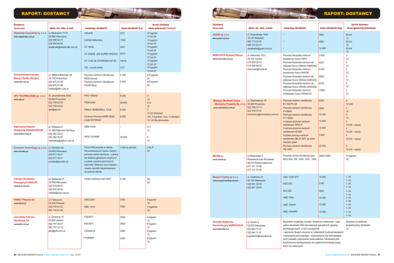RAPORT: DOSTAWCY RAPORT: DOSTAWCY Dostawca strona www adres, tel., faks, e-mail: Abplanalp Consulting sp. z o.o. ul. Marconich 11/10 www.abplanalp.com.pl 02-954 Warszawa 022 858 94 78 022 642 85 56 [email protected] Andrychowska Fabryka Maszyn Spółka Akcyjna www.afm.com.pl APX TECHNOLOGIE sp. z o.o. www.apx.pl Dąbrowska Fabryka Obrabiarek PONAR-DEFUM www.defum.com.pl nazwa/typ obrabiarki: VM-2HE masa obrabiarki [kg]: 3311 SUPER MINI MILL 1540 VF-1DHE 3221 VF-3SSHE (SS-SUPER SPEED) 5670 termin dostawy/ okres gwarancji [miesiące]: 14 tygodni 12 lub 24 14 tygodni 12 lub 24 14 tygodni 12 lub 24 14 tygodni 12 lub 24 14 tygodni 12 lub 24 14 tygodni 12 lub 24 VF-11HE ZE STOŻKIEM ISO 50 14016 VM – mould maker 3311 ul. Stefana Batorego 35 34-120 Andrychów 033 875 01 00 033 875 01 09 [email protected] Pionowe Centrum Obróbkowe R550 Harnaś Pionowe Centrum Obróbkowe R1000 Baca 3 300 Al. Jerozolimskie 424A 05-800 Pruszków 022 759 62 00 022 759 63 44 [email protected] PRO-1000AP 6 000 PRW-4340 59 000 FANUC ROBODRILL T21iE 2 000 Centrum Pionowe MORI SEIKI model NV5000a1 6 350 DBM-105N – 6–7 12 WFS-130 NMP 35 000 9 12 ul. Kolejowa 8 41-300 Dąbrowa Górnicza 032 262 20 41 032 262 33 67 [email protected] 4 000 3 12 4–5 12 3 12 lub 24(opcja) min. 2 tygodnie, max. 3 miesiące 12 i 24 dla sterowania Firma AXA posiada w ofercie 7 000 do 48 000 48 podstawowych typów maszyn – pionowe centra obróbcze , z jedną lub dwiema głowicami uchylnymi, w wersji z jezdną kolumną lub bramowe. Maszyny są w zaawansowany sposób dopasowywane do potrzeb klienta. 3 do 8 24 Fabryka Obrabiarek Precyzyjnych AVIA SA ul. Siedlecka 47 03-768 Warszawa 022 619 90 81 022 818 29 54 [email protected] Centra obróbcze serii VMC bd. bd. ul. Fabryczna 63-300 Pleszew 062 742 81 02 062 742 81 06 DMC 635V 3700 8 tygodni 18 DMC 103V 7900 4 tygodnie 18 ul. Zaciszna 14 63-200 Jarocin 062 747 26 01 062 747 27 15 [email protected] FNS45TI 2500 FNU50TI 2600 6 tygodni 12 6 tygodni 12 FXR40CJ2 3500 FYN50ND 4500 www.avia.com.pl FAMOT Pleszew SA www.famot.pl Jarocińska Fabryka Obrabiarek SA www.jafo.com.pl 20 DESIGN NEWS Polska [www.designnews.pl] luty 2006 strona www JAZON sp z o.o. www.jazon.com.pl MARCOSTA Ryszard Starzec www.marcosta.com.pl adres, tel., faks, e-mail: masa obrabiarki [kg]: – 3800 – 5500 – 14 000 ul. Klikowska 101c 33-102 Tarnów 014 630 05 47 014 626 68 52 [email protected] 3 400 Pionowe frezarskie centrum obróbkowe Hurco VMX1 Pionowe frezarskie centrum ob4200 róbkowe Hurco VMX24 (VMX24S) 4 450 Pionowe frezarskie centrum obróbkowe Hurco VMX30 Pionowe frezarskie centrum ob6400 róbkowe Hurco VMX42 (VMX42S) 9100 Pionowe frezarskie centrum obróbkowe Hurco VMX50 (VMX50S) Pionowe frezarskie centrum 13600 obróbkowe Hurco VMX64 50 ul. Sienkiewicza 19 Maszyny Obrabiarki Centra – Mechanicy Pruszków Sp. z o.o. 05-800 Pruszków 022 758 74 13 www.mechanicy.com.pl 022 758 76 97 [email protected] MEXIM sc. www.mexim.pl 6 tygodni 12 6 tygodni 12 nazwa/typ obrabiarki: ul. Wysockiego 164A 15-167 Białystok 085 719 42 45 085 743 64 31 [email protected] 4-6 tygodni 24 4-6 tygodni 24 European Technology sp. z o.o. ul. Irlandzka 9a 03-909 Warszawa www.eurotec.pl 022 617 46 41 022 617 46 41 [email protected] 5 300 Dostawca Mexpol-Trading sp z o o www.mexpol-trading.waw.pl Ośrodek Badawczo Konstrukcyjny KOPROTECH www.koprotech.pl termin dostawy/ okres gwarancji [miesiące]: 90 dni 12 90 dni 12 90 dni 12 3 12 3 12 3 12 3 12 3 12 3 12 Pionowe centrum obróbkowe EV 520 PLUS 6300 4 12 (24) Pionowe centrum obróbkowe FV-580A Pionowe centrum obróbkowe FV-1600A 4-osiowe poziome centrum obróbkowe HP63 P 4-osiowe poziome centrum obróbkowe HZ-500 Szybkie pionowe centrum obróbkowe QM 22 APC ze zmieniaczem palet Pionowe centrum obróbkowe VB-1000 3000 4 12 4 12 4 12 (24 – opcja) 4 12 (24 – opcja) ul.Piastowska 2 Radwanice koło Wrocławia 55-010 Święta Katarzyna 071 311 73 38 071 311 73 38 ul. Chełmska 21 00-724 Warszawa 022 841 39 03 022 841 38 84 ul. Suwak 4 02-676 Warszawa 022 843 74 31 022 843 11 37 [email protected] 12 000 10 000 16 000 3 800 4 12 (24 – opcja) 22 000 4 12 (24 – opcja) Pionowe centra obróbkowe typu MCV 500, 750, 1000, 1270 , 1450 3800/11000 12 tygodni 18 VMC 1500 XP3 10 000 HSC 500 3180 1–16 1–16 1–16 1–16 5AX 500 9000 HMC 700e 13 000 HMC 700HP 13 000 HMC 700HPD 13 000 Koprotech projektuje, buduje i dostarcza zadaniowe – specjalne obrabiarki CNC dla realizacji specjalnych operacji technologicznych, w tym szczególnie: • wiercenia długich otworów w materiałach trudnoskrawalnych • wytaczania precyzyjnego • wykonywanie baz technologicznych (nakiełki, planowanie czoła wałków). Obrabiarka jest każdorazowo konfigurowana do zadania technologicznego, które ma realizować. 1–16 1–16 1–16 1–16 1–16 1–16 1–16 1–16 Zależnie od wielkości projektowanej obrabiarki 12 [www.designnews.pl] DESIGN NEWS Polska 21