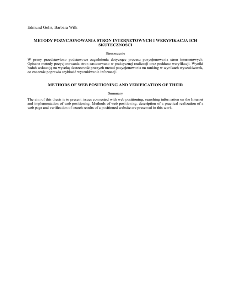 Edmund Golis, Barbara Wilk METODY POZYCJONOWANIA STRON INTERNETOWYCH I WERYFIKACJA ICH SKUTECZNOŚCI Streszczenie W pracy przedstawiono podstawowe zagadnienia dotyczące procesu pozycjonowania stron internetowych. Opisane metody pozycjonowania stron zastosowano w praktycznej realizacji oraz poddano weryfikacji. Wyniki badań wskazują na wysoką skuteczność prostych metod pozycjonowania na ranking w wynikach wyszukiwarek, co znacznie poprawia szybkość wyszukiwania informacji. METHODS OF WEB POSITIONING AND VERIFICATION OF THEIR Summary The aim of this thesis is to present issues connected with web positioning, searching information on the Internet and implementation of web positioning. Methods of web positioning, description of a practical realization of a web page and verification of search results of a positioned website are presented in this work.