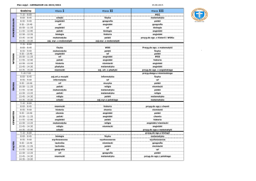 Plan zajęć - GIMNAZJUM rok 2015/2016 19.09.2015 Klasa I Klasa II Klasa III 8:00 - 8:45 włoski fizyka matematyka Godziny PONIEDZIAŁEK 7:15 - 8:00 WDZ 8:55 - 9:40 angielski geografia polski 9:55 - 10:40 wf angielski geografia 10:50 - 11:35 angielski wf biologia 11:55 - 12:40 polski biologia angielski 12:50 - 13:35 biologia historia angielski 13:45 - 14:30 matematyka polski przyg.do egz. z historii i WOSu 14:35 - 15:20 zaj. wyr. z matematyki zaj.wyr. z matematyki WTOREK 7:15 - 8:00 8:00 - 8:45 fizyka WOS Przyg,do egz. z matematyki 8:55 - 9:40 9:55 - 10:40 10:50 - 11:35 matematyka angielski wf polski wf angielski fizyka polski WOS 11:55 - 12:40 polski angielski historia 12:50 - 13:35 historia niemiecki angielski 13:45 - 14:30 plastyka matematyka angielski 14:35 - 15:20 niemiecki zaj. art. z plastyki przyg.do egz. z angielskiego 8:00 - 8:45 zaj.art.z muzyki informatyka 8:55 - 9:40 informatyka wf wf 9:55 - 10:40 wf muzyka polski niemiecki ŚRODA 7:15-7:55 przyg.doegz.z niemieckiego fizyka 10:50 - 11:35 polski religia 11:55 - 12:40 matematyka matematyka polski 12:50 - 13:35 polski matematyka religia 13:45 - 14:30 religia polski matematyka 14:35 - 15:20 włoski zaj.wyr.z polskiego matematyka 8:00 - 8:45 niemiecki historia przyg.do egz.z chemii 8:55 - 9:40 historia chemia niemiecki 9:55 - 10:40 chemia angielski polski 10:50 - 11:35 polski angielski chemia CZWARTEK 7:15 - 8:00 11:55 - 12:40 angielski polski historia 12:50 - 13:35 matematyka religia angielski/niemiecki 13:45 - 14:30 religia niemiecki 14:35 - 15:20 włoski 7:15 - 8:00 PIĄTEK angielski przyg.do egz.z matematyki przyg.do egz.z biologii 8:00 - 8:45 biologia fizyka matematyka 8:55 - 9:40 wychowawcza wychowawcza wychowawcza 9:55 - 10:40 technika niemiecki geografia 10:50 - 11:35 technika polski niemiecki 11:55 - 12:40 geografia wf wf 12:50 - 13:35 wf geografia polski 13:45 - 14:30 niemiecki matematyka przyg.do egz.z polskiego 14:35 - 15:20 `