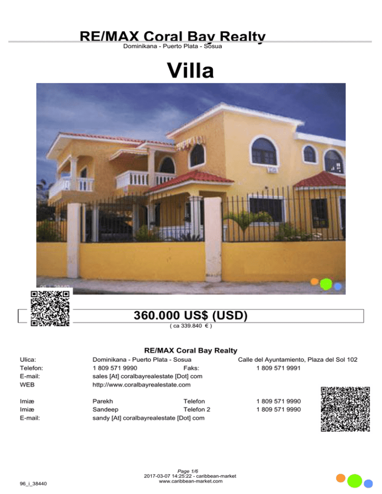 RE/MAX Coral Bay Realty Dominikana - Puerto Plata - Sosua Villa Poùoýenie obiektu : Dominikana - Puerto Plata - S.F.d. Puerto Plata 360.000 US$ (USD) ( ca 339.840 € ) RE/MAX Coral Bay Realty Ulica: Telefon: E-mail: WEB Dominikana - Puerto Plata - Sosua 1 809 571 9990 Faks: sales [At] coralbayrealestate [Dot] com http://www.coralbayrealestate.com Imiæ Imiæ E-mail: Parekh Telefon Sandeep Telefon 2 sandy [At] coralbayrealestate [Dot] com 96_i_38440 Page 1/6 2017-03-07 14:25:22 - caribbean-market www.caribbean-market.com Calle del Ayuntamiento, Plaza del Sol 102 1 809 571 9991 1 809 571 9990 1 809 571 9990 RE/MAX Coral Bay Realty Dominikana - Puerto Plata - Sosua Numer kodu Typ budynku Poùoýenie Materiaùy Property Address 96_i_38440 Villa Zakaz wjazdu Zakaz wjazdu Numer kodu Nr referencyjny Status objektet Rok natychmiast potrzebne Powierzchnia dziaùki Firma Ýycie Kuchnia Sypialnie Zùy Opinie Toaleta 609 m2 Powierzchnia 407 m2 1 1 4 4 Biznes Inne Usùugi Garaý Carport zadaszony taras 1 Akcesoria Dzierýawa Taras Balkon Jetty Pokój Party Klimatyzacja Resort Ogród Pralnia Goràcy zadaszony taras ogrodzony / murem 96_i_38440 Page 2/6 2017-03-07 14:25:22 - caribbean-market www.caribbean-market.com RE/MAX Coral Bay Realty Dominikana - Puerto Plata - Sosua 96_i_38440 Page 3/6 2017-03-07 14:25:22 - caribbean-market www.caribbean-market.com RE/MAX Coral Bay Realty Dominikana - Puerto Plata - Sosua 96_i_38440 Page 4/6 2017-03-07 14:25:22 - caribbean-market www.caribbean-market.com RE/MAX Coral Bay Realty Dominikana - Puerto Plata - Sosua 96_i_38440 Page 5/6 2017-03-07 14:25:22 - caribbean-market www.caribbean-market.com RE/MAX Coral Bay Realty Dominikana - Puerto Plata - Sosua 96_i_38440 Page 6/6 2017-03-07 14:25:22 - caribbean-market www.caribbean-market.com