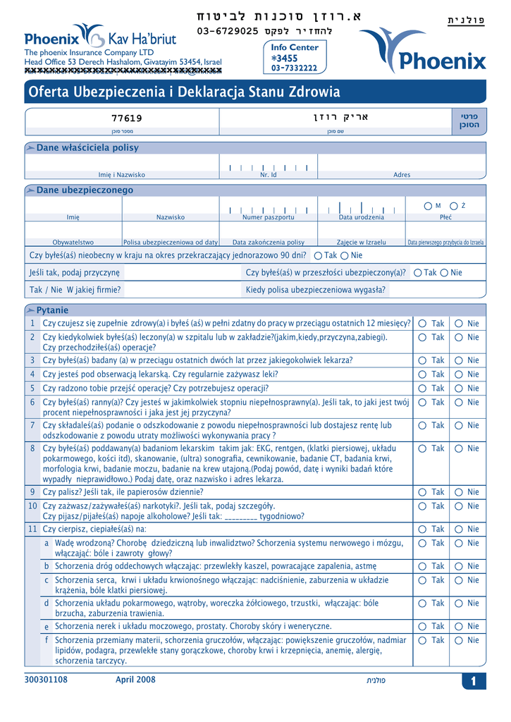 רוזן סוכנות לביטוח.א פולנית 03 6729025 להחזיר לפקס Info Center The phoenix Insurance Company LTD Head Office 53 Derech Hashalom, Givatayim 53454, Israel xxxxxxxxxxxxxxxxxxxxxxxxxxxxxxxx Fax Number: 03-5735222 | www.fnx.co.il | [email protected] Oferta Ubezpieczenia i Deklaracja Stanu Zdrowia אריק רוזן 77619 מספר סוכן פרטי הסוכן שם סוכן Dane właściciela polisy Imię i Nazwisko Nr. Id Adres Dane ubezpieczonego Imię Nazwisko Numer paszportu Data urodzenia Obywatelstwo Polisa ubezpieczeniowa od daty Data zakończenia polisy Zajęcie w Izraelu Czy byłeś(aś) nieobecny w kraju na okres przekraczający jednorazowo 90 dni? Tak Nie Jeśli tak, podaj przyczynę Czy byłeś(aś) w przeszłości ubezpieczony(a)? Tak / Nie W jakiej firmie? Kiedy polisa ubezpieczeniowa wygasła? M Płeć Data pierwszego przybycia do Izraela Pytanie 1 Czy czujesz się zupełnie zdrowy(a) i byłeś (aś) w pełni zdatny do pracy w przeciągu ostatnich 12 miesięcy? 2 Czy kiedykolwiek byłeś(aś) leczony(a) w szpitalu lub w zakładzie?(jakim,kiedy,przyczyna,zabiegi). Czy przechodziłeś(aś) operacje? 3 Czy byłeś(aś) badany (a) w przeciągu ostatnich dwóch lat przez jakiegokolwiek lekarza? 4 Czy jesteś pod obserwacją lekarską. Czy regularnie zażywasz leki? 5 Czy radzono tobie przejść operację? Czy potrzebujesz operacji? 6 Czy byłeś(aś) ranny(a)? Czy jesteś w jakimkolwiek stopniu niepełnosprawny(a). Jeśli tak, to jaki jest twój procent niepełnosprawności i jaka jest jej przyczyna? 7 Czy składaleś(aś) podanie o odszkodowanie z powodu niepełnosprawności lub dostajesz rentę lub odszkodowanie z powodu utraty możliwości wykonywania pracy ? 8 Czy byłeś(aś) poddawany(a) badaniom lekarskim takim jak: EKG, rentgen, (klatki piersiowej, układu pokarmowego, kości itd), skanowanie, (ultra) sonografia, cewnikowanie, badanie CT, badania krwi, morfologia krwi, badanie moczu, badanie na krew utajoną.(Podaj powód, datę i wyniki badań które wypadły nieprawidłowo.) Podaj datę, oraz nazwisko i adres lekarza. 9 Czy palisz? Jeśli tak, ile papierosów dziennie? 10 Czy zażwasz/zażywałeś(aś) narkotyki?. Jeśli tak, podaj szczegóły. Czy pijasz/pijałeś(aś) napoje alkoholowe? Jeśli tak: _________ tygodniowo? 11 Czy cierpisz, ciepiałeś(aś) na: a Wadę wrodzoną? Chorobę dziedziczną lub inwalidztwo? Schorzenia systemu nerwowego i mózgu, włączająć: bóle i zawroty głowy? b Schorzenia dróg oddechowych włączając: przewlekły kaszel, powracające zapalenia, astmę c Schorzenia serca, krwi i układu krwionośnego włączając: nadciśnienie, zaburzenia w układzie krążenia, bóle klatki piersiowej. d Schorzenia układu pokarmowego, wątroby, woreczka żółciowego, trzustki, włączając: bóle brzucha, zaburzenia trawienia. e Schorzenia nerek i układu moczowego, prostaty. Choroby skóry i weneryczne. f Schorzenia przemiany materii, schorzenia gruczołów, włączając: powiększenie gruczołów, nadmiar lipidów, podagra, przewlekłe stany gorączkowe, choroby krwi i krzepnięcia, anemię, alergię, schorzenia tarczycy. 300301108 April 2008 פולנית Ż Tak Nie Tak Nie Tak Nie Tak Nie Tak Tak Tak Nie Nie Nie Tak Nie Tak Nie Tak Nie Tak Nie Tak Nie Tak Nie Tak Nie Tak Tak Tak Tak Nie Nie Nie Nie 1 g Schorzenia stawów i kości, układu kostnego i mięśni, włączając: bóle pleców i szyi, obrzęki, opuchlizny. h Ciężkie choroby włączając: raka (choroba nowotworowa), cukrzycę, zaburzenia psychiczne, niewydolność serca, schorzenia wątroby, nerek, zaburzenia układu immunologicznego, zaburzenia krzepliowości krwi, inne ciężkie choroby. i Schorzenia oczu, wady wzroku. Choroby laryngologiczne, zapalenia zatok, zaburzenia słuchu. Tak Nie Tak Nie Tak Nie Tak j Bóle chroniczne organów wyżej nie wymienionych. Tak k Przepuklina pachwinowa, brzuszna. 12 Choroby ginekologiczne, włączająć: zaburzenia miesiączkowania, krwawienia, schorzenia macicy, jajników, choroby piersi włączając guzy piersi badania na wykrycie raka: memografia, badanie cytologiczne (szyjki macicy) Czy przechodziłaś cesarskie cięcie? Czy jesteś w ciąży? 13 Wzrost _____ Waga_____ Czy w przeciągu ostatnich 12 miesięcy zmieniła się Twoja waga o więcej niż 5 kg.? Tak Tak Nie Nie Nie Nie Jeśli jedna z odpowiedzi jest pozytyna, proszę wyszczególnić po angielsku Wyszczególnienie do pytania Nr. Wyszczególnienie do pytania Nr. 1. Nazwa choroby lub jej opis 1. 1. 2. Badania i zabiegi które przeszedłeś(aś) w związku z chorobą 3. Jeśli zażywasz leki, podaj rodzaj i ilość 2. 2. 3. 3. 4. Czy byłeś(aś) poddany(a) leczeniu szpitalnemu? Jak długo? W Izraelu czy za granicą? 4. 4. 5. Data początku choroby 5. 5. 6. Czy wyzdrowiałeś(aś)? 6. 6. ******Jeśli nie ma miejsca – wyszczególnij na drugiej stronie kartki i na końcu podpisz się (po angielsku lub polsku) Zwolnienie z obowiązku zachowania tajemnicy lekarskiej Ja, niżej podpisany, wyrażam zgodę aby kasa chorych i/lub placówki medyczne kasy chorych jak i wszystkie inne placówki medyczne, spitale i/lub każda firma ubezpieczeniowa i/lub każdy urząd podały firmie ubezpieczeniowej Phoenix zwanych dalej "Pytający", wszytkie dane medyczne, bez żadnych wyjątków dotyczące stanu mojego zdrowia, chorób na które chorowałem(am) i/lub na które choruję i/lub na które będę chorował(a). Dane te mają być przekazane w takiej formie o którą zwróci się "pytający". Niniejszym zwalniam wszystkie czynniki do których "pytający" zwróci się, z obowiązku utrzymywania tajemnicy lekarskiej i zrzekam się jej na rzecz "pytającego". Niniejsze orzeczenie obowiązuje mnie, moich spadkobierców jak również pełnomocników.prawnych i każdego, który mnie zastąpi. Swoim podpisem wyrażam zgodę na dodatki lub odstępstwa medyczne powstałe na skutek problemów zdrowotnych które zaczęły się przed ubezpieczeniem mnie ninejszą polisą. Jak również wy