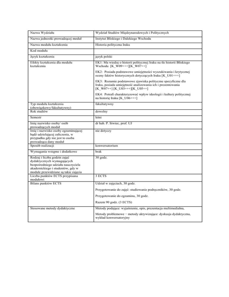 Nazwa Wydziału Wydział Studiów Międzynarodowych i Politycznych Nazwa jednostki prowadzącej moduł Instytut Bliskiego i Dalekiego Wschodu Nazwa modułu kształcenia Historia polityczna Iraku Kod modułu Język kształcenia język polski Efekty kształcenia dla modułu kształcenia EK1: Ma wiedzę o historii politycznej Iraku na tle historii Bliskiego Wschodu [K_W09+++][K_W07++] EK2: Posiada podstawowe umiejętności wyszukiwania i krytycznej oceny faktów historycznych dotyczących Iraku [K_U01+++] EK3: Rozumie podstawowe zjawiska polityczne specyficzne dla Iraku, posiada umiejętność analizowania ich i prezentowania [K_W07++] [K_U03+++][K_U05++] EK4: Potrafi charakteryzować wpływ ideologii i kultury politycznej na historię Iraku [K_U06+++] Typ modułu kształcenia (obowiązkowy/fakultatywny) Rok studiów fakultatywny Semestr letni Imię nazwisko osoby/ osób prowadzących moduł Imię i nazwisko osoby egzaminującej bądź udzielającej zaliczenia, w przypadku gdy nie jest to osoba prowadząca dany moduł Sposób realizacji dr hab. P. Siwiec, prof. UJ Wymagania wstępne i dodatkowe brak Rodzaj i liczba godzin zajęć dydaktycznych wymagających bezpośredniego udziału nauczyciela akademickiego i studentów, gdy w module przewidziane są takie zajęcia Liczba punktów ECTS przypisana modułowi Bilans punktów ECTS 30 godz. dowolny nie dotyczy konwersatorium 3 ECTS Udział w zajęciach, 30 godz. Przygotowanie do zajęć: studiowanie podręczników, 30 godz. Przygotowanie do egzaminu, 30 godz. Razem 90 godz. (3 ECTS) Stosowane metody dydaktyczne Metody podające: wyjaśnienie, opis, prezentacja multimedialna, Metody problemowe − metody aktywizujące: dyskusja dydaktyczna, wykład konwersatoryjny Metody sprawdzania i kryteria oceny efektów kształcenia uzyskanych przez studentów Forma i warunki zaliczenia modułu, w tym zasady dopuszczenia do egzaminu, zaliczenia, a także forma i warunki zaliczenia poszczególnych zajęć wchodzących w zakres danego modułu Treści modułu kształcenia Wykaz literatury podstawowej i uzupełniającej, obowiązującej do zaliczenia danego modułu EK1, EK2, EK3, EK4 – egzamin końcowy w formie testu z pytaniami otwartymi i zamkniętymi. Warunkiem zaliczenia kursu jest udział w zajęciach oraz uzyskanie pozytywnej oceny z egzaminu końcowego. 1. Irak pod panowaniem tureckim na przełomie XIX i XX w. 2. Mandat brytyjski i okres monarchii. 3. Od rewolucji 14 lipca 1958 do rewolucji 17 lipca 1968. 4. Irak pod rządami partii Baas: - okres prezydentury Ahmada Hasana al-Bakra, - rządy Saddama Husajna (czasy wojny iracko-irańskiej, agresja na Kuwejt i jej następstwa). 5. Instytucje państwa irackiego na tle porównawczym. 6. Społeczeństwo irackie w państwie autorytarnym. 7. Interwencja amerykańska w 2003 r. i okupacja Iraku. 8. Okres po zakończeniu rządów CPA i przekazaniu władzy Irakijczykom. 9. Okres rządów Nuriego al-Malikiego. 10. Irak a tzw. „wiosna arabska”. 11. W cieniu tzw. Państwa Islamskiego. Literatura podstawowa: 1. Marek M. Dziekan, Historia Iraku, Warszawa 2007. 2. Marek M. Dziekan, Irak. Religia i polityka, Warszawa 2005. 3. Hasan Ali Jamsheer, Współczesna historia Iraku, Warszawa 2007. 4. Nowy Irak w perspektywie budowania demokratycznego państwa federacyjnego, praca zbiorowa pod red. Adnana Abbasa, Poznań 2006. Literatura uzupełniająca: 1. H. Królikowski, Cz. Marcinkowski, Irak 2003, Warszawa 2003. 2. http://govinfo.library.unt.edu/cpa-iraq/regulations/. 3. Jerzy Zdanowski, Historia Bliskiego Wschodu w XX wieku, Wrocław 2010. 4. Jerzy Zdanowski, Stosunki międzynarodowe na Bliskim Wschodzie w XX w., Kraków 2011 5. Jerzy Zdanowski, Historia społeczeństw muzułmańskiego Bliskiego Wschodu w XX wieku, Warszawa 2013. 6. Kurdowie i Kurdystan iracki na przełomie XX I XXI wieku, praca zbiorowa pod red. Adnana Abbasa i Pawła Siwca, Poznań 2009. Wymiar, zasady i forma odbywania praktyk, w przypadku gdy program kształcenia przewiduje praktyki Brak