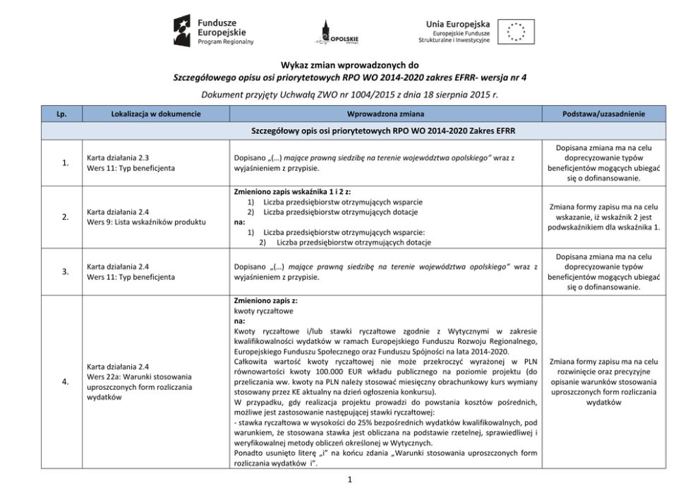 Wykaz zmian wprowadzonych do Szczegółowego opisu osi priorytetowych RPO WO 2014-2020 zakres EFRR- wersja nr 4 Dokument przyjęty Uchwałą ZWO nr 1004/2015 z dnia 18 sierpnia 2015 r. Lp. Lokalizacja w dokumencie Wprowadzona zmiana Podstawa/uzasadnienie Szczegółowy opis osi priorytetowych RPO WO 2014-2020 Zakres EFRR Karta działania 2.3 Wers 11: Typ beneficjenta Dopisano „(…) mające prawną siedzibę na terenie województwa opolskiego” wraz z wyjaśnieniem z przypisie. Dopisana zmiana ma na celu doprecyzowanie typów beneficjentów mogących ubiegać się o dofinansowanie. 2. Karta działania 2.4 Wers 9: Lista wskaźników produktu Zmieniono zapis wskaźnika 1 i 2 z: 1) Liczba przedsiębiorstw otrzymujących wsparcie 2) Liczba przedsiębiorstw otrzymujących dotacje na: 1) Liczba przedsiębiorstw otrzymujących wsparcie: 2) Liczba przedsiębiorstw otrzymujących dotacje Zmiana formy zapisu ma na celu wskazanie, iż wskaźnik 2 jest podwskaźnikiem dla wskaźnika 1. 3. Karta działania 2.4 Wers 11: Typ beneficjenta Dopisano „(…) mające prawną siedzibę na terenie województwa opolskiego” wraz z wyjaśnieniem z przypisie. Dopisana zmiana ma na celu doprecyzowanie typów beneficjentów mogących ubiegać się o dofinansowanie. Karta działania 2.4 Wers 22a: Warunki stosowania uproszczonych form rozliczania wydatków Zmieniono zapis z: kwoty ryczałtowe na: Kwoty ryczałtowe i/lub stawki ryczałtowe zgodnie z Wytycznymi w zakresie kwalifikowalności wydatków w ramach Europejskiego Funduszu Rozwoju Regionalnego, Europejskiego Funduszu Społecznego oraz Funduszu Spójności na lata 2014-2020. Całkowita wartość kwoty ryczałtowej nie może przekroczyć wyrażonej w PLN równowartości kwoty 100.000 EUR wkładu publicznego na poziomie projektu (do przeliczania ww. kwoty na PLN należy stosować miesięczny obrachunkowy kurs wymiany stosowany przez KE aktualny na dzień ogłoszenia konkursu). W przypadku, gdy realizacja projektu prowadzi do powstania kosztów pośrednich, możliwe jest zastosowanie następującej stawki ryczałtowej: - stawka ryczałtowa w wysokości do 25% bezpośrednich wydatków kwalifikowalnych, pod warunkiem, że stosowana stawka jest obliczana na podstawie rzetelnej, sprawiedliwej i weryfikowalnej metody obliczeń określonej w Wytycznych. Ponadto usunięto literę „i” na końcu zdania „Warunki stosowania uproszczonych form rozliczania wydatków i”. Zmiana formy zapisu ma na celu rozwinięcie oraz precyzyjne opisanie warunków stosowania uproszczonych form rozliczania wydatków 1. 4. 1 Lp. 5. Lokalizacja w dokumencie Wprowadzona zmiana Zmieniono zapis z: Szczegółowe zasady przekazywania zaliczek określa umowa o dofinansowanie Na: Nie przewiduje się udzielania dofinansowania w formie zaliczki Karta działania 2.4 Wers 22b: Planowany zakres systemu zaliczek Podstawa/uzasadnienie Zmiana ma na celu dostosowanie zapisów do RPO WO 2014-2020. Załącznik nr 2 Tabela wskaźników rezultatu bezpośredniego i produktu dla działań i poddziałań RPO WO 2014-2020 Zakres: EFRR 1. 6. Tabela: Wskaźniki produktu dla Działania 2.4 2. Zmieniono wartość docelową dla wskaźnika Liczba przedsiębiorstw otrzymujących wsparcie dla roku 2018 z n/d na 27. Zmieniono wartość docelową dla wskaźnika Liczba przedsiębiorstw otrzymujących dotacje dla roku 2018 z n/d na -. Zmiana ma na celu dostosowanie zapisów do RPO WO 2014-2020. Załącznik nr 6 Lista wydatków kwalifikowalnych RPO WO 2014-2020 Zakres EFRR 7. Tabela: 2.4 Współpraca gospodarcza i promocja pkt. Rozliczanie wydatków w ramach projektu 1. Usunięto punkty - Zgodnie z zasadami obowiązującymi u beneficjenta – zamówienia do 20 tys. PLN netto; - Zgodnie z zasadą rozeznania rynku określoną w Wytycznych (rozdz. 6.2 pkt 4) – wydatki o wartości od 20 tys. PLN netto do 50 tys. PLN netto włącznie; - Zgodnie z zasadą konkurencyjności – zamówienia przekraczające wartość 50 tys. PLN netto; - Zgodnie z Ustawą Prawo Zamówień Publicznych – w przypadku beneficjentów zobowiązanych do jej stosowania; - W przypadku realizacji projektu w oparciu o Typ 3, ww. pkt 1-4 nie dotyczą kosztów w zakresie których nie ma możliwości wyboru usługodawcy/dostawcy tj. wynajęcie/rezerwacja powierzchni wystawienniczej; 8. Tabela: 2.4 Współpraca gospodarcza i promocja pkt. Rozliczanie wydatków w ramach projektu; Szczegółowe wydatki kwalifikowalne w ramach działania /poddziałania 1. Poprawiono numerację w opisach. Opracowanie: Departament Koordynacji Programów Operacyjnych, UMWO, Opole, sierpień 2015 r. 2 Zmiana ma na celu dostosowanie zapisów do RPO WO 2014-2020. Zmiana ma na celu zachowanie spójności numeracji w SZOP.