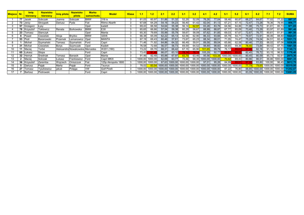 Miejsce Nr. 1 2 3 4 5 6 7 8 9 10 11 12 13 14 15 16 17 77 73 57 78 23 8 53 1 31 11 65 32 2 36 5 27 7 Imię kierowcy Jacek Jerzy Grzegorz Krzysztof Tomasz Paweł Piotr Michał Michał Maciej Łukasz Henryk Maciej Krzysztof Dariusz Tomasz Bartosz Nazwisko kierowcy Sobczak Skrzypek Łysy Tokłowicz Stanczyk Ciesielski Baranowski Szymański Ciesielski Torbé Stopa Średniak Solczak Zaremba Pająk Tyszkiewicz Piotrowski Marka samochodu Joanna BMW Dariusz Fiat Opel Renata Borkowska BMW Opel Alicja Bryćko BMW Przemek Lemanowicz Opel Tomasz Szymański Ford Borys Szymczak Opel Aleksandra Nowakowska Mercedes Ford Tomasz Banasik Opel Łukasz Frankiewicz Ford Wojciech Oniszczuk Fiat Marta Pająk Ford jakub Potęga VW Ford Imię pilota Nazwisko pilota Sobczak Pyda Model Klasa 1.1 318 is Ritmo Abarth kadett E30 Manta 320/6 MANTA Capri Kadett W201 (190) Capri Manta Capri MKIII 125p Akropolis 1800 Taunus Golf Pirelli Capri 3 3 3 3 3 3 3 3 3 3 3 3 3 3 3 3 3 61,03 67,68 69,43 65,65 65,30 66,38 67,19 71,46 76,58 73,22 73,43 91,46 1000,00 1000,00 78,02 1000,00 1000,00 1.2 2.1 2.2 3.1 60,97 51,86 51,32 52,29 64,29 54,16 54,23 56,40 66,58 54,64 55,38 56,14 66,66 57,54 59,38 60,29 79,69 55,99 55,79 58,67 65,09 62,22 65,13 62,56 69,43 60,46 57,61 73,67 71,92 64,86 64,32 66,49 72,68 56,57 56,73 69,59 69,70 68,31 66,42 67,15 91,46 66,07 63,10 78,14 82,48 65,88 67,97 65,79 1000,00 62,69 63,77 70,46 1000,00 67,63 1000,00 1000,00 83,54 1000,00 1000,00 1000,00 1000,00 1000,00 1000,00 1000,00 1000,00 1000,00 1000,00 1000,00 3.2 4.1 52,09 61,42 62,97 58,67 58,09 62,90 65,23 59,91 64,52 65,90 78,14 63,46 68,35 1000,00 1000,00 1000,00 1000,00 76,26 82,04 83,28 88,99 87,62 86,33 88,34 89,58 98,89 101,65 105,29 95,56 1000,00 97,01 1000,00 1000,00 1000,00 4.2 5.1 5.2 77,04 58,46 60,87 81,13 67,21 67,15 83,76 64,56 64,86 88,87 67,77 65,09 81,85 69,03 67,67 93,66 65,79 64,71 88,01 71,05 74,47 89,04 65,66 62,58 98,60 68,65 69,36 99,79 76,17 89,61 92,77 89,61 89,61 103,38 1000,00 1000,00 1000,00 70,42 69,43 95,26 84,99 89,61 1000,00 1000,00 1000,00 1000,00 87,22 76,80 1000,00 1000,00 1000,00 6.1 6.2 7.1 66,27 64,67 77,02 72,47 73,28 78,36 71,98 75,73 81,81 73,40 73,29 83,97 72,67 76,77 80,61 79,97 72,91 88,46 75,29 74,04 84,51 80,46 77,53 88,02 78,40 73,84 89,42 97,00 82,16 91,13 82,45 76,72 93,15 80,45 80,59 85,73 80,86 86,51 88,86 97,00 83,80 100,95 77,79 79,65 1000,00 88,85 1000,00 1000,00 83,09 1000,00 1000,00 7.2 SUMA 77,22 887,37 76,95 956,77 80,73 971,85 81,89 991,46 81,81 991,56 88,80 1024,91 82,42 1031,72 87,06 1038,89 87,75 1061,58 92,51 1140,72 96,52 1176,46 92,61 2975,36 1000,00 5661,35 96,45 5812,70 1000,00 10319,00 1000,00 11252,87 1000,00 13083,09