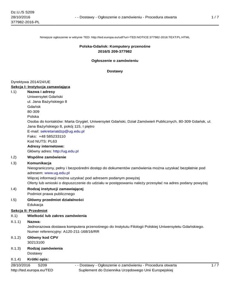 Dz.U./S S209 28/10/2016 377982-2016-PL - - Dostawy - Ogłoszenie o zamówieniu - Procedura otwarta 1/7 Niniejsze ogłoszenie w witrynie TED: http://ted.europa.eu/udl?uri=TED:NOTICE:377982-2016:TEXT:PL:HTML Polska-Gdańsk: Komputery przenośne 2016/S 209-377982 Ogłoszenie o zamówieniu Dostawy Dyrektywa 2014/24/UE Sekcja I: Instytucja zamawiająca I.1) Nazwa i adresy Uniwersytet Gdański ul. Jana Bażyńskiego 8 Gdańsk 80-309 Polska Osoba do kontaktów: Marta Grygiel, Uniwersytet Gdański, Dział Zamówień Publicznych, 80-309 Gdańsk, ul. Jana Bażyńskiego 8, pokój 115, I piętro E-mail: [email protected] Faks: +48 585233110 Kod NUTS: PL63 Adresy internetowe: Główny adres: http://ug.edu.pl I.2) Wspólne zamówienie I.3) Komunikacja Nieograniczony, pełny i bezpośredni dostęp do dokumentów zamówienia można uzyskać bezpłatnie pod adresem: www.ug.edu.pl Więcej informacji można uzyskać pod adresem podanym powyżej Oferty lub wnioski o dopuszczenie do udziału w postępowaniu należy przesyłać na adres podany powyżej I.4) Rodzaj instytucji zamawiającej Podmiot prawa publicznego I.5) Główny przedmiot działalności Edukacja Sekcja II: Przedmiot II.1) Wielkość lub zakres zamówienia II.1.1) Nazwa: Jednorazowa dostawa komputera przenośnego do Instytutu Filologii Polskiej Uniwersytetu Gdańskiego. Numer referencyjny: A120-211-168/16/RR II.1.2) Główny kod CPV 30213100 II.1.3) Rodzaj zamówienia Dostawy II.1.4) Krótki opis: 28/10/2016 S209 http://ted.europa.eu/TED - - Dostawy - Ogłoszenie o zamówieniu - Procedura otwarta Suplement do Dziennika Urzędowego Unii Europejskiej 1/7 Dz.U./S S209 28/10/2016 377982-2016-PL - - Dostawy - Ogłoszenie o zamówieniu - Procedura otwarta 2/7 Przedmiotem zamówienia jest jednorazowa dostawa komputera przenośnego, zwanego dalej „sprzętem” do Instytutu Filologii Polskiej Uniwersytetu Gdańskiego. II.1.5) Szacunkowa całkowita wartość II.1.6) Informacje o częściach To zamówienie podzielone jest na części: nie II.2) Opis II.2.1) Nazwa: II.2.2) Dodatkowy kod lub kody CPV II.2.3) Miejsce świadczenia usług Kod NUTS: PL634 Główne miejsce lub lokalizacja realizacji: Miejsce dostawy sprzętu: Instytut Filologii Polskiej, ul. Wita Stwosza 55, 80-952 Gdańsk, pokój 3.45. II.2.4) Opis zamówienia: 1. Kod Klasyfikacji Wspólnego Słownika Zamówień CPV: 30213100-6 komputer przenośny, 2. Przedmiotem zamówienia jest jednorazowa dostawa komputera przenośnego, zwanego dalej sprzętem do Instytutu Filologii Polskiej Uniwersytetu Gdańskiego. 3. Miejsce dostawy sprzętu: Instytut Filologii Polskiej, ul. Wita Stwosza 55, 80-952 Gdańsk, pokój 3.45. 4. Dostawa obejmuje: 1) wniesienie i ustawienie sprzętu w miejscu wskazanym przez Zamawiającego, 2) transport sprzętu na koszt Wykonawcy. 5. Sprzęt będący przedmiotem zamówienia musi spełniać co najmniej parametry wyszczególnione przez Zamawiającego w załączniku nr 1A do SIWZ- formularz przedmiotowy. 6. Sprzęt będzie objęty gwarancją producenta przez okres – minimum 24 miesięcy, z uwzględnieniem zapisów w rozdziale XIV SIWZ – gwarancja stanowi jedno z kryteriów oceny ofert. 7. Sprzęt musi: 1) być fabrycznie nowy tzn. nie używany przed dniem dostarczenia z wyłączeniem używania niezbędnego do przeprowadzenia testu jego poprawnego działania; wymagane jest aby sprzęt nie posiadał wad fizycznych i prawnych, 2) być dostarczony Zamawiającemu w oryginalnych fabrycznych opakowaniach, których przechowywanie przez Zamawiającego nie jest wymagane do zachowania udzielonej gwarancji, 3) być oznakowany (w tym oznakowaniem CE) zgodnie z wymogami określonymi w ustawie z dnia 13 kwietnia 2016r. o systemach oceny zgodności i nadzoru rynku (tekst jednolity Dz. U. 2016r. poz. 542 z późn. zm.), 4) w przypadku, gdy sprzęt jest produktem wykorzystującym energię w rozumieniu art. 2 ustawy z dnia 14 września 2012r. o informowaniu o zużyciu energii przez produkty wykorzystujące energię oraz o kontroli realizacji programu znakowania urządzeń biurowych (Dz. U. z 2012r. poz. 1203 z późn. zm.): a) mieć dołączone do produktu wykorzystującego energię etykiety sporządzone w języku polskim, które będą zawierały informacje o klasie efektywności energetycznej (zużyciu energii lub o wpływie tego produktu na zużycie energii) oraz innych podstawowych zasobach (wody, chemikaliów lub innych substancji) zużywanych przez produkt wykorzystujący energię; b) mieć dołączoną do broszur lub innej dokumentacji dostarczanej z produktem wykorzystującym energię kartę sporządzoną w języku polskim, która będzie zawierała tabelę z informacjami technicznymi dotyczącymi produktu wykorzystującego energię; 28/10/2016 S209 http://ted.europa.eu/TED - - Dostawy - Ogłoszenie o zamówieniu - Procedura otwarta Suplement do Dziennika Urzędowego Unii Europejskiej 2/7 Dz.U./S S209 28/10/2016 377982-2016-PL - - Dostawy - Ogłoszenie o zamówieniu - Procedura otwarta 3/7 c) mieć umieszczone na etykiecie i w karcie dane zgodne z parametrami technicznymi produktu wykorzystującego energię; zgodnie z wymaganiami określonymi w ww. ustawie. 8. Zamawiający odmówi odbioru dostarczonego sprzętu, w przypadku: 1) stwierdzenia rozbieżności pomiędzy cechami dostarczonego sprzętu a przedstawionymi w ofercie, z zastrzeżeniem zmian dokonanych na podstawie § 10 ust. 1 pkt. 2 projektu umowy, 2) uszkodzenia lub wady uniemożliwiającej użycie sprzętu w jego pełnym zakresie. 9. W przypadkach określonych w pkt. 8 przedstawiciel Zamawiającego, o którym mowa w § 5 ust. 8 projektu umowy, sporządza protokół zawierający przyczyny odmowy odebrania sprzętu, a Wykonawca jest obowiązany do niezwłocznego dostarczenia sprzętu zgodnego ze złożoną ofertą. Jeżeli termin dostawy przekroczy w takim przypadku termin realizacji zamówienia określony w § 2 umowy, Zamawiający będzie miał prawo do naliczenia kar umownych zgodnie z § 8 ust. 1 pkt. 1) umowy. II.2.5) Kryte