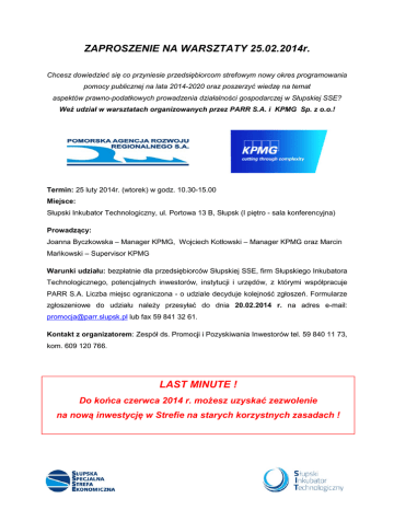 ZAPROSZENIE NA WARSZTATY 25.02.2014r. Chcesz dowiedzieć się co przyniesie przedsiębiorcom strefowym nowy okres programowania pomocy publicznej na lata 2014-2020 oraz poszerzyć wiedzę na temat aspektów prawno-podatkowych prowadzenia działalności gospodarczej w Słupskiej SSE? Weź udział w warsztatach organizowanych przez PARR S.A. i KPMG Sp. z o.o.! Termin: 25 luty 2014r. (wtorek) w godz. 10.30-15.00 Miejsce: Słupski Inkubator Technologiczny, ul. Portowa 13 B, Słupsk (I piętro - sala konferencyjna) Prowadzący: Joanna Byczkowska – Manager KPMG, Wojciech Kotłowski – Manager KPMG oraz Marcin Mańkowski – Supervisor KPMG Warunki udziału: bezpłatnie dla przedsiębiorców Słupskiej SSE, firm Słupskiego Inkubatora Technologicznego, potencjalnych inwestorów, instytucji i urzędów, z którymi współpracuje PARR S.A. Liczba miejsc ograniczona - o udziale decyduje kolejność zgłoszeń. Formularze zgłoszeniowe do udziału należy przesyłać do dnia 20.02.2014 r. na adres e-mail: [email protected] lub fax 59 841 32 61. Kontakt z organizatorem: Zespół ds. Promocji i Pozyskiwania Inwestorów tel. 59 840 11 73, kom. 609 120 766. LAST MINUTE ! Do końca czerwca 2014 r. możesz uzyskać zezwolenie na nową inwestycję w Strefie na starych korzystnych zasadach ! KPMG to międzynarodowa sieć firm świadczących usługi z zakresu audytu, doradztwa podatkowego i doradztwa gospodarczego. KPMG zatrudnia ponad 155 000 pracowników w 155 krajach. KPMG było jedną z pierwszych firm audytorsko-doradczych o międzynarodowym zasięgu obecnych na polskim rynku. Rozpoczęliśmy działalność w warszawie w maju 1990 roku. Obecnie KPMG w Polsce zatrudnia ponad 1200 pracowników w 7 miastach: Warszawie, Krakowie, Poznaniu, Wrocławiu, Gdańsku, Katowicach i Łodzi. Informacje o ekspertach KPMG prowadzących warsztaty: Joanna Byczkowska - Manager Joanna Byczkowska rozpoczęła pracę w dziale audytu KPMG w 2008 roku. Posiada uprawnienia biegłego rewidenta oraz ukończyła liczne szkolenia z zakresu Międzynarodowych Standardów Sprawozdawczości Finansowej (MSSF) Brała udział w wielu projektach związanych z badaniem jednostkowych oraz skonsolidowanych sprawozdań finansowych przygotowanych zgodnie z polskimi i międzynarodowymi standardami sprawozdawczości finansowej. Joanna zajmowała się także wdrażaniem w spółkach sprawozdawczość wg MSSF. Wojciech Kotłowski - Manager Doradca Podatkowy. W 2006 roku ukończył Wydział Prawa i Administracji na Uniwersytecie Gdańskim. Posiada 8 letnie doświadczenie w doradztwie podatkowym. Podczas swojej wieloletniej pracy zawodowej zajmował się bieżącą obsługą podatkową klientów, doradzając w kwestiach związanych z podatkami CIT, PIT i VAT na rzecz spółek z różnych sektorów, w tym również w podmiotach prowadzących działalność na terenie specjalnych stref ekonomicznych. Marcin Mańkowski - Supervisor Marcin dołączył do zespołu Ulg i Dotacji w 2008 roku. Wcześniej pracował w departamencie audytu KPMG. Posiada bogate doświadczenie w tworzeniu modeli finansowych i ekonomicznych na potrzeby pozyskiwania, finansowania oraz potwierdzenia pomocy publicznej przez Komisję Europejską. Jest współautorem publikacji „Przewodnik po specjalnych strefach ekonomicznych” oraz „Poland as the destination for Shared Services Centers” wydanych wspólnie z Polską Agencją Inwestycji Zagranicznych. PROGRAM WARSZTATÓW W DNIU 25.02.2014r. Godzina 10:30-11:00 11:00-11:10 Działanie Rejestracja uczestników w Słupskim Inkubatorze Technologicznym Powitanie Podatek odroczony wg polskich zasad rachunkowości oraz wg MSSF. • Ustalanie różnic przejściowych 11:10-12:00 • Podejście do podatku odroczonego w SSE • Analiza utraty wartości aktywa z tyt. Odroczonego podatku dochodowego Kalkulacja dostępnej pomocy publicznej – najczęstsze błędy i pułapki – część I. 12:00-12:50 • Koszty kwalifikowane a kalkulacja pomocy • Kilka zezwoleń na działalność w SSE 12:50-13:00 Przerwa kawowa Kalkulacja dostępnej pomocy publicznej – najczęstsze błędy i pułapki – część II. 13:00-14:00 • Funkcjonowanie SSE do 2026 • Zwolnienie z podatku od nieruchomości • Zagadnienia zgłoszone przez uczestników Pomoc Publiczna 2014-2020, dodatkowe możliwości dofinansowania dla firm działających w SSE. • Najważniejsze zmiany w porównaniu do obecnych zasad 14:00-14:30 • Na co przedsiębiorstwa działające w SSE mogą dostać dodatkowe wsparcie (dotację) • Zagadnienia zgłoszone przez uczestników 14:30-15:00 Zakończenie warsztatów, lunch Uczestnicy warsztatów mogą składać pisemne pytania w ramach powyższego zakresu tematycznego na adres [email protected] do dnia 20.02.2014r. Pytania zostaną przekazane do osób prowadzących warsztaty.