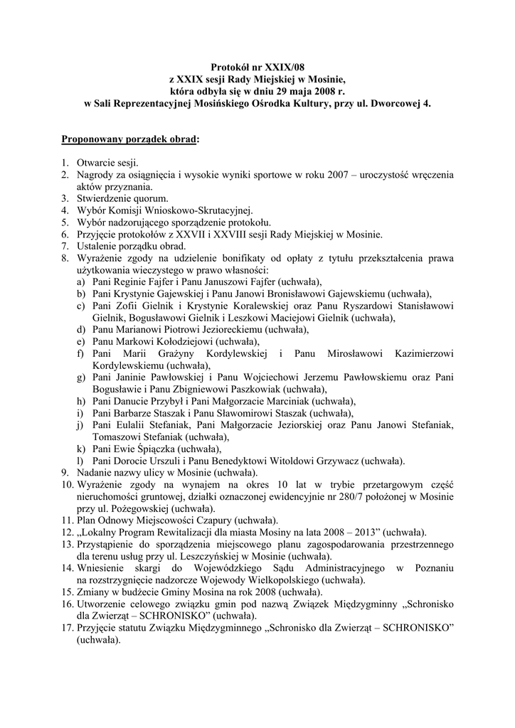 Protokół nr XXIX/08 z XXIX sesji Rady Miejskiej w Mosinie, która odbyła się w dniu 29 maja 2008 r. w Sali Reprezentacyjnej Mosińskiego Ośrodka Kultury, przy ul. Dworcowej 4. Proponowany porządek obrad: 1. Otwarcie sesji. 2. Nagrody za osiągnięcia i wysokie wyniki sportowe w roku 2007 – uroczystość wręczenia aktów przyznania. 3. Stwierdzenie quorum. 4. Wybór Komisji Wnioskowo-Skrutacyjnej. 5. Wybór nadzorującego sporządzenie protokołu. 6. Przyjęcie protokołów z XXVII i XXVIII sesji Rady Miejskiej w Mosinie. 7. Ustalenie porządku obrad. 8. Wyrażenie zgody na udzielenie bonifikaty od opłaty z tytułu przekształcenia prawa użytkowania wieczystego w prawo własności: a) Pani Reginie Fajfer i Panu Januszowi Fajfer (uchwała), b) Pani Krystynie Gajewskiej i Panu Janowi Bronisławowi Gajewskiemu (uchwała), c) Pani Zofii Gielnik i Krystynie Koralewskiej oraz Panu Ryszardowi Stanisławowi Gielnik, Bogusławowi Gielnik i Leszkowi Maciejowi Gielnik (uchwała), d) Panu Marianowi Piotrowi Jezioreckiemu (uchwała), e) Panu Markowi Kołodziejowi (uchwała), f) Pani Marii Grażyny Kordylewskiej i Panu Mirosławowi Kazimierzowi Kordylewskiemu (uchwała), g) Pani Janinie Pawłowskiej i Panu Wojciechowi Jerzemu Pawłowskiemu oraz Pani Bogusławie i Panu Zbigniewowi Paszkowiak (uchwała), h) Pani Danucie Przybył i Pani Małgorzacie Marciniak (uchwała), i) Pani Barbarze Staszak i Panu Sławomirowi Staszak (uchwała), j) Pani Eulalii Stefaniak, Pani Małgorzacie Jeziorskiej oraz Panu Janowi Stefaniak, Tomaszowi Stefaniak (uchwała), k) Pani Ewie Śpiączka (uchwała), l) Pani Dorocie Urszuli i Panu Benedyktowi Witoldowi Grzywacz (uchwała). 9. Nadanie nazwy ulicy w Mosinie (uchwała). 10. Wyrażenie zgody na wynajem na okres 10 lat w trybie przetargowym część nieruchomości gruntowej, działki oznaczonej ewidencyjnie nr 280/7 położonej w Mosinie przy ul. Pożegowskiej (uchwała). 11. Plan Odnowy Miejscowości Czapury (uchwała). 12. „Lokalny Program Rewitalizacji dla miasta Mosiny na lata 2008 – 2013” (uchwała). 13. Przystąpienie do sporządzenia miejscowego planu zagospodarowania przestrzennego dla terenu usług przy ul. Leszczyńskiej w Mosinie (uchwała). 14. Wniesienie skargi do Wojewódzkiego Sądu Administracyjnego w Poznaniu na rozstrzygnięcie nadzorcze Wojewody Wielkopolskiego (uchwała). 15. Zmiany w budżecie Gminy Mosina na rok 2008 (uchwała). 16. Utworzenie celowego związku gmin pod nazwą Związek Międzygminny „Schronisko dla Zwierząt – SCHRONISKO” (uchwała). 17. Przyjęcie statutu Związku Międzygminnego „Schronisko dla Zwierząt – SCHRONISKO” (uchwała). 2 18. Zmiana uchwały nr XXV/153/08 Rady Miejskiej w Mosinie z dnia 28 lutego 2008 r. w sprawie regulaminu określającego wysokość stawek i szczegółowe warunki przyznawania i wypłacania dodatków za wysługę lat, motywacyjnego, funkcyjnego, mieszkaniowego oraz za warunki pracy i niektóre inne składniki wynagrodzenia, jak również szczegółowe warunki obliczania i wypłacania wynagrodzenia za godziny ponadwymiarowe, godziny doraźnych zastępstw oraz wysokość i warunki wypłacania nagród dla nauczycieli zatrudnionych w szkołach, dla których organem prowadzącym jest Gmina Mosina (uchwała). 19. Procedura uchwalania budżetu (uchwała). 20. Wynagrodzenie Burmistrza Gminy Mosina (uchwała). 21. Zlecenie Komisji Rewizyjnej przeprowadzenia kontroli wydatkowania środków finansowych na zorganizowanie festynu na terenie Osiedla nr 7 w Mosinie w dniu 1 września 2007 r. (uchwała). 22. Sprawozdanie Burmistrza Gminy Mosina z działalności od 24 kwietnia do 29 maja 2008 r. 23. Sprawy organizacyjne i bieżące Rady Miejskiej. 24. Zapytania i wnioski radnych. 25. Zakończenie sesji. Przebieg sesji: do punktu 1. – Otwarcie sesji. Otwarcia sesji o godzinie 16.05 dokonał Przewodniczący Rady Miejskiej w Mosinie Jacek Szeszuła. Powitał przy tym przybyłych na sesję radnych, zaproszonych gości i mieszkańców Gminy Mosina. do punktu 2. – Nagrody za osiągnięcia i wysokie wyniki sportowe w roku 2007 – uroczystość wręczenia aktów przyznania. Przewodniczący obrad Jacek Szeszuła przypomniał, że Komisja Edukacji, Kultury i Sportu Rady Miejskiej w Mosinie w końcówce 2007 r. usilnie pracowała nad tym, aby do sukcesów „naszych” najmłodszych mieszkańców „naszej” gminy wypracować odpowiedni dokument. Ten dokument został wypracowany uchwałą Rady Miejskiej w Mosinie 28 grudnia 2007 r., a wszedł w życie w miesiącu „marcu”. Ten poślizg wynikał z tego, że w dopiero w tym miesiącu „w dzienniku urzędowym województwa poznańskiego” ukazała się ta uchwała. Stąd też sprawie można było nadać dalej bieg urzędowy. Na to był poświęcony cały miesiąc kwiecień i dzisiaj „mamy” do czynienia z finałem działalności, tak komisji rady gminy, jak i całej Rady Miejskiej w Mosinie, która „taką” uchwałę podjęła. Kierownik Ośrodka Sportu i Rekreacji w Mosinie Waldemar Demuth przedstawił osiągnięcia i wyniki sportowe w roku 2007 Maksymiliana Wiśniewskiego, za które przyznana mu została III nagroda pieniężna w wysokości 1.000,00 zł. Następnie Burmistrz Gminy Mosina Zofia Springer wraz z Przewodniczącą Komisji Edukacji, Kultury i Sportu Rady Miejskiej w Mosinie Danutą Białas oraz Przewodniczącym Rady Miejskiej w Mosinie Jackiem Szeszułą i Kierownikiem Ośrodka Sportu i Rekreacji w Mosinie Waldemarem Demuthem wręczyli Maksymilianowi Wiśniewskiemu akt przyznania III nagrody za osiągnięcia i wysokie wyniki sportowe w roku 2007 wraz z nagrodą książkową. Kierownik Ośrodka Sportu i Rekreacji w Mosinie Waldemar Demuth przedstawił osiągnięcia i wyniki sportowe w roku 2007 Anny Janik, za które przyznana jej została II nagroda pieniężna w wysokości 1.500,00 zł. Następnie Burmistrz Gminy Mosina Zofia Springer wraz z Przewodniczącą Komisji Edukacji, Kultury i Sportu Rady Miejskiej w Mosinie Danutą 3 Bia