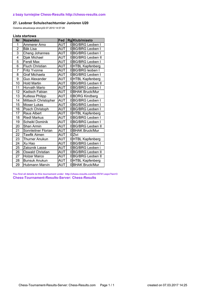 z bazy turniejów Chess-Results http://chess-results.com 27. Leobner Schulschachturnier Junioren U20 Ostatnia aktualizacja strony02.07.2010 14:57:28 Lista startowa Nr Nazwisko 1 Ammerer Arno 2 Bäk Lisa 3 Cheng Johannes 4 Djak Michael 5 Ferstl Max 6 Fluch Christian 7 Fritz Yvonne 8 Graf Michaela 9 Guo Alexander 10 Hold Martin 11 Horvath Mario 12 Kadisch Fabian 13 Kutlesa Philipp 14 Mittasch Christopher 15 Moser Lukas 16 Posch Christoph 17 Raus Albert 18 Riedl Markus 19 Scheikl Dominik 20 Shan Armin 21 Sonnleitner Florian 22 Tawfik Aimen 23 Thurner Anukun 24 Xu Hao 25 Zaloznik Lasse 26 Oswald Christian 27 Holzer Marco 28 Bunsuk Anukun 29 Hubmann Marvin Fed Rg Klub/miasto AUT 0 BG/BRG Leoben I AUT 0 BG/BRG Leoben I AUT 0 BG/BRG Leoben I AUT 0 BG/BRG Leoben II AUT 0 BG/BRG Leoben I AUT 0 HTBL Kapfenberg AUT 0 BG/BRG leoben I AUT 0 BG/BRG Leoben I AUT 0 HTBL Kapfenberg AUT 0 BG/BRG Leoben II AUT 0 BG/BRG Leoben I AUT 0 BHAK Bruck/Mur AUT 0 BORG Kindberg AUT 0 BG/BRG Leoben I AUT 0 BG/BRG Leoben I AUT 0 BG/BRG Leoben I AUT 0 HTBL Kapfenberg AUT 0 BG/BRG Leoben I AUT 0 BG/BRG Leoben I AUT 0 BG/BRG Leoben II AUT 0 BHAK Bruck/Mur AUT 0 Zivi AUT 0 HTBL Kapfenberg AUT 0 BG/BRG Leoben I AUT 0 BG/BRG Leoben i AUT 0 BG/BRG Leoben II AUT 0 BG/BRG Leoben II AUT 0 HTBL Kapfenberg AUT 0 BHAK Bruck/Mur You find all details to this tournament under http://chess-results.com/tnr35741.aspx?lan=3 Chess-Tournament-Results-Server: Chess-Results Chess-Tournament-Results-Server: Chess-Results.com Page 1 / 1 created on 07.03.2017 14:25
