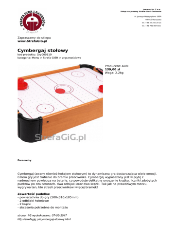 Jammas Sp. Z o.o. Sklep stacjonarny Strefa Gier i Gadżetów Al. Jerzego Waszyngtona 100A 04-015 Warszawa tel. +48 22 250 20 21 tel. +48 793 097 555 Zapraszamy do sklepu www.StrefaGiG.pl Cymbergaj stołowy kod produktu: Gry000119 kategoria: Menu > Strefa GIER > zręcznościowe Producent: ALBI 139,00 zł Waga: 2.2kg Parametry Cymbergaj (zwany również hokejem stołowym) to dynamiczna gra dostarczająca wiele emocji. Celem gry jest trafienie do bramki przeciwnika. Cymbergaj wyposażony jest w płytę z nadmuchem powietrza na baterie, co powoduje delikatne unoszenie krążka, liczniki zdobytych punktów po obu stronach, dwa odbijaki oraz dwa krążki. Tak jak na prawdziwym meczu, wygrywa ten, kto strzeli przeciwnikowi więcej bramek! Zawartość pudełka: - powierzchnia do gry (500x310x105mm) - 2 odbijaki hokejowe - 2 krążki - akcesoria potrzebne do montażu strona: 1/2 wydrukowano: 07-03-2017 http://strefagig.pl/cymbergaj-stolowy.html - instrukcja użytkowania (PL, SK, CZ) - baterie 8x AA (nie są dołączone do zestawu) strona: 2/2 wydrukowano: 07-03-2017 http://strefagig.pl/cymbergaj-stolowy.html