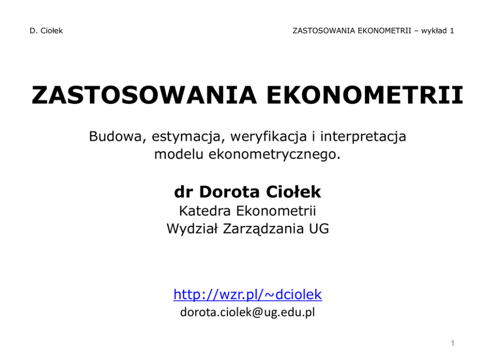 D. Ciołek ZASTOSOWANIA EKONOMETRII – wykład 1 ZASTOSOWANIA EKONOMETRII Budowa, estymacja, weryfikacja i interpretacja modelu ekonometrycznego. dr Dorota Ciołek Katedra Ekonometrii Wydział Zarządzania UG http://wzr.pl/~dciolek [email protected] 1 D. Ciołek ZASTOSOWANIA EKONOMETRII – wykład 1 Literatura Osińska M. (red.) (2007), Ekonometria współczesna, TNOiK, Toruń. Strzała, K., T. Przechlewski (2006), Ekonometria inaczej, wyd. III, Wydawnictwo Uniwersytetu Gdańskiego, Sopot. ” G.S Maddala (2006), Ekonometria, PWN, Warszawa. Kukuła, K. (red.) (2009), Wprowadzenie do ekonometrii w przykładach i zadaniach, PWN, Warszawa. Greene, W.H. (2008), Econometric analysis, Macmillan, New York. J.M.Wooldridge (2009), Introductory Econometrics. A modern approach. 2 D. Ciołek ZASTOSOWANIA EKONOMETRII – wykład 1 I Model ekonometryczny Model ekonometryczny - jest podstawowym narzędziem w ekonometrii, służącym do analizy zależności zachodzących między różnymi zjawiskami. Model - jest uproszczonym odwzorowaniem rzeczywistości, uproszczoną reprezentacją realnego obiektu, realnej sytuacji lub realnego procesu. - uwzględnia tylko istotne cechy, najważniejsze z punktu widzenia określonego celu. - nie jest dokładną reprezentacją rzeczywistości. (Pawłowski 1978): „Model ekonometryczny jest to konstrukcja formalna, która za pomocą jednego równania lub układu równań przedstawia zasadnicze powiązania występujące pomiędzy rozpatrywanymi zjawiskami ekonomicznymi.” D. Ciołek ZASTOSOWANIA EKONOMETRII – wykład 1 Ogólna postać modelu: y f ( x, ) y – zmienna objaśniana w modelu – endogeniczna, x – zmienne objaśniające, wyjaśniają kształtowanie się zmiennej endogenicznej, - składnik zakłócający, f( ) - oznacza postać analityczną funkcyjnej zależności miedzy zmienną endogeniczną i zmiennymi objaśniającymi. Zmienne objaśniające (w modelach jednorównaniowych): - zmienne egzogeniczne, - zmienne endogeniczne opóźnione w czasie. D. Ciołek ZASTOSOWANIA EKONOMETRII – wykład 1 Przykłady modeli o konkretnej postaci analitycznej: Model liniowy – regresja prosta: y t 0 1 xt t Model liniowy – regresja wieloraka: yt 0 1 xt1 2 xt 2 ... k xtk t - są to nieznane, stałe w czasie parametry strukturalne. 0 - parametr strukturalny wyrazu wolnego, i - parametry strukturalne przy zmiennych odzwierciedlają siłę i kierunek wpływu zmiennej objaśniającej na zmienną endogeniczną, i=1,2,…,k. k – liczba zmiennych objaśniających w modelu. D. Ciołek ZASTOSOWANIA EKONOMETRII – wykład 1 Klasyfikacja zmiennych w modelu: Zmienne egzogeniczne 1) y t 0 1 ct 2 s t 3 d t t 2) ct 0 1ct 1 2 d t t Zmienne endogeniczne 1) y t 0 1 ct 2 s t 3 d t t 2) ct 0 1ct 1 2 d t t D. Ciołek ZASTOSOWANIA EKONOMETRII – wykład 1 Składnik zakłócający - losowy Przyczyny uwzględniania składnika losowego w modelu: - pominięcie niektórych czynników objaśniających (niektóre czynniki są nierozpoznane przez teorię, inne są niemierzalne), - wybór niewłaściwej postaci analitycznej funkcji; postać analityczna modelu zwykle nie jest dokładnie określona przez teorię ekonomii, - błędy w pomiarze zmiennych ekonomicznych, - losowy charakter zmiennych ekonomicznych. Składnik zakłócający jest zmienną losową i jak każda zmienna losowa charakteryzuje się pewnym rozkładem prawdopodobieństwa. Cechy rozkładu składnika zakłócającego są ważnym elementem modelu ekonometrycznego. D. Ciołek ZASTOSOWANIA EKONOMETRII – wykład 1 Zapis macierzowy modelu ekonometrycznego Dany jest liniowy model ekonometryczny: yt 0 1 xt1 2 xt 2 ... k xtk t t =1, 2, …, T, Ogólnie postać macierzową tego modelu można zapisać jako: gdzie: y X y – wektor obserwacji na zmiennej endogenicznej, X – macierz obserwacji na zmiennych objaśniających, - wektor parametrów strukturalnych, - wektor składników losowych. D. Ciołek ZASTOSOWANIA EKONOMETRII – wykład 1 Zapis macierzowy modelu ekonometrycznego y1 y 2 y y3 yT T 1 1 1 X 1 1 x11 x1k 1 x21 x2 k 2 x31 x3k 3 T xT 1 xTk T ( k 1) T 1 T – liczba obserwacji, 0 k – liczba zmiennych objaśniających, k+1 – liczba parametrów strukturalnych. 1 k ( k 1) 1 D. Ciołek ZASTOSOWANIA EKONOMETRII – wykład 1 Klasyfikacja modeli ekonometrycznych Przykład 2: gdzie: 1 2 Qi 0 K i Li e i Li – nakład pracy w i-tym przedsiębiorstwie (w osobach); Ki – wartość brutto zakładu lub fabryki (mln $); Qi – wartość dodana brutto wypracowana w i-tym przedsiębiorstwie (mln $). Model: - opisowy, - statyczny, - stochastyczny, - mikroekonomiczny, - nieliniowy, -* - jednorównaniowy, - przyczynowo–skutkowy. D. Ciołek ZASTOSOWANIA EKONOMETRII – wykład 1 Wybór postaci analitycznej modelu Model nieliniowy – funkcja analityczna jest nieliniowa ze względu na parametry. Model liniowy: Model nieliniowy: ln yt 0 1 ln xt 2 ln z t t 1 2 Qi 0 K i Li e i Wybór postaci analitycznej: - Zgodny z konkretną teorią ekonomiczną, - Wybierany metodą prób i błędów. - Na podstawie wykresu – regresja prosta. 11 D. Ciołek ZASTOSOWANIA EKONOMETRII – wykład 1 Logarytmy, czy poziomy zmiennych? logarytmy zmiennych, gdy: zmienna wyrażona jest w jednostkach pieniężnych (o wartościach dodatnich) – wynagrodzenie, sprzedaż firmy, wartość rynkowa firmy, Produkt Krajowy Brutto; zmienne o wysokich wartościach: wielkość populacji, całkowita liczba pracowników, współczynnik skolaryzacji, liczba kilometrów; poziomy zmiennych, gdy: zmienna wyrażona w liczbie lat: liczba lat edukacji lub doświadczenia, wiek; zmienna przyjmuje niewysokie wartości całkowite: liczba pokoi w domu, liczba osób w gospodarstwie domowym, liczba samochodów w gosp. domowym; zmienne sztuczne (zero-jedynkowe) reprezentujące zmienne jakościowe: płeć, poziom wykształcenia, przynależność do organizacji, położenie geograficzne. 12 D. Ciołek ZASTOSOWANIA EKONOMETRII – wykład 1 Logarytmy, czy poziomy zmiennych? Zmienne, które są