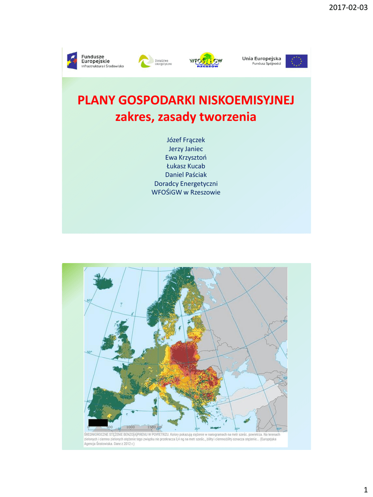 2017-02-03 PLANY GOSPODARKI NISKOEMISYJNEJ zakres, zasady tworzenia Józef Frączek Jerzy Janiec Ewa Krzysztoń Łukasz Kucab Daniel Paściak Doradcy Energetyczni WFOŚiGW w Rzeszowie 1 2017-02-03 Uwarunkowania prawne Planu Gospodarki Niskoemisyjnej Protokół z Kioto Przyjęty 11 grudnia 1997 r. w Kioto. Jeden z najważniejszych międzynarodowych instrumentów prawnych mających na celu walkę ze zmianami klimatu. Zawiera zobowiązania państw uprzemysłowionych do ograniczenia emisji gazów cieplarnianych odpowiedzialnych za globalne ocieplenie Uwarunkowania prawne Planu Gospodarki Niskoemisyjnej Protokół z Kioto zajmuje się emisjami sześciu gazów cieplarnianych dwutlenku węgla (CO2) metanu (CH4) tlenku azotu (N2O) fluorowęglowodorów (HFCs) perfluorowęglowodorów (PFCs) sześciofluorku siarki (SF6) 2 2017-02-03 Uwarunkowania prawne Planu Gospodarki Niskoemisyjnej Decyzja Rady 2002/358/WE z dnia 25 kwietnia 2002 r. Zatwierdzenie przez Wspólnotę Europejską protokołu z Kioto do Ramowej Konwencji Narodów Zjednoczonych w sprawie zmian klimatu i wspólnej realizacji wynikających z niego zobowiązań Uwarunkowania prawne Planu Gospodarki Niskoemisyjnej Polityka energetyczna Polski do 2030 roku Dokument przyjęty przez Radę Ministrów w dniu 10 listopada 2009 roku 3 2017-02-03 Plan Działań na Rzecz Zrównoważonej Energii (SEAP) jako pierwowzór PGN Pakiet klimatycznoenergetyczny UE 20/20/20 Porozumienie Burmistrzów Zmniejszenie emisji CO2 co najmniej o 20% w stosunku do 1990 r. 6 583 Sygnatariuszy 210 milionów mieszkańców Zwiększenie efektywności energetycznej o 20% w stosunku do 1990 r. Zwiększenie udziału odnawialnych źródeł energii w całkowitym zużyciu energii do 20% w stosunku do 1990 r. (15% dla Polski) Sygnatariusze Porozumienia zobowiązują się do spełnienia i przekroczenia celów unijnej polityki klimatycznoenergetycznej poprzez zmniejszenie emisji CO2 na swoim terenie o co najmniej 20% do 2020 roku (nowi sygnatariusze o 40% do 2030 r.) SEAP PGN Plan Działań na Rzecz Zrównoważonej Energii (Sustainable Energy Action Plan) Plan Gospodarki Niskoemisyjnej Dokument tworzony w ciągu roku od przystąpienia gminy do Porozumienia Burmistrzów i przedkładany do jego biura Po akceptacji przez NFOŚiGW lub WFOŚiGW umożliwia ubieganie się o środki finansowe np. z RPO Plan Działań na Rzecz Zrównoważonej Energii (SEAP) jako pierwowzór PGN Struktura SEAP i PGN 1. Streszczenie 2. Ogólna strategia a) Cele strategiczne i szczegółowe b) Stan obecny i wizja na przyszłość c) Aspekty organizacyjne i finansowe: • Struktury organizacyjne • Kadry • Zaangażowanie zainteresowanych stron i mieszkańców • Szacowany budżet • Przewidywane źródła finansowania inwestycji ujętych w Planie działań • Planowane środki w zakresie monitoringu i oceny 3. Bazowa inwentaryzacji emisji CO2 4. Działania i środki zaplanowane na cały okres objęty Planem (2020) zawierające: • Opis • Odpowiedzialny wydział, osobę lub firmę • Harmonogram (początek – koniec, kamienie milowe) • Oszacowanie kosztów • Szacowaną oszczędność energii/wzrost produkcji energii ze źródeł odnawialnych • Szacowaną redukcję emisji CO2 4 2017-02-03 Podstawowe informacje liczbowe zawarte w PGN Emisja CO2 w roku bazowym [Mg] Zużycie energii w roku bazowym [MWh] Energia z OZE w roku bazowym [MWh] Udział energii z OZE w bilansie energetycznym w roku bazowym [%] Planowana emisja CO2 w roku 2020 [Mg] Planowane zużycie energii w roku 2020 [MWh] Planowana energia z OZE w roku 2020 [MWh] Planowany udział energii z OZE w bilansie energetycznym w roku 2020 [%] Redukcja emisji CO2 [Mg] Redukcja zużycia energii [MWh] Wzrost energii z OZE [MWh] Redukcja emisji CO2 [%] Redukcja zużycia energii [%] Wzrost energii z OZE [%] Wyznaczenie celu w zakresie redukcji zanieczyszczeń powietrza (dotyczy PGN gmin, w których odnotowano przekroczenia poziomów dopuszczalnych stężeń zanieczyszczeń w powietrzu: PM10; PM2,5; B(a)P ) Rozkład stężeń średniorocznych benzo(a)pirenu w województwie podkarpackim w 2015 r. wyniki modelowania (wartość dopuszczalna 1ng/m3) Źródło: Ocena jakości powietrza w Województwie Podkarpackim za rok 2015r. 5 2017-02-03 Proces opiniowania PGN Dziękujemy za uwagę Doradcy Energetyczni WFOŚIGW w Rzeszowie Józef Frączek Jerzy Janiec Ewa Krzysztoń Łukasz Kucab Daniel Paściak [email protected] 6