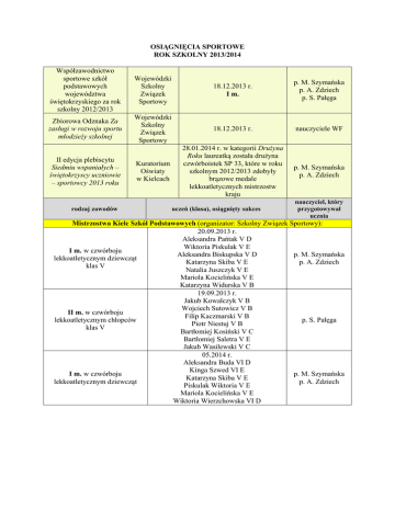 OSIĄGNIĘCIA SPORTOWE ROK SZKOLNY 2013/2014 Współzawodnictwo sportowe szkół podstawowych województwa świętokrzyskiego za rok szkolny 2012/2013 Wojewódzki Szkolny Związek Sportowy 18.12.2013 r. I m. p. M. Szymańska p. A. Zdziech p. S. Pałęga Zbiorowa Odznaka Za zasługi w rozwoju sportu młodzieży szkolnej Wojewódzki Szkolny Związek Sportowy 18.12.2013 r. nauczyciele WF Kuratorium Oświaty w Kielcach 28.01.2014 r. w kategorii Drużyna Roku laureatką została drużyna czwórboistek SP 33, które w roku szkolnym 2012/2013 zdobyły brązowe medale lekkoatletycznych mistrzostw kraju p. M. Szymańska p. A. Zdziech II edycja plebiscytu Siedmiu wspaniałych – świętokrzyscy uczniowie – sportowcy 2013 roku rodzaj zawodów uczeń (klasa), osiągnięty sukces nauczyciel, który przygotowywał ucznia Mistrzostwa Kielc Szkół Podstawowych (organizator: Szkolny Związek Sportowy): 20.09.2013 r. Aleksandra Pańtak V D Wiktoria Piskulak V E I m. w czwórboju Aleksandra Biskupska V D p. M. Szymańska lekkoatletycznym dziewcząt Katarzyna Skiba V E p. A. Zdziech klas V Natalia Juszczyk V E Mariola Kocielińska V E Katarzyna Widurska V B 19.09.2013 r. Jakub Kowalczyk V B Wojciech Sutowicz V B II m. w czwórboju Filip Kaczmarski V B lekkoatletycznym chłopców p. S. Pałęga Piotr Niestuj V B klas V Bartłomiej Kosiński V C Bartłomiej Saletra V E Jakub Wasilewski V C 05.2014 r. Aleksandra Buda VI D Kinga Szwed VI E I m. w czwórboju p. M. Szymańska Katarzyna Skiba V E lekkoatletycznym dziewcząt p. A. Zdziech Piskulak Wiktoria V E Mariola Kocielińska V E Wiktoria Wierzchowska VI D IV m. w czwórboju lekkoatletycznym chłopców klas VI II m. w piłce nożnej dziewcząt i chłopców klas V w indywidualnych biegach przełajowych dziewcząt (1000 m) i chłopców(1500 m) w drużynowych zawodach lekkoatletycznych szkół podstawowych IV m. w piłce ręcznej chłopców klas V 15.05.2014 r. Wojciech Sutowicz V B Mateusz Tokar VI E Bartłomiej Koźbiał VI E Piotr Niestuj V B Jakub Berbeś VI E Krystian Wojno VI E Adam Kowalski VI E Filip Kaczmarski V B 05. 2014 r. Natalia Kaleta VI C Aleksandra Perlik IV D Bartosz Górczyński V A Wiktor Bartoszek V A Wojciech Gajos V A Jakub Wasilewski V C Mateusz Janus V D Kamil Święcki IV C 09. 2013 r. III m. Agata Krzysiek VI C II m. Bartłomiej Koźbiał VI E 21-22.05.2014 r. • I m. w klasyfikacji drużynowej • bieg na dystansie 60 m: I m. Kinga Szwed VI D III m. Aleksandra Buda VI D • skok w dal: II m. Aleksandra Buda VI D III m. Mariola Kocielińska V E • piłka palantowa: I m. Wiktoria Piskulak V E III m. Karolina Wójcik VI D • bieg na dystansie 300 m: I m. Wiktoria Wierzchowska VI D II m. Mariola Kocielińska V E III m. Katarzyna Skiba V E • bieg na dystansie 600 m: III m. Kinga Szwed VI D 12.03.2014 r. Jakub Kowalczyk V B Filip Kaczmarski V B Piotr Niestuj V B Adrian Struch V B Wojciech Sutowicz V B Saletra Bartłomiej V E Aleksander Łoziński V E Aleksander Kwaśniewski V D Jakub Góral V D Wiktor Dziedzic V C Bartłomiej Kosiński V C Mateusz Stępień V C Paweł Sikora V C p. S. Pałęga p. A. Sulak p. J. Nakonieczny p. M. Szymańska p. A. Zdziech p. S. Pałęga p. M. Szymańska p. A. Zdziech p. S. Pałęga 20.09.2013 r. Weronika Kupisz VI E Julia Putko VI E Izabela Borek VI E Kinga Szwed VI E I m. w sztafetowych biegach p. M. Szymańska Maria Mac VI D przełajowych dziewcząt p. A. Zdziech Dominika Kaniowska VI B Aleksandra Pańtak V D Wiktoria Piskulak V E Agata Krzysiek VI C Mariola Kocielińska V E 05.06.2014 r. Jakub Makuła IV B Asad Bashir IV F II m. w trójboju Mateusz Matys IV F p. S. Pałęga lekkoatletycznym chłopców Grzegorz Pacierz IV F Bartłomiej Herman IV C Mateusz Tomaszewski IV D Arkadiusz Ciulęba IV C 04.06.14.r. Anna Mazur IV D II m. w trójboju Julia Chmielewska IV D p. M. Szymańska Nikola Nosek IV E p. A. Zdziech lekkoatletycznym dziewcząt Zuzanna Świeboda IV E Maja Kasprzyk IV C Świętokrzyskie Igrzyska Młodzieży Szkolnej (organizator: Wojewódzki Szkolny Związek Sportowy): 03.06.2014.r. Aleksandra Buda VI D Kinga Szwed VI E p. M. Szymańska I m. w czwórboju LA dziewcząt Katarzyna Skiba V E p. A. Zdziech Piskulak Wiktoria V E Mariola Kocielińska V E Anna Mazur IV D 10.10.2013 r. Weronika Kupisz VI E Wiktoria Wierzchowska VI D Karolina Wócik VI D Maria Mac VI C I m. finał wojewódzki Julia Putko VI E w sztafetowych biegach p. M. Szymańska Izabela Borek VI E przełajowych dystans 10 x 800 m p. A. Zdziech Kinga Szwed VI E dziewcząt Dominika Kaniowska VI B Aleksandra Pańtak V D Wiktoria Piskulak V E Agata Krzysiek VI C Mariola Kocielińska V E 15.04. 2014 r Julia Putko VI E Aleksandra Buda VI D III m. w drużynowych biegach Kinga Szwed VI E p. M. Szymańska przełajowych 800 m dziewcząt Katarzyna Skiba V E p. A. Zdziech Wiktoria Piskulak V E Agata Krzysiek VI C Mariola Kocielińska V E I m. w trójboju LA dziewcząt III m. w sztafetowych biegach rozstawnych dziewcząt sztafeta szwedzka – 100, 200, 300,400 m IV m. w sztafetowych biegach rozstawnych chłopców sztafeta szwedzka (100, 200, 300,400 m) 17.06.2014.r. Anna Mazur IV D Julia Chmielewska IV D Nikola Nosek IV E Zuzanna Świeboda IV E Maja Kasprzyk IV C Magdalena Olchowy IV D Klaudia Stępień IV B 06.05.2014 r. Aleksandra Buda VI D Kinga Szwed VI E Mariola Kocielińska V E Agata Krzysiek VI C 06.05.2014 r. Wojciech Sutowicz V B Mateusz Tokar VI E Bartłomiej Koźbiał VI E Piotr Niestuj V B p. M. Szymańska p. A. Zdziech p. M. Szymańska p. A. Zdziech p. S. Pałęga 06.05.2014 r. Katarzyna Skiba V E V m. w sztafetowych biegach p. M. Szymańska Wiktoria Piskulak V E rozstawnych 4 x 100 m dziewcząt p. A. Zdziech Natalia Kaleta VI C Julia Putko VI E Filip Kaczmarski V B V m. w sztafetowych biegach Jakub Berbeś VI E p. S. Pałęga rozstawnych 4 x 100 m chłopców Krystian Wojno VI E Mateusz Tokar VI E XXXIX Finał Krajowy w Czwórboju LA dziewcząt szkół podstawowych (organizator: Zarząd Główny Szkolnego Związku Sportowego): 12