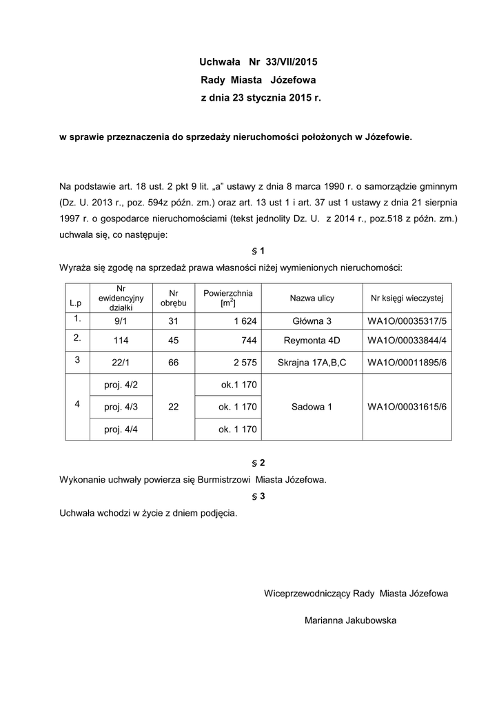Uchwała Nr 33/VII/2015 Rady Miasta Józefowa z dnia 23 stycznia 2015 r. w sprawie przeznaczenia do sprzedaży nieruchomości położonych w Józefowie. Na podstawie art. 18 ust. 2 pkt 9 lit. „a” ustawy z dnia 8 marca 1990 r. o samorządzie gminnym (Dz. U. 2013 r., poz. 594z późn. zm.) oraz art. 13 ust 1 i art. 37 ust 1 ustawy z dnia 21 sierpnia 1997 r. o gospodarce nieruchomościami (tekst jednolity Dz. U. z 2014 r., poz.518 z późn. zm.) uchwala się, co następuje: §1 Wyraża się zgodę na sprzedaż prawa własności niżej wymienionych nieruchomości: Nr ewidencyjny działki Nr obrębu 1. 9/1 31 1 624 2. 114 45 744 3 22/1 66 2 575 L.p proj. 4/2 4 proj. 4/3 proj. 4/4 Powierzchnia 2 [m ] Nazwa ulicy Nr księgi wieczystej Główna 3 WA1O/00035317/5 Reymonta 4D WA1O/00033844/4 Skrajna 17A,B,C WA1O/00011895/6 Sadowa 1 WA1O/00031615/6 ok.1 170 22 ok. 1 170 ok. 1 170 §2 Wykonanie uchwały powierza się Burmistrzowi Miasta Józefowa. §3 Uchwała wchodzi w życie z dniem podjęcia. Wiceprzewodniczący Rady Miasta Józefowa Marianna Jakubowska Uzasadnienie do Uchwały Nr 33/VII/2015 Rady Miasta Józefowa z dnia 23 stycznia 2015 roku w sprawie przeznaczenia do sprzedaży nieruchomości położonych w Józefowie. Sprzedaż nieruchomości następuje w trybie przepisów ustawy z dnia 21 sierpnia 1997r. o gospodarce nieruchomościami oraz rozporządzeniem Rady Ministrów w sprawie określenia szczegółowych zasad i trybu przeprowadzania przetargów na zbycie nieruchomości stanowiących własność Skarbu Państwa lub własność gminy. Zgodnie z ww. przepisami ustawy, co do zasady, sprzedaż nieruchomości następuje w drodze przetargu, po podjęciu przez radę stosownej uchwały. Niżej wymienione nieruchomości stanowią własność Gminy Miasta Józefowa. Nr ewidencyjny działki Nr obrębu 1. 9/1 31 1 624 2. 114 45 744 3 22/1 66 2 575 4 proj. 4/2 proj. 4/3 proj. 4/4 22 ok. 1 170 ok. 1 170 ok. 1 170 L.p Powierzchnia 2 [m ] Nazwa ulicy Nr księgi wieczystej Główna 3 WA1O/00035317/5 Reymonta 4D WA1O/00033844/4 Skrajna 17A,B,C WA1O/00011895/6 Sadowa WA1O/00031615/6 1. Nieruchomość usytuowana przy ul. Głównej 3 w Józefowie położona jest na terenie objętym Miejscowym planem zagospodarowania przestrzennego zatwierdzonym Uchwałą Rady Miasta Józefowa nr 69/III/2003 i oznaczonym symbolem RLz 42 - las z dopuszczeniem zabudowy mieszkaniowej jednorodzinnej wolnostojącej lub bliźniaczej. Nieruchomość nie jest obciążona wpisami w dziale III i IV księgi wieczystej. 2. Nieruchomość usytuowana przy ul. Reymonta 4D w Józefowie położona jest na terenie nieobjętym miejscowym planem zagospodarowania przestrzennego. Nieruchomość nie jest obciążona wpisami w dziale III i IV księgi wieczystej. 3. Nieruchomość usytuowana przy ul. Skrajnej w Józefowie położona jest na terenie objętym Miejscowym planem zagospodarowania przestrzennego zatwierdzonym Uchwałą Rady Miasta Józefowa nr 69/III/2003 i oznaczonym symbolem RLz 22 - las z dopuszczeniem zabudowy mieszkaniowej jednorodzinnej wolnostojącej lub bliźniaczej. Nieruchomość nie jest obciążona wpisami w dziale III i IV księgi wieczystej. 4. Nieruchomość usytuowana przy ul. Sadowej w Józefowie położona jest na terenie nieobjętym miejscowym planem zagospodarowania przestrzennego. Na nieruchomości znajduje się budynek mieszkalny, który przed sprzedażą ulegnie rozbiórce z uwagi na jego usytuowanie, w tzw. „ostrej granicy”. Nieruchomość będzie geodezyjnie podzielona na trzy działki ewidencyjne, które będą stanowić odrębne przedmioty sprzedaży. Nieruchomość nie jest obciążona wpisami w dziale III i IV księgi wieczystej. Wiceprzewodniczący Rady Miasta Józefowa Marianna Jakubowska