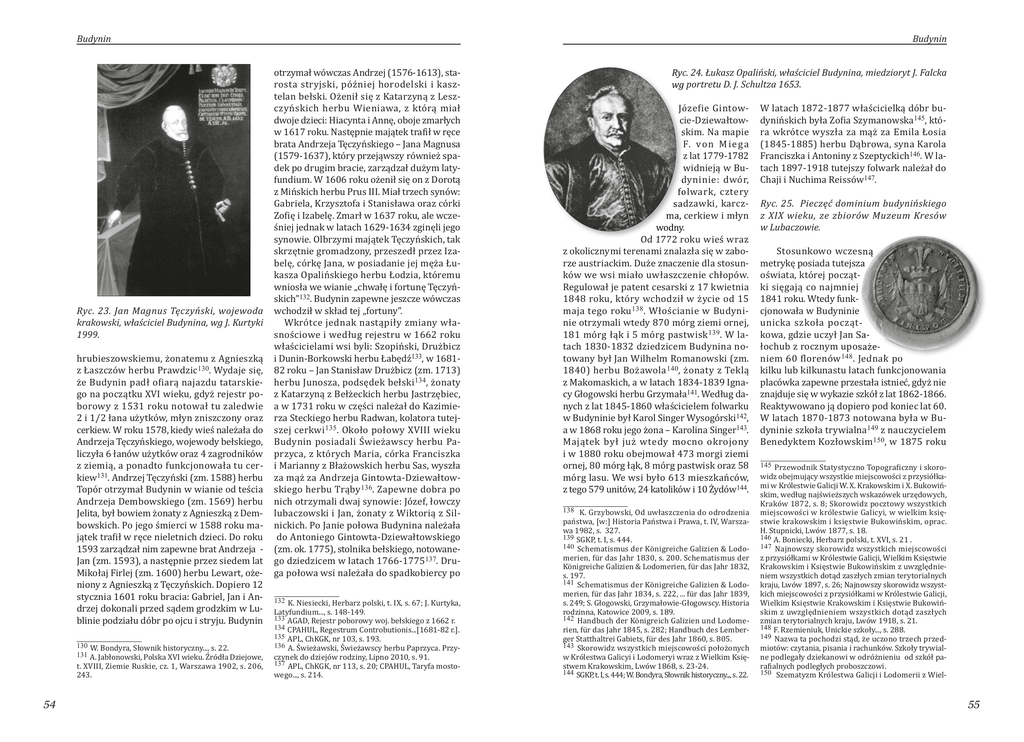 Budynin Ryc. 23. Jan Magnus Tęczyński, wojewoda krakowski, właściciel Budynina, wg J. Kurtyki 1999. hrubieszowskiemu, żonatemu z Agnieszką z Łaszczów herbu Prawdzic130. Wydaje się, że Budynin padł o�iarą najazdu tatarskiego na początku XVI wieku, gdyż rejestr poborowy z 1531 roku notował tu zaledwie 2 i 1/2 łana użytków, młyn zniszczony oraz cerkiew. W roku 1578, kiedy wieś należała do Andrzeja Tęczyńskiego, wojewody bełskiego, liczyła 6 łanów użytków oraz 4 zagrodników z ziemią, a ponadto funkcjonowała tu cerkiew131. Andrzej Tęczyński (zm. 1588) herbu Topór otrzymał Budynin w wianie od teścia Andrzeja Dembowskiego (zm. 1569) herbu Jelita, był bowiem żonaty z Agnieszką z Dembowskich. Po jego śmierci w 1588 roku majątek tra�ił w ręce nieletnich dzieci. Do roku 1593 zarządzał nim zapewne brat Andrzeja Jan (zm. 1593), a następnie przez siedem lat Mikołaj Firlej (zm. 1600) herbu Lewart, ożeniony z Agnieszką z Tęczyńskich. Dopiero 12 stycznia 1601 roku bracia: Gabriel, Jan i Andrzej dokonali przed sądem grodzkim w Lublinie podziału dóbr po ojcu i stryju. Budynin 130 W. Bondyra, Słownik historyczny..., s. 22. 131 A. Jabłonowski, Polska XVI wieku. Źródła Dziejowe, 54 t. XVIII, Ziemie Ruskie, cz. 1, Warszawa 1902, s. 206, 243. Budynin otrzymał wówczas Andrzej (1576-1613), starosta stryjski, później horodelski i kasztelan bełski. Ożenił się z Katarzyną z Leszczyńskich herbu Wieniawa, z którą miał dwoje dzieci: Hiacynta i Annę, oboje zmarłych w 1617 roku. Następnie majątek tra�ił w ręce brata Andrzeja Tęczyńskiego – Jana Magnusa (1579-1637), który przejąwszy również spadek po drugim bracie, zarządzał dużym latyfundium. W 1606 roku ożenił się on z Dorotą z Mińskich herbu Prus III. Miał trzech synów: Gabriela, Krzysztofa i Stanisława oraz córki Zo�ię i Izabelę. Zmarł w 1637 roku, ale wcześniej jednak w latach 1629-1634 zginęli jego synowie. Olbrzymi majątek Tęczyńskich, tak skrzętnie gromadzony, przeszedł przez Izabelę, córkę Jana, w posiadanie jej męża Łukasza Opalińskiego herbu Łodzia, któremu wniosła we wianie „chwałę i fortunę Tęczyńskich”132. Budynin zapewne jeszcze wówczas wchodził w skład tej „fortuny”. Wkrótce jednak nastąpiły zmiany własnościowe i według rejestru w 1662 roku właścicielami wsi byli: Szopiński, Drużbicz i Dunin-Borkowski herbu Łabędź133, w 168182 roku – Jan Stanisław Drużbicz (zm. 1713) herbu Junosza, podsędek bełski134, żonaty z Katarzyną z Bełżeckich herbu Jastrzębiec, a w 1731 roku w części należał do Kazimierza Steckiego herbu Radwan, kolatora tutejszej cerkwi 135. Około połowy XVIII wieku Budynin posiadali Świeżawscy herbu Paprzyca, z których Maria, córka Franciszka i Marianny z Błażowskich herbu Sas, wyszła za mąż za Andrzeja Gintowta-Dziewałtowskiego herbu Trąby136. Zapewne dobra po nich otrzymali dwaj synowie: Józef, łowczy lubaczowski i Jan, żonaty z Wiktorią z Silnickich. Po Janie połowa Budynina należała do Antoniego Gintowta-Dziewałtowskiego (zm. ok. 1775), stolnika bełskiego, notowanego dziedzicem w latach 1766-1775137. Druga połowa wsi należała do spadkobiercy po 132 K. Niesiecki, Herbarz polski, t. IX, s. 67; J. Kurtyka, Latyfundium..., s. 148-149. AGAD, Rejestr poborowy woj. bełskiego z 1662 r. CPAHUL, Regestrum Controbutionis...[1681-82 r.]. APL, ChKGK, nr 103, s. 193. A. Świeżawski, Świeżawscy herbu Paprzyca. Przyczynek do dziejów rodziny, Lipno 2010, s. 91. 137 APL, ChKGK, nr 113, s. 20; CPAHUL, Taryfa mostowego..., s. 214. 133 134 135 136 Ryc. 24. Łukasz Opaliński, właściciel Budynina, miedzioryt J. Falcka wg portretu D. J. Schultza 1653. Józe�ie Gintowcie-Dziewałtowskim. Na mapie F. von M ie g a z lat 1779-1782 widnieją w Budyninie: dwór, folwark, cztery sadzawki, karczma, cerkiew i młyn wodny. Od 1772 roku wieś wraz z okolicznymi terenami znalazła się w zaborze austriackim. Duże znaczenie dla stosunków we wsi miało uwłaszczenie chłopów. Regulował je patent cesarski z 17 kwietnia 1848 roku, który wchodził w życie od 15 maja tego roku 138 . Włościanie w Budyninie otrzymali wtedy 870 mórg ziemi ornej, 181 mórg łąk i 5 mórg pastwisk 139. W latach 1830-1832 dziedzicem Budynina notowany był Jan Wilhelm Romanowski (zm. 1840) herbu Bożawola 140, żonaty z Teklą z Makomaskich, a w latach 1834-1839 Ignacy Głogowski herbu Grzymała141. Według danych z lat 1845-1860 właścicielem folwarku w Budyninie był Karol Singer Wysogórski142, a w 1868 roku jego żona – Karolina Singer143. Majątek był już wtedy mocno okrojony i w 1880 roku obejmował 473 morgi ziemi ornej, 80 mórg łąk, 8 mórg pastwisk oraz 58 mórg lasu. We wsi było 613 mieszkańców, z tego 579 unitów, 24 katolików i 10 Żydów144. 138 K. Grzybowski, Od uwłaszczenia do odrodzenia państwa, [w:] Historia Państwa i Prawa, t. IV, Warszawa 1982, s. 327. 139 SGKP, t. I, s. 444. 140 Schematismus der Königreiche Galizien & Lodomerien, für das Jahr 1830, s. 200. Schematismus der Königreiche Galizien & Lodomerien, für das Jahr 1832, s. 197. 141 Schematismus der Königreiche Galizien & Lodomerien, für das Jahr 1834, s. 222, ... für das Jahr 1839, s. 249; S. Głogowski, Grzymałowie-Głogowscy. Historia rodzinna, Katowice 2009, s. 189. 142 Handbuch der Königreich Galizien und Lodomerien, für das Jahr 1845, s. 282; Handbuch des Lemberger Statthaltrei Gabiets, für des Jahr 1860, s. 805. 143 Skorowidz wszystkich miejscowości położonych w Królestwa Galicyi i Lodomeryi wraz z Wielkim Księstwem Krakowskim, Lwów 1868, s. 23-24. 144 SGKP, t. I, s. 444; W. Bondyra, Słownik historyczny..., s. 22. W latach 1872-1877 właścicielką dóbr budynińskich była Zo�ia Szymanowska145, która wkrótce wyszła za mąż za Emila Łosia (1845-1885) herbu Dąbrowa, syna Karola Franciszka i Antoniny z Szeptyckich146. W latach 1897-1918 tutejszy folwark należał do Chaji i N