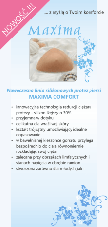 ŚĆ !!! …. z myślą o Twoim komforcie O W O N Nowoczesna linia silikonowych protez piersi MAXIMA COMFORT ź innowacyjna technologia redukcji ciężaru ź ź ź ź ź ź protezy - silikon lżejszy o 30% przyjemna w dotyku delikatna dla wrażliwej skóry kształt trójkątny umożliwiający idealne dopasowanie w bawełnianej kieszonce gorsetu przylega bezpośrednio do ciała równomiernie rozkładając swój ciężar zalecana przy obrzękach limfatycznych i stanach napięcia w obrębie ramion stworzona zarówno dla młodych jak i