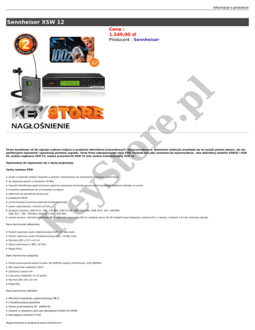Informacje o produkcie Sennheiser XSW 12 Cena : 1.549,00 zł or e. pl Producent : Sennheiser Firma Sennheiser od lat zajmuje czołowe miejsce w produkcji mikrofonów przewodowych i bezprzewodowych. Niemiecka solidność przekłada się na wysoki poziom jakości, ale też perfekcyjnie wykonanie i gwarancja przekazu sygnału. Teraz firma zaproponowała serię XSW. Posiada ona pięć zestawów do wykorzystania : dwa mikrofony wokalne XSW35 i XSW 65 ,zestaw nagłowny XSW 52, zestaw prezenterski XSW 72 oraz zestaw instrumentalny XSW 12. Cechy zestawu XSW St Zapraszamy do zapoznania się z naszą propozycją. prosty w obsłudze zestaw "wszystko w jednym" przeznaczony do zastosowań wokalnych i prezentacji ● do dyspozycji pasmo o szerokości 24 MHz ● kapsuła mikrofonowa pojemnościowa zapewnia optymalną transmisję w warunkach wysokiego natężenia dźwięku na scenie ● 8 banków częstotliwości do 12 presetów w każdym ● odporność na sprzężenia akustyczne ● przełącznik MUTE ● synchronizacja za pomocą zdalnego kanału radiowego ● wybór częstotliwości z krokiem 25 kHz ● dostępne warianty: XSW 52-A : 548...572 MHz ,XSW 35-GB : 606...630 MHz ,XSW 35-B : 614...638 MHz XSW 35-C : 766 - 790 MHz ,XSW 35-E: 821 - 832 MHz ● zestaw zawiera: mikrofon krawatowy ME-2, odbiornik stacjonarny EM 10, nadajnik ręczny SK 20 (nadajnik typu bodypack), zasilacz NT 2, 2 anteny, 2 baterie 1.5V AA ,instrukcja obsługi. K ey ● Dane techniczne odbiornika: ● Poziom wyjściowy audio (zbalansowany):XLR: +14 dBu maks ● Poziom wyjściowy audio (niezbalansowany):Jack: +8 dBu maks ● Wymiary:200 x 127 x 42 mm ● Złącze antenowe:2 x BNC, 50 Ohm ● Waga:730 g Dane techniczne nadajnika ● Pasmo przenoszenia:wejście liniowe :60-16000Hz wejście mikrofonowe :100-16000Hz ● Moc wyjściowe nadajnika :10mV ● Zasilanie:2 baterie AA ● Czas pracy nadajnika :ok 10 godzin ● Wymiary:99 x 66 x 24 mm ● Waga:95g Dane techniczne mikrofon ● Mikrofon krawatowy, pojemnościowy ME-2 ● Charakterystyka:dookólna ● Pasmo przenoszenia:30 - 20000 Hz ● Czułość w otwartym polu bez obciążenia (1kHz):20 mV/Pa ● Wymagane zasilanie (7,5V) Wygenerowano w programie www.oscGold.com ● Złącze mini-jack 3,5mm ● Długość kabla 1,6m Wychodząc naprzeciw naszym klientom z przyjemnością informujemy, że do każdego zakupionego zestawu bezprzewodowego, nasza firma dodaje w prezencie kartę stałego klienta na wykorzystanie softu muzycznego, najlepszego producenta firmy Midi Net o wartości 200 zł Zapoznaj się z naszą propozycją, lepszej i tak nie znajdziesz. K ey St or e. pl [email protected]