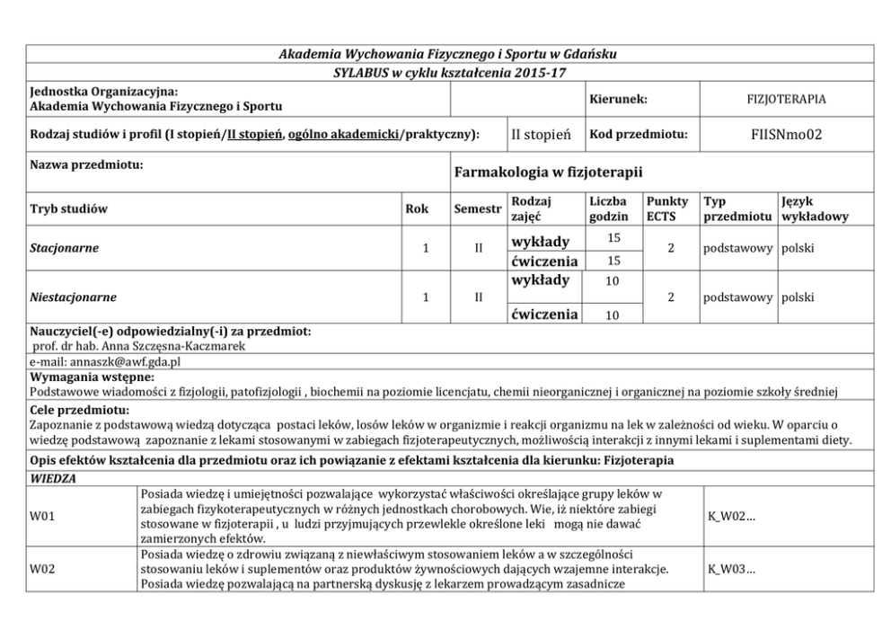 Akademia Wychowania Fizycznego i Sportu w Gdańsku SYLABUS w cyklu kształcenia 2015-17 Jednostka Organizacyjna: Akademia Wychowania Fizycznego i Sportu Rodzaj studiów i profil (I stopień/II stopień, ogólno akademicki/praktyczny): Nazwa przedmiotu: Tryb studiów Stacjonarne Niestacjonarne FIZJOTERAPIA Kierunek: II stopień Kod przedmiotu: FIISNmo02 Farmakologia w fizjoterapii Rok 1 1 Semestr II Rodzaj zajęć wykłady ćwiczenia wykłady Liczba godzin 15 15 Typ Język przedmiotu wykładowy 2 podstawowy polski 2 podstawowy polski 10 II ćwiczenia Punkty ECTS 10 Nauczyciel(-e) odpowiedzialny(-i) za przedmiot: prof. dr hab. Anna Szczęsna-Kaczmarek e-mail: [email protected] Wymagania wstępne: Podstawowe wiadomości z fizjologii, patofizjologii , biochemii na poziomie licencjatu, chemii nieorganicznej i organicznej na poziomie szkoły średniej Cele przedmiotu: Zapoznanie z podstawową wiedzą dotycząca postaci leków, losów leków w organizmie i reakcji organizmu na lek w zależności od wieku. W oparciu o wiedzę podstawową zapoznanie z lekami stosowanymi w zabiegach fizjoterapeutycznych, możliwością interakcji z innymi lekami i suplementami diety. Opis efektów kształcenia dla przedmiotu oraz ich powiązanie z efektami kształcenia dla kierunku: Fizjoterapia WIEDZA Posiada wiedzę i umiejętności pozwalające wykorzystać właściwości określające grupy leków w zabiegach fizykoterapeutycznych w różnych jednostkach chorobowych. Wie, iż niektóre zabiegi W01 stosowane w fizjoterapii , u ludzi przyjmujących przewlekle określone leki mogą nie dawać zamierzonych efektów. Posiada wiedzę o zdrowiu związaną z niewłaściwym stosowaniem leków a w szczególności W02 stosowaniu leków i suplementów oraz produktów żywnościowych dających wzajemne interakcje. Posiada wiedzę pozwalającą na partnerską dyskusję z lekarzem prowadzącym zasadnicze K_W02… K_W03… postępowanie lecznicze u pacjenta skierowanego do zabiegów fizjoterapeutycznych W03 Zna i rozumie zagadnienia oraz potrafi posługiwać się terminologią z zakresu nauk medycznych do których należy farmakologia K_W25… UMIEJĘTNOŚCI U01 U02 U03 Analizuje wpływ leków na organizm człowieka Potrafi krytycznie interpretować informacje z piśmiennictwa oraz wyciągać krytyczne wnioski z badań K_U15 dotyczących wykorzystania leków w zabiegach fizjoterapeutycznych i suplementów diety. Potrafi wykorzystać poglądy innych specjalistów przy formułowaniu opinii na temat określonego postępowania usprawniającego w zakresie określonych grup leków stosowanych w tym postępowaniu Posiada umiejętności inicjowania , organizowania i realizowania działań ukierunkowanych na edukację zdrowotną w zakresie stosowania suplementów diety i leków z grupy OTC. K_U18… K_ U19 KOMPETENCJE K01 K02 K03 Jest świadomy potrzeby uzupełniania i doskonalenia wiedzy w zakresie nowych leków , mechanizmu ich działania i zastosowania w postępowaniu fizjoterapeutycznym Potrafi określić priorytety i przestrzegać zasad etycznych w decyzjach i działaniach podejmowanych w stosunku do pacjenta Promuje zachowania zdrowotne w działalności edukacyjnej i środowisku lokalnym K_K02… K_K05 K_K11 Kryteria i metody oceny osiągniętych efektów kształcenia: Weryfikacja efektów kształcenia W1,W2, W3, U1,U2 w zakresie wiedzy i umiejętności odbywa się na podstawie obecności na ćwiczeniach, dyskusji w trakcie omawiania zagadnień objętych programem w odniesieniu do sytuacji podawania leków z wykorzystaniem metod fizykoterapii np. jonoforezy . Rozwiązywania problemów związanych z polipragmazją , stosowaniem w sposób niekontrolowany leków NLPZ nie objętych kontrolą lekarza lub suplementów żywieniowych. Powyższa weryfikacja jest bieżącą oceną formującą, która służy bezpośrednio procesowi kształcenia. Pozwala dobierać narzędzia poprawiające efektywność procesu kształcenia. Po zakończeniu cyklu ćwiczeń i wykładów przeprowadzone będą pisemne lub ustne dwa kolokwia. Materiał objęty programem i realizowany w formie ćwiczeń będzie podzielony w porządku chronologicznym na dwie części. W oparciu o pytania rozwinięte, otwarte , oceniony będzie stopień przyswojenia materiału i umiejętności wykorzystania wiedzy w postępowaniu fizjoterapeutycznym. Pytania będą formułowane tak , by zweryfikować całościowo opisane wyżej efekty kształcenia, Odpowiedzi na pytania stawiane na kolokwium oceniane są w skali od 0-5 punktów. Student uzyska pozytywne oceny na podstawie 60% i więcej możliwych do zdobycia punktów. Student po zaliczeniu ćwiczeń przystąpi do pisemnego egzaminu. Pytania formułowane będą tak, by zweryfikować całość efektów kształcenia dotyczących wiedzy i umiejętności wynikających z założeń programowych. Odpowiedzi na pytania stawiane na egzaminie oceniane są w skali od 0-5 punktów. Student uzyska pozytywne oceny na podstawie 60% i więcej możliwych do zdobycia punktów. Metody i formy realizacji przedmiotu: Wykład problemowe z prezentacją multimedialną Wykłady – podanie wiedzy aktualnej, opartej o publikacje i podręczniki, opracowanej przez nauczyciela w formie prezentacji PowerPoint , z wykorzystaniem upraszczających i ułatwiających zrozumienie schematów i wykresów oraz podsumowujących wiedzę w zestawieniu tabelarycznym . Ćwiczenia – zajęcia prowadzone w formie konwersatoryjnej. Nauczyciel rozwija nowe treści w nawiązaniu do wiedzy wcześnie podanej studentowi. Student uczestniczy w dyskusji , której treści są ukierunkowane na konkretne spostrzeżenia studenta dotyczące reakcji jego organizmu na leki oraz oddziaływania leku na organizm ze szczególnym uwzględnieniem polipragmazji oraz sposobów podania leku umożliwiających działanie miejscowe na organizm pacjenta. Treści kształcenia: Wykłady: Podstawowe wiadomości o mechanizmach działania leków i receptorach farmakologicznych. Losy leku w ustroju - LADME. 