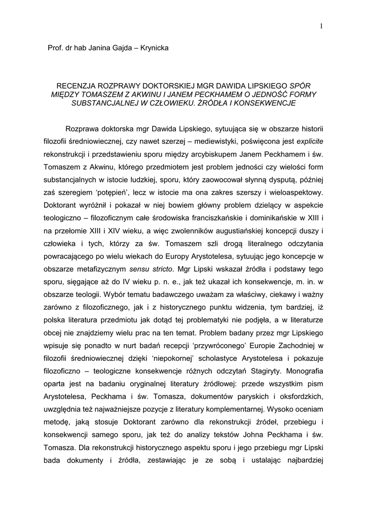 1 Prof. dr hab Janina Gajda – Krynicka RECENZJA ROZPRAWY DOKTORSKIEJ MGR DAWIDA LIPSKIEGO SPÓR MIĘDZY TOMASZEM Z AKWINU I JANEM PECKHAMEM O JEDNOŚĆ FORMY SUBSTANCJALNEJ W CZŁOWIEKU. ŹRÓDŁA I KONSEKWENCJE Rozprawa doktorska mgr Dawida Lipskiego, sytuująca się w obszarze historii filozofii średniowiecznej, czy nawet szerzej – mediewistyki, poświęcona jest explicite rekonstrukcji i przedstawieniu sporu między arcybiskupem Janem Peckhamem i św. Tomaszem z Akwinu, którego przedmiotem jest problem jedności czy wielości form substancjalnych w istocie ludzkiej, sporu, który zaowocował słynną dysputą, później zaś szeregiem ‘potępień’, lecz w istocie ma ona zakres szerszy i wieloaspektowy. Doktorant wyróżnił i pokazał w niej bowiem główny problem dzielący w aspekcie teologiczno – filozoficznym całe środowiska franciszkańskie i dominikańskie w XIII i na przełomie XIII i XIV wieku, a więc zwolenników augustiańskiej koncepcji duszy i człowieka i tych, którzy za św. Tomaszem szli drogą literalnego odczytania powracającego po wielu wiekach do Europy Arystotelesa, sytuując jego koncepcje w obszarze metafizycznym sensu stricto. Mgr Lipski wskazał źródła i podstawy tego sporu, sięgające aż do IV wieku p. n. e., jak też ukazał ich konsekwencje, m. in. w obszarze teologii. Wybór tematu badawczego uważam za właściwy, ciekawy i ważny zarówno z filozoficznego, jak i z historycznego punktu widzenia, tym bardziej, iż polska literatura przedmiotu jak dotąd tej problematyki nie podjęła, a w literaturze obcej nie znajdziemy wielu prac na ten temat. Problem badany przez mgr Lipskiego wpisuje się ponadto w nurt badań recepcji ‘przywróconego’ Europie Zachodniej w filozofii średniowiecznej dzięki ‘niepokornej’ scholastyce Arystotelesa i pokazuje filozoficzno – teologiczne konsekwencje różnych odczytań Stagiryty. Monografia oparta jest na badaniu oryginalnej literatury źródłowej: przede wszystkim pism Arystotelesa, Peckhama i św. Tomasza, dokumentów paryskich i oksfordzkich, uwzględnia też najważniejsze pozycje z literatury komplementarnej. Wysoko oceniam metodę, jaką stosuje Doktorant zarówno dla rekonstrukcji źródeł, przebiegu i konsekwencji samego sporu, jak też do analizy tekstów Johna Peckhama i św. Tomasza. Dla rekonstrukcji historycznego aspektu sporu i jego przebiegu mgr Lipski bada dokumenty i źródła, zestawiając je ze sobą i ustalając najbardziej 2 prawdopodobną wersję zdarzeń. W analizie tekstów filozoficzno – teologicznych natomiast bada i analizuje w aspekcie diachronicznym, zaczynając od Arystotelesa same pojęcia (duszy, formy, materii, aktu – entelechii, relacji: dusza – ciało i in.), ich funkcjonowanie w koncepcjach obu antagonistów, nawiązywanie do Arystotelesa czy ‘arystotelizmu’ św. Augustyna, jak też porównuje np. koncepcje formy u Peckhama i św. Tomasza, szukając podstaw i uzasadnienia dla różnic, przywołując przy tym literaturę przedmiotu. Struktura rozprawy jest przejrzysta i uporządkowana, jakkolwiek mam w związku z nią uwagi, które zamieszczę niżej. Rozprawa składa się ze Wstępu, czterech rozdziałów i Zakończenia, opatrzona jest prawidłowo skomponowana bibliografią. We Wstępie Doktorant przedstawia problem badawczy, metodę badań i – bardzo krótko – status quaestionis, wymieniając najważniejsze pozycje z literatury obcej. Rozdział I: Geneza problematyki jedności i wielości form w człowieku jest poświęcony propedeutyce głównego problemu badawczego : Autor zaczyna od podstawowego źródła – od rekonstrukcji koncepcji formy/morfe, eidos u Arystotelesa, koncentrując sie na roli i funkcji formy u istoty żywej posiadającej duszę rozumną. Mgr Lipski zdaje sobie sprawę z trudności i niejednoznaczności w znanych nam z pism Stagiryty koncepcjach formy substancjalnej, duszy rozumnej, rozumu teoretycznego i praktycznego i ich statusu ontycznego, jak też z wielości rozstrzygnięć w ogromnej literaturze komentatorskiej, lecz fakt ten tylko sygnalizuje (o czym niżej), nie odwołując się do licznych Commentaria ad Aristotelem graeca. Zasadnicze źródło neoaugustyńskich koncepcji wielości form w scholastyce postrzega w traktacie Awicebrona Fons vitae i jego neoplatońskich inspiracjach, pokazując wpływ przetłumaczonego na łacinę traktatu na Peckhama, jak też jego krytykę przez św. Tomasza. Autor omawia również w r. I spory i kontrowersje w kwestii jedności czy wielości form, jakie miały miejsce w XIII wieku, akcentując ostre podziały w tej kwestii między nurtami neoaugustynizmu i tomizmu. W tym rozdziale Doktorant omawia również źródła koncepcji wielości form w poglądach Peckhama, koncentrując się na tych filozofach, których określa mianem ‘autorytetów’ - na św. Augustynie, Bonawenturze, Summie Aleksandra z Hales, Arystotelesie Awicennie, Boecjuszu i Pseudo – Boecjuszu – w takiej właśnie kolejności, ktorą wyznacza sfera wpływów kolejnych myślicieli na Arcybiskupa (i tak, np. Doktorant pokazuje, iż teoria rationes seminales czy duszy jako żródła ruchu i życia, jak też różnego statusu 3 ontycznego duszy i ciała ma u Peckhama .proweniencję augustyńską, koncepcja hierarchii form cielesnych czy duszy jako ens a se jest zainspirowana poglądami Bonawentury...itp). Mgr Lipski, szukając filozoficznych źródeł koncepcji wielości form substancjalnych u Peckhama, bada problem dwuaspektowo : na podstawie bezpośrednich odwołań Arcybiskupa do ‘autorytetów’, jak też na podstawie analizy tekstów, wydobywając z nich bądź to przywoływania, bądź też kontynuacje poglądów wskazanych wyżej myślicieli. Autor wydobywa z tekstów Peckhama również akcenty polemiczne – krytykę koncepcji św. Tomasza. Rozdział II Poglądy i argumentacja Jana Peckhama na rzecz tezy o wielości form w człowieku składa sie z pięciu podrozdziałów, z których cztery są poś