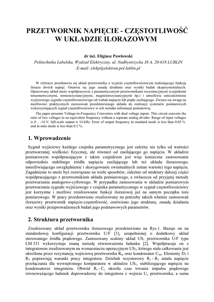 PRZETWORNIK NAPIĘCIE - CZĘSTOTLIWOŚĆ W UKŁADZIE ILORAZOWYM dr inż. Eligiusz Pawłowski Politechnika Lubelska, Wydział Elektryczny, ul. Nadbystrzycka 38 A, 20-618 LUBLIN E-mail: [email protected] W referacie przedstawia się układ przetwornika o wyjściu częstotliwościowym realizującego funkcję ilorazu dwóch napięć. Omawia się jego zasadę działania oraz wyniki badań eksperymentalnych. Opracowany układ może współpracować z parametrycznymi przetwornikami rezystancyjnymi (czujnikami tensometrycznymi, termorezystancyjnymi, magnetorezystancyjnymi itp.) i umożliwia uniezależnienie wyjściowego sygnału częstotliwościowego od wahań napięcia lub prądu zasilającego. Zwraca się uwagę na możliwości praktycznych zastosowań przedstawionego układu do realizacji systemów pomiarowych wykorzystujących sygnał częstotliwościowy w roli nośnika informacji pomiarowej. The paper presents Voltage-to-Frequency Converters with dual voltage inputs. This circuit converts the ratio of two voltages to an equivalent frequency without a separate analog divider. Range of input voltages is 0 .. -14 V, full-scale output is 14 kHz. Error of output frequency in standard mode is less than 0.03 % and in ratio mode is less than 0.2 %. 1. Wprowadzenie Sygnał wyjściowy każdego czujnika parametrycznego jest zależny nie tylko od wartości przetwarzanej wielkości fizycznej, ale również od zasilającego go napięcia. W układzie pomiarowym współpracującym z takim czujnikiem jest więc konieczne zastosowanie odpowiednio stabilnego źródła napięcia zasilającego lub też układu ilorazowego, umożliwiającego uwzględnienie i skorygowanie ewentualnych zmian wartości tego napięcia. Zagadnienie to może być rozwiązane na wiele sposobów, zależnie od struktury dalszej części współpracującego z przetwornikiem układu pomiarowego, a zwłaszcza od przyjętej metody przetwarzania analogowo-cyfrowego. W przypadku zastosowania w układzie pomiarowym przetwarzania sygnału wyjściowego z czujnika parametrycznego w sygnał częstotliwościowy jest korzystne i możliwe zrealizowanie funkcji ilorazowej już na samym początku toru pomiarowego. W pracy przedstawiono zrealizowany na potrzeby takich właśnie zastosowań ilorazowy przetwornik napięcie-częstotliwość, omówiono jego strukturę, zasadę działania oraz wyniki przeprowadzonych badań jego podstawowych parametrów. 2. Struktura przetwornika Zrealizowany układ przetwornika ilorazowego przedstawiono na Rys.1. Bazuje on na standardowej konfiguracji przetwornika U/F [1], uzupełnionej o dodatkowy układ sterowanego źródła prądowego. Zastosowany scalony układ US1 przetwornika U/F typu LM 331 wykorzystuje znaną metodę równoważenia ładunku [2]. Współpracuje on z integratorem zrealizowanym na wzmacniaczu operacyjnym US3, którego stała całkowania jest określona przez rezystancję wejściową przetwornika Rin oraz kondensator Cint. Elementy D3 i R3 poprawiają warunki pracy integratora. Dzielnik rezystorowy R1 - R2 ustala napięcie przełączania dla wewnętrznego komparatora w układzie US1, stabilizującego napięcie na kondensatorze integratora. Obwód Rt - Ct określa czas trwania impulsu prądowego równoważącego ładunek doprowadzony do integratora z wejścia Ux przetwornika, a suma rezystancji P1 i R4 ustala wartość tego prądu, przy czym należy pamiętać, że napięcie na nóżce 2 układu US1 jest stabilizowane przez układy wewnętrzne na wartość 1.89 V (typowo). Zworka J1 ustawiona w pozycji „0” umożliwia skonfigurowanie przetwornika do pracy w układzie standardowym oraz w pozycji „1” do pracy w układzie ilorazowym. Wzmacniacz US2 wraz z tranzystorem T1 i rezystorami R5, R6, P2 tworzy układ źródła prądowego sterowanego napięciem wejściowym Uy. Potencjometry P1 i P2 umożliwiają regulację nachylenia charakterystyki przetwarzania i uzyskanie znamionowej wartości częstotliwości wyjściowej równej 10 kHz. Jednocześnie zastosowanie precyzyjnych wzmacniaczy OP07 o ultraniskim napięciu niezrównoważenia pozwoliło na zrezygnowanie z obwodów regulacji charakterystyki dla początku zakresu. Rys.1. Schemat przetwornika napięcie-częstotliwość w układzie ilorazowym Znamionowy zakres napięć wejściowych Ux i Uy wynosi 0 .. -10V, ale przetwornik pracuje również prawidłowo aż do napięć rzędu -14V. Częstotliwość sygnału wyjściowego Fout dla przetwornika pracującego w układzie standardowym [1] jest określona wzorem (1), a dla układu ilorazowego wzorem (2). Ux R + P1 1 × 4 × 189 . V R in 11 . × R t Ct U R + P2 1 Fout = x × 6 × Uy R in 11 . × R t Ct Fout = (1) (2) 3. Uzyskane parametry Dla zrealizowanego układu przetwornika wyznaczono doświadczalnie jego podstawowe parametry przy pracy w układzie standardowym i ilorazowym. Na Rys.2. przedstawiono względny błąd przetwornika odniesiony do wartości znamionowej Fout = 10 kHz. 0.15 Błąd względny [ % ] 0.10 0.05 0.00 -0.05 -0.10 -0.15 -0.20 0 1 2 3 4 5 6 7 8 9 10 11 12 13 14 15 Napięcie Ux [ V ] Rys.2. Względny błąd przetwornika odniesiony do wartości znamionowej Fout=10 kHz : w układzie standardowym oraz w układzie ilorazowym - dla napięcia Uy od -14 V do -6 V , kolejne wykresy co 1 V Wykres sporządzony dla przetwornika w układzie standardowym w pełni potwierdza jego dane katalogowe [1]: błąd przetwarzania nie przekracza wartości 0.03 % i osiąga największe wartości w połowie zakresu. Również poza katalogowym zakresem przetwarzania błędy mieszczą się w podanym przedziale, praktycznie aż do Ux = -14 V. Wykresy od do przedstawiają analogicznie błędy przetwornika pracującego w układzie ilorazowym, dla napięcia Uy w zakresie od -14 V do -6 V, przy czym kolejne wykresy są wykonane co 1 V. W tym przypadku błędy przetwarzania są większe, nie przekraczają jednak wartości 0.2 %. Należy zwrócić uwagę, że dopuszczalny zakres napięcia wejściowego Ux jest zależny od wart