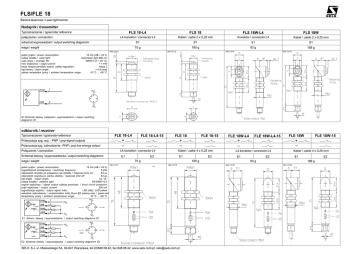 FLS/FLE 18 Bariera laserowa / Laser light barrier Nadajnik / transmitter Typ/oznaczenie / type/order reference po³¹czenie / connection FLS 18-L4 FLS 18 FLS 18W-L4 FLS 18W L4-konektor / connector L4 Kabel / cable 2 x 0,25 mm Konektor / connector L4 Kabel / cable 2 x 0,25 mm S1 S1 S1 S1 schemat wyprowadzeñ / output switching diagramm waga / weight 75 g 180 g 090-13173 83 g 090-13172 188 g 090-13175 090-13174 pobór pr¹du / power consumption: 10 mA (UB = 24 V) laser/laser light 660 nm rodzaj wiat³a / used light: czas pracy / average life: 50000 h (T = 25 °C) moc wyjciowa / output power: < 1 mW klasa bezpieczeñstwa lasera/ safety-regulation: klasa 2 k¹t bariery / beam angle: < 0,5 mrad -10 °C ... +50 °C zakres temperatur pracy / ambient temperature range: br¹z 1 nieb 3 +UB 1 3 -UB S1.Schemat ideowy nadajnika i wyprowadzenia / output switching diagramm S1 odbiornik / receiver FLE 18-L4 Typ/oznaczenie / type/order reference FLE 18-L4-15 FLE 18 + Polaryzacja syg. wyj. - PNP / pnp-signal outputs FLE 18-15 FLE 18W-L4 FLE 18W-L4-15 FLE 18W + + FLE 18W-15 + Polaryzacja syg. zabrudzenia - PNP / pnp-low energy output Po³¹czenie / connection L4-konektor / connector L4 Schemat ideowy i wyprowadzenia / output switching diagramm E1 waga / weight Kabel / cable 4 x 0,25 mm E2 E1 75 g pobór pr¹du / power consumption: 15 mA (UB = 24 V) czêstotliwoæ prze³¹czania / switching frequency: 6 kHz odpowied czujnika po pojawieniu siê obiektu / response time on: 83 µs odpowied czujnika po zaniku obiektu / response time off: 83 µs k¹t wi¹zki / beam angle: ca. 12° rodzaj wiat³a / ambient light EN 60947-5-2 sygna³ wyjciowy / signal output: zabezp.przeciwpr. / short circuit protection pr¹d wyjciowy / output current: 200 mA sygnalizacja wyjcia / output signal indic.: LED ¿ó³ty / LED yellow wskanik zabrudzenia / contamination indic.:Duo-LED zielony-czer. / green-red temperatury pracy / ambient temperature range: -10 °C ... +60 °C +UB br¹z 1 1 +UB 4 czar PNP 4 2 bia³y 2 PNP nieb 3 br¹z 1 PNP czar 4 PNP bia³y 2 nieb 3 090-13177 3 -UB E1. Schem. ideowy i wyprowadzenia / output switching diagramm E1 +UB 1 2 -UB E2 E1 180 g 090-13176 -UB +UB L4-konektor / connector L4 4 3 -UB E2. Schemat ideowy i wyprowadzenia / output switching diagramm E2 SELS S.J. ul. Malawskiego 5A, 02-641 Warszawa, tel 22/848 08 42, fax 848 08 42, www.sels.com.pl, [email protected] Kabel / cable 4 x 0,25 mm E2 E1 83 g 090-13179 E2 188 g 090-13178 FL 18, FL 18W FL 18, FL 18W Laser-Lichtschranke / Laser light barrier Laser-Lichtschranke / Laser light barrier Laserschutzbestimmungen Laser protection regulations Der Sender der Einweg-Laserlichtschranke entspricht der Laserschutzklasse II gemäß EN 60825-1-3/97. Zum Betrieb sind daher keine zusätzlichen Schutzmaßnahmen erforderlich. The transmitter and the laser light barrier comply with laser protection class II in accordance with EN 60825-1-3/97. Therefore no additional protective measures are necessary for operation. Wellenlänge: Strahldivergenz: Impulsleistung: Impulsbreite Impulswiederholfrequenz: Zeitbasis: wavelength: radiation divergence: pulse output: pulse width pulse repetition frequency: time base: l = 660 nm q = 0,5 mrad Pp < 1,5 mW t = 7 µs F = 30 kHz T = 250 ms l = 660 nm q = 0.5 mrad Pp < 1.5 mW t = 7 µs F = 30 kHz T = 250 ms Einstellanweisung Adjustment instructions Um die maximale Genauigkeit (siehe Diagramm) zu erreichen muß, nachdem die Lichtschranke justiert wurde, der Strahlfleck an der Abfragestelle auf seine kleinsten Abmessungen eingestellt werden. Hierzu wird an der Abfragestelle ein weißes Papier in den Lichtstrahl gehalten und der Strahlfleck durch Verdrehen der Senderoptik mit dem Fokussierwerkzeug auf minimale Größe eingestellt. Das Poti am Empfänger muß nun so eingestellt werden, daß bei nicht unterbrochener Lichtschranke die LED "OUT" gelb und die LED "Verschmutzung" grün leuchtet. To achieve maximum accuracy (see the diagram), the point of light must be set to its minimum dimensions at the scanning point after the light barrier has been adjusted. To do this, a piece of white paper is held in the light beam at the scanning point and the point of light is set to its minimum size by turning the transmitter optic with the focussing tool. The pot on the receiver must then be set so that the LED „OUT“ lights yellow and the LED „Contamination“ lights green when the light barrier is not broken. 04/99 Potentiometer potentiometer red OUT Schaltzustandsanzeige output signal indicator 0,05 0,04 0,03 0,02 0 20 40 60 80 100 Reichweite Sender - Empfänger in cm distance transmitter - receiver in cm kleinstes erkennbares Teil in mm minimum detectable part in mm Genauigkeitsdiagramm accuracy diagram kleinstes erkennbares Teil in mm minimum detectable part in mm Bedienfeld server field 068-13164 - visible scanning point - Genauigkeit durch Strahlfleckgröße einstellbar - adjustable accuracy with size of radiated light point - kleinstes erkennbares Teil 0,03 mm - minimum detectable part 0.03 mm - Reichweite bis 50 m - range up to 50 m - Schaltfrequenz 6 kHz - switching frequency 6 kHz Funktionsprinzip Functional principle Der Sender arbeitet mit rotem Laserlicht (660 nm), wodurch der Abtastpunkt auch in einer Entfernung von 50 m noch gut sichtbar ist. Der Sendestrahl kann mit dem mitgelieferten Einstellschlüssel so fokussiert werden, daß der Strahlfleck an der Stelle, wo der Gegenstand abgefragt werden soll, den kleinsten Durchmesser und somit die maximale Auflösung aufweist. Das gleichbleibende Drehmoment der unverlierbaren Optik erleichtert dem Anwender diese Einstellarbeit. Durch Fokussieren ist es möglich, auch bei großen Reichweiten kleine Teile ab einem Durchmesser von 0,03 mm sicher zu erkennen und zu positionieren. Da der Sender der Laserschutzklasse II entspricht sind keine besonderen Schutzmaßnahmen notwendig. The transmitter operates with red laser light (660 nm) which means that the scanning point is well visible even at 