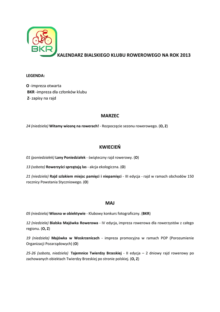 kalendarz bialskiego klubu rowerowego na rok 2013 marzec