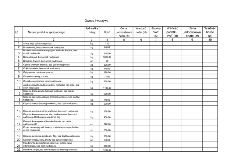 Owoce i warzywa Lp. 1 1 2 3 4 5 6 7 8 9 10 11 12 13 14 15 16 17 18 19 20 21 22 Nazwa produktu spożywczego 2 Jednostka miary Ilość 3 4 Arbuz. Bez oznak nadpsucia kg 110 Brzoskwinia,świeża,bez oznak nadpsucia Buraki czerwone,konsumpcyjne, wielkość średnia, bez oznak nadpsucia kg 65,00 kg 630,00 Banan-klasa I, bez oznak nadpsucia kg 1000,00 Botwinka.Świeża, bez oznak nadpsucia szt 70 Cebula-wielkość średnia, bez oznak nadpsucia kg 520,00 Cukinia,świeża, bez oznak nadpsucia kg 60,00 Cytryna-bez oznak nadpsucia kg 120,00 Czosnek-krajowy,zdrowy kg 17,00 Gruszka-soczsta,bez oznak nadpsucia kg 350,00 kg 1100,00 kg 620,00 kg 90,00 Kapusta młoda-średniej wielkości, bez cech nadpsucia kg 200,00 Kapusta włoska-średniej wielkośći, bez cech nadpsucia Kapusta kwaszona-jasna, nie przekwaszona, bez cech nadpsucia.Opakowanie-wiaderko 5kg kg 100,00 kg 900,00 szt 320,00 szt 650,00 Kapusta pekińska-główka ok. 1kg, bez śladów nadpsucia kg 250,00 Kalafior-świeży, biały,zwarty bez oznak nadpsucia Mandarynka bezpestkowa-soczysta, skórka łatwo odchodząca, bez cech nadpsucia szt 50,00 kg 800,00 Marchew-umyta,bez cech nadpsucia,średniej wielkości kg 1360,00 Jabłka-soczyste,słodkie,średniej wielkości, nie obite, bez cech nadpsucia Kapusta biała-główka średniej wielkości, bez oznak nadpsucia Kapusta czerwona-główka średniej wielkości, bez śladów nadpsucia Kiwi-sztuka(na palecie)twarde,dojrzałe,bez cech nadpsucia,kl I Koper zielony-pęczek świeży, o właściwym zapachu,bez oznak nadpsucia Cena jednostkowa netto (zł) 5 Wartość netto (zł) 6 Stawka VAT (%) 7 Wartość podatku VAT (zl) 8 Cena jednostkowa brutto (zł) 9 Wartość brutto (zł) 10 23 24 25 26 27 28 29 30 31 32 33 34 35 36 37 38 39 Nektaryna,śwrieża, bez cech nadpsucia Ogórek zielony-świeży, gruntowy lub szklarniowy(w zależności od sezonu),twardy, bez cech nadpsucia Ogórek kwaszony-nie przekwaszony, bez cech nadpsucia. Opakowanie-wiaderko 3kg kg 150,00 kg 980,00 kg 460,00 Papryka czerwona-jędrna, dojrzała,bez cech nadpsucia kg 230,00 kg 600,00 kg 820,00 Pietruszka korzeń-zdrowy, nie zdrewniały,bez cech nadpsucia Pomarańcza-gładka,jasna,o cieńkiej skórce,klasa I, średnie wielkości Pomidor-zdrowy, bez cech nadpsucia kg Por-zdrowy,bez cech nadpsucia kg Pieczarka-świeża, bez oznak nadpsucia Pietruszka natka-pęczek świeży, o właściwym zapachu,bez oznak nadpsucia kg 280,00 szt 980,00 820,00 90,00 Rzepa biała, świeża, bez cech nadpsucia Rzodkiewka pęczek-czerwona, okrągła,średniej wielkości, bez oznak nadpsucia kg 100,00 szt 360,00 Seler-biały,średniej wielkości,bez oznak nadpsucia kg 480,00 Szczypior-pęczek,zdrowy, bez oznak nadpsucia szt 530,00 Ziemniaki-konsumpcyjne,nie nadmrożone,skórka bez zielonych zabarwień i kiełkujących oczek. kg 10 000,00 Szałata lodowa-świeża,bez oznak nadpsucia szt 65,00 Sałata-świeża,zielona,bez oznak nadpsucia szt 235,00 RAZEM WARTOŚĆ NETTO WARTOŚĆ PODATKU VAT CENA BRUTTO (z podatkiem VAT)