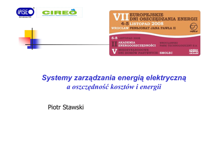 Systemy zarządzania energią elektryczną a oszczędność kosztów i energii Piotr Stawski ZałoŜenia polityki energetycznej w UE Styczeń 2007 - Action Plan Sformułowano tam 3 cele strategiczne dla UE: •20% energii ze źródeł odnawialnych do 2020 w tym 10% udział w rynku biopaliwa, •Redukcja emisji CO2 o 20% (30%), •Poprawa efektywności energetycznej o 20% (działania na rzecz oszczędności energii) 23 stycznia 2008 Komisja Europejska przedstawiła pakiet zintegrowanych działan na rzecz ochrony klimatu Climate Action. Zielona księga w sprawie racjonalizacji zuŜycia energii 22.6.2005 r. UE mogłaby w uzasadniony ekonomicznie sposób obniŜyć obecne zuŜycie energii o co najmniej 20%, co odpowiada kwocie 60 mld euro rocznie lub sumarycznemu obecnemu zuŜyciu energii przez Niemcy i Finlandii Szczególne środki polityki energetycznej: Budynki, urządzenia gospodarstwa domowego, transport, Białe certyfikaty-instrumenty rynkowe Propagowanie najlepszych praktyk i technologii 50% efektów – regulacje prawne, 40% - postęp techniczny Podstawowe technologie – gospodarstwa domowe www –automatyzacja i zarządzanie Sieci rozdzielcze - podstawowe obszary oszczędności energii elektrycznej • Systemy sterowania oświetleniem – gminy, budynki uŜyteczności publicznej, hotele, gospodarstwa domowe • Systemy zarządzania danymi energii (AMR, AMM) • Inteligentny dom (Home Automation) Oświetlenie W około 80% domów nadal uŜywane są zwykłe Ŝarówki.Skumulowana wartość energii zuŜywanej przez Ŝarówki jest znaczna. Ich wymiana na bardziej efektywne źródła, tylko dla europejskich konsumentów, przyniosłaby oszczędności rzędu ponad 5-8 mld EUR rocznie oraz redukcję emisji CO2 o 20 milionów ton. śarówki są najmniej wydajnymi energetycznie lampami - większość pobieranej energii, bo aŜ 95% przetwarzają na energię cieplną. Cena jednej sztuki wynosi około 75 centów EUR, zaś koszt zuŜytej energii wynosi 5 EUR. Zastosowanie energooszczędnej świetlówki kompaktowej, chociaŜ początkowo wiąŜe się z wyŜszym wydatkiem związanym z ceną zakupu, to jednak rocznie moŜe przynieść oszczędności energii rzędu do 12 EUR rocznie. Dodatkowo trwałość lamp kompaktowych rzędu 6 lat moŜe przynieść dodatkowe oszczędności wysokości do 72 EUR. 100 watowa Ŝarówka zuŜywa 0.15 euro pkw/h, trwałość 1000 godzin "Najlepiej oświetlona gmina w Polsce" Wsparcie programów modernizacji oświetlenia ze środków unijnych Przykłady modernizacji oświetlenia ... Philips Sukces story: oświetlenie Oslo Oświetlenie w obrębie miasta Oslo to około 55 tysięcy opraw ulicznych. Eksploatacja tak wielkiej liczby opraw ulicznych pochłania około 6 mln Euro rocznie. Szukając oszczędności w eksploatacji systemu oświetlenia ulicznego, władze Oslo postanowiły zainwestować środki w budowę inteligentnego systemu, który pozwoli nim zarządzać. Modernizacja oświetlenia ulicznego w Oslo przyniosła nieoczekiwane rezultaty - obniŜono zuŜycie energii o 70%!! Systemy AMR (Automatic Meter Reading) Korzyści dla społeczeństwa: •MoŜliwość sterowania popytem (Demand Side Management), aktywne bilansowanie np.w szczytach •MoŜliwość optymalizacji zuŜycia energii – mniejsza emisja •Wzmocnienie konkurencji –obniŜanie cen energii •Optymalizacja pracy sieci – szansa na zmniejszenie skali inwestycji sieciowych ENEL – marzec 2006, sukces story (drobni odbiorcy) 03.2006 docelowo Liczba zainstalowanych liczników Liczba zainstalowanych koncentratorów 27.394.194 30.100.000 Liczba odebranych, przetestowanych liczników 25.535.347 Liczba odebranych przetestowanych koncentratorów 345.698 325.827 350.000 Koszt aplikacji systemów AMR AMR -rozkład kosztów to: instalacja 50% (Ins),, instalacja i utrzymanie 15% (Ser), telekomunikacja 15% (Tel), system odczytu 10% (Od), szkolenia i rozwój 5% (Sz), inne koszty 5% (Inne). 50 45 40 35 30 25 20 15 10 5 0 Ins Ser Tel Od Sz Inne Koszt kapitału i hardware’u PLC Technologies Technologie systemów AMR USA: przykład - instalacja $20 milionów, AMR + Wi-Fi, Oszczędności - $30 milionów w stosunku do $50 milionów na system tradycyjny w ciągu 20 lat WaŜniejsze funkcje systemów AMM Zarządzanie popytem energii (DSM) Inteligentny budynek radykalne oszczędności kosztów eksploatacji z takim systemem, dochodzące do 35%. zamian otrzymujemy radykalne oszczędności kosztów eksploatacji z takim systemem, dochodzące do 35% Koszty systemu Szacunkowe ceny netto systemu inteligentnego budynku w obiektach prywatnych. Obejmują koszt kompletnej instalacji (projekt, okablowanie, rozdzielnice, urządzenia EIB, gniazdka, włączniki, uruchomienie systemu) Dokładna wycena systemu zostanie bezpłatnie przygotowana po przedstawieniu projektu oraz uzgodnieniu oczekiwań klienta. Sterowanie oświetleniem – 200zł/m2 Sterowanie oświetleniem i ogrzewaniem – 300zł/m2 Sterowanie oświetleniem, ogrzewaniem i roletami- 400zł/m2 Koncepcje Smart-connection, Open AMI, Home Automation Advanced Metering Infrastructure (AMI)Home Area Network (HAN) Interface Options Consumer Owned Utility Owned Third-Party Access Provider Private Fixed Networks WAN/LAN Third-Party Access Provider RDS/FM or pager broadcast PSTN/DSL/Cable/Satellite WAN/LAN 2-way 2-way 1-way 2-way Any interval meter or pole-top collector 2-way 1. Secure Wireless 2.To be determined 3.Up to 45 active protocols RF-TX Any gateway 1 2-way 2-way •Special box •Router •Media PC •Security panel • …….. and/or PLC-TX² Energy Mgmt Expansion port Control 2-way Broadband TV, music HAN Protocols³ EIA 721 Zigbee Insteon EIA 709 HomePlug Bluetooth Z-wave T24 PCT 2-way 2-way *Graphics Courtesy UCA International Users Group, Utility AMI WG Appliances On Site Generation Plug-in EV Koncepcja HAN (Home Area Network) Problematyka bezpieczeństwa systemów AMR PLC Network Security MP Meter Management System LS Da ta Signals in the field are transported via power lin