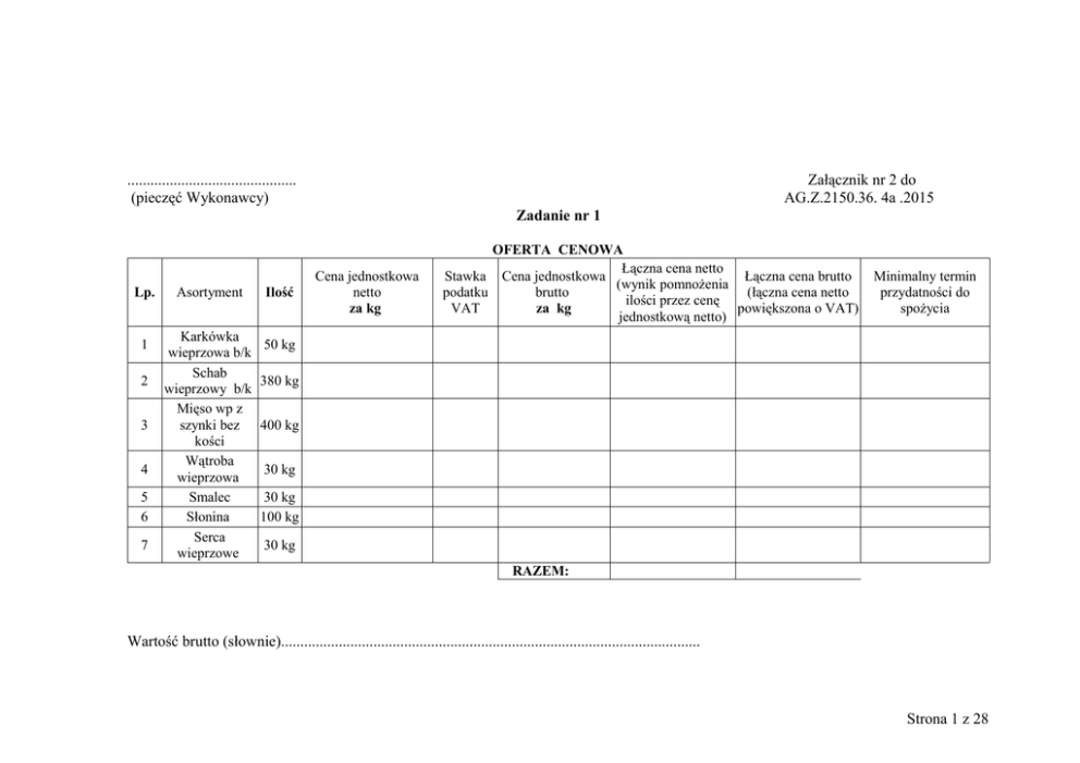 ............................................ (pieczęć Wykonawcy) Załącznik nr 2 do AG.Z.2150.36. 4a .2015 Zadanie nr 1 Lp. 1 2 3 4 5 6 7 Asortyment Karkówka wieprzowa b/k Schab wieprzowy b/k Mięso wp z szynki bez kości Wątroba wieprzowa Smalec Słonina Serca wieprzowe Ilość Cena jednostkowa netto za kg OFERTA CENOWA Łączna cena netto Stawka Cena jednostkowa Łączna cena brutto (wynik pomnożenia podatku brutto (łączna cena netto ilości przez cenę VAT za kg powiększona o VAT) jednostkową netto) Minimalny termin przydatności do spożycia 50 kg 380 kg 400 kg 30 kg 30 kg 100 kg 30 kg RAZEM: Wartość brutto (słownie)............................................................................................................. Strona 1 z 28 Wymagania: - mięso wyłącznie z hodowli krajowych − wszystkie wyroby muszą posiadać czytelną i trwałą metkę z nazwą i datą pakowania/produkcji,terminem przydatności,wagą, oraz nazwą dostawcy ,alergenami spożywczymi. − mięso wyłącznie świeże (nie rozmrożone) − termin przydatności do spożycia : mięso-72 godz. podroby- 48 godz. − Dostawy trzy razy w tygodniu ( poniedziałek,środa,piątek) w godz. 7.30-9.00 − do każdej dostawy wymagany dokument HDI − wraz z ofertą wymagane oświadczenie o wprowadzonym systemie HACCP i na wniosek Zamawiającego przedstawi stosowny dokument. ................................................................ podpis osoby uprawnionej /upoważnionej * Strona 2 z 28 ............................................ (pieczęć Wykonawcy) Załącznik nr 2 do AG-Z.2150-36/ 4a /2015 Zadanie nr 2 OFERTA CENOWA Lp. Asortyment Ilość 1 2 Polędwica wp wędzona Kiełbasa golonkowa Baleron wp wędzony gotowany Boczek wędzony gotowany Kiełbasa krakowska Kiełbasa lunchon meat Kiełbasa wp szynkowa Kiełbasa mortadela Kiełbasa łopatkowa Kiełbasa zwyczajna Kiszka pasztetowa Krupnioki śląskie w jelicie cienkim serdelki (130-150g ) Salceson włoski lub ozorkowy 20 kg 15 kg 3 4 5 6 7 8 9 10 11 12 13 Cena jednostkowa netto za kg Łączna cena netto Stawka Cena jednostkowa (wynik pomnożenia podatku brutto ilości przez cenę VAT za kg jednostkową netto) Łączna cena Minimalny brutto (łączna termin cena netto przydatności do powiększona o spożycia VAT) 30 kg 60 kg 20 kg 20 kg 100 kg 50 kg 50 kg 60 kg 80 kg 45 kg 30 kg Strona 3 z 28 14 15 16 17 18 Golonkowa prasowana parzona Pieczeń wieprzowa Kiełbasa miodowa Parówki drobiowe Szynka drobiowa 40 kg 20 kg 100 kg 60 kg 180 kg RAZEM: Wartość brutto (słownie)........................................................................................................... Wymagania: - wszystkie wyroby muszą posiadać czytelną i trwałą metkę z nazwą i datą pakowania/produkcji,terminem przydatności,wagą, oraz nazwą dostawcy ,alergenami spożywczymi - wędliny wyłącznie świeże (nie rozmrożone) - termin przydatności do spożycia min – 7 dni - dostawy trzy razy w tygodniu ( poniedziałek,środa,piątek) w godz. 7.30-9.00 - do każdej dostawy wymagany dokument HDI - wraz z ofertą wymagane oświadczenie o wprowadzonym systemie HACCP i na wniosek Zamawiającego przedstawi stosowny dokument. …............................................................... podpis osoby uprawnionej /upoważnionej * Strona 4 z 28 ….......................................... (Pieczęć Wykonawcy) Załącznik nr 2 do AG-Z.2150-36/ 4a /2015 Zadanie nr 3 OFERTA CENOWA Lp. Asortyment Śmietana 18% homegenizowana op.800g Śmietana 12% 2. homegenizowana op.400g Kefir op.250 ml lub 3. Kefir op.200ml Serek wiejski ziarnisty 4 op.200g Serki homogenizowane 5 150g (waniliowe lub brzoskwinowe) Jogurt owocowy 150g 6 (truskawka,jagoda, brzoskwinia) Jogurt naturalny 2% op.150 7 lub Jogurt naturalny 2% op.180 1. Ilość Cena jednostkowa netto za /szt Stawka podatku VAT Cena jednostkowa brutto za / szt. Łączna cena Łączna cena netto (wynik brutto (łączna pomnożenia cena netto ilości przez cenę powiększona o jednostkową VAT) netto) Minimalny termin przydatności do spożycia 300 szt 150 szt 1760 szt 2200 szt 100 szt 2600 szt 1000 szt 700 szt 583 szt RAZEM: Strona 5 z 28 Wartość brutto (słownie)........................................................................................................... Wymagania: - dostawy trzy razy w tygodniu ( poniedziałek,środa,piątek) w godz. 7.30-9.00 - do każdej dostawy wymagany dokument HDI - wraz z ofertą wymagane oświadczenie o wprowadzonym systemie HACCP i na wniosek Zamawiającego przedstawi stosowny dokument. Opakowanie jednostkowe musi zawierać poniższe informacje: - nazwa producenta - nazwa produktu - pojemność opakowaniach - termin przydatności do spożycia - warunki przechowywania - alergeny spożywcze W dniu dostawy termin przydatności do spożycia minimum 14 dni od dnia dostawy. …....…....…................................................. podpis osoby uprawnionej /upoważnionej * Strona 6 z 28 ….......................................... (Pieczęć Wykonawcy) Załącznik nr 2 do AG-Z.2150-36/ 4a /2015 Zadanie nr 4 OFERTA CENOWA Lp. Asortyment Ser żółty w blokach 2-3 kg zamojski-pełnotłusty 2. Ser fetta w kostce 200 g 1. Ilość Cena jednostkowa netto za kg Stawka podatku VAT Cena jednostkowa brutto za kg. Łączna cena Łączna cena netto (wynik brutto (łączna pomnożenia cena netto ilości przez cenę powiększona o jednostkową VAT) netto) Minimalny termin przydatności do spożycia 60 kg 4 kg RAZEM: Wartość brutto (słownie)........................................................................................................... Wymagania: - dostawy trzy razy w tygodniu ( poniedziałek,środa,piątek) w godz. 7.30-9.00 - do każdej dostawy wymagany dokument HDI - wraz z ofertą wymagane oświadczenie o wprowadzonym systemie HACCP i na wniosek Zamawiającego przedstawi stosowny dokument. Strona 7 z 28 Opakowanie jednostkowe musi zawierać poniższe informacje: - nazwa producen