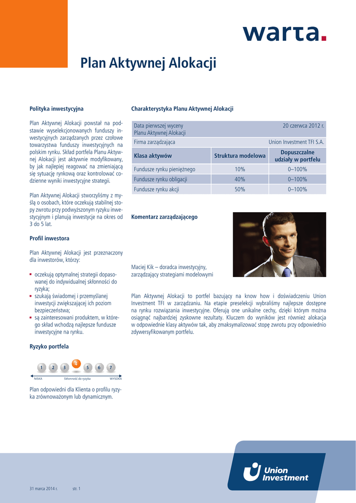 Plan Aktywnej Alokacji Polityka inwestycyjna Charakterystyka Planu Aktywnej Alokacji Plan Aktywnej Alokacji powstał na podstawie wyselekcjonowanych funduszy inwestycyjnych zarządzanych przez czołowe towarzystwa funduszy inwestycyjnych na polskim rynku. Skład portfela Planu Aktywnej Alokacji jest aktywnie modyfikowany, by jak najlepiej reagować na zmieniającą się sytuację rynkową oraz kontrolować codzienne wyniki inwestycyjne strategii. Plan Aktywnej Alokacji stworzyliśmy z myślą o osobach, które oczekują stabilnej stopy zwrotu przy podwyższonym ryzyku inwestycyjnym i planują inwestycje na okres od 3 do 5 lat. Data pierwszej wyceny Planu Aktywnej Alokacji 20 czerwca 2012 r. Firma zarządzająca Union Investment TFI S.A. Struktura modelowa Dopuszczalne udziały w portfelu Fundusze rynku pieniężnego 10% 0–100% Fundusze rynku obligacji 40% 0–100% Fundusze rynku akcji 50% 0–100% Klasa aktywów Komentarz zarządzającego Profil inwestora Plan Aktywnej Alokacji jest przeznaczony dla inwestorów, którzy: JJ JJ JJ oczekują optymalnej strategii dopasowanej do indywidualnej skłonności do ryzyka; szukają świadomej i przemyślanej inwestycji zwiększającej ich poziom bezpieczeństwa; są zainteresowani produktem, w którego skład wchodzą najlepsze fundusze inwestycyjne na rynku. Ryzyko portfela 1 2 NISKA 3 4 5 Sk∏onnoÊç do ryzyka 6 7 WYSOKA Plan odpowiedni dla Klienta o profilu ryzyka zrównoważonym lub dynamicznym. 31 marca 2014 r. str. 1 Maciej Kik – doradca inwestycyjny, zarządzający strategiami modelowymi Plan Aktywnej Alokacji to portfel bazujący na know how i doświadczeniu Union Investment TFI w zarządzaniu. Na etapie preselekcji wybraliśmy najlepsze dostępne na rynku rozwiązania inwestycyjne. Oferują one unikalne cechy, dzięki którym można osiągnąć najbardziej zyskowne rezultaty. Kluczem do wyników jest również alokacja w odpowiednie klasy aktywów tak, aby zmaksymalizować stopę zwrotu przy odpowiednio zdywersyfikowanym portfelu. Wyniki inwestycyjne Planu Plan Aktywnej Alokacji Aktualna wartość 1m 3m 6m 1 rok YTD Od dnia pierwszej wyceny* 113,10 PLN -0,93% -0,16% 0,74% 5,99% -0,16% 13,10% * Data pierwszej wyceny Planu Aktywnej Alokacji: 20.06.2012 r. 18% Zmiana stopy zwrotu 16% 14% Plan Aktywnej Alokacji Stopa zwrotu 12% 10% 8% 6% 4% 2% 0% -2% 20.06.2012 Alokacja aktywów QUERCUS Agresywny 8,52% 20.09.2012 20.12.2012 20.03.2013 20.06.2013 20.09.2013 20.12.2013 31.03.2014 UniKorona Akcje 7,59% Aviva Polskich Akcji 7,46% Noble Fund Akcji 7,43% PKO Obligacji Długoterminowych 4,78% ING Gotówkowy 15,21% ING Obligacji 4,57% UniKorona Pieniężny 20,68% UniKorona Obligacje 4,07% Skarbiec Depozytowy 3,54% Allianz Akcji Plus 0,02% UniAkcje Małych i Średnich Spółek 3,25% Allianz Selektywny 0,02% Skarbiec Małych i Średnich Spółek 2,76% Lokaty 0,34% Aviva Obligacji 2,70% Investor Akcji Dużych Spółek 1,15% UniAkcje: Nowa Europa 2,50% UniObligacje: Nowa Europa 1,44% Skarbiec Akcja 1,97% Z każdą strategią inwestycyjną związane są określone czynniki ryzyka wskazane w Umowie o zarządzanie portfelem instrumentów finansowych zawartej pomiędzy TUnŻ „WARTA” S.A. a Union Investment Towarzystwo Funduszy Inwestycyjnych S.A., w skład którego wchodzi jeden lub więcej instrumentów finansowych, oraz w Prospekcie informacyjnym świadczenia usług zarządzania portfelem instrumentów finansowych przez Union Investment Towarzystwo Funduszy Inwestycyjnych S.A. Union Investment Towarzystwo Funduszy Inwestycyjnych S.A. uzyskało zezwolenie Komisji Papierów Wartościowych i Giełd (obecnie: Komisja Nadzoru Finansowego) na rozszerzenie przedmiotu działalności o zarządzanie cudzym pakietem papierów wartościowych na zlecenie (obecnie: działalność polegająca na zarządzaniu portfelami, w skład których wchodzi jeden lub więcej instrumentów finansowych). Komisja Nadzoru Finansowego nie jest organem, który zatwierdził lub zaaprobował zasady świadczenia usługi. Wszelkie opinie i oceny zawarte w niniejszym opracowaniu wyrażają opinie Ubezpieczyciela w dniu jego wydania. Opracowanie przygotowano dochowując należytej staranności, wykorzystując źródła informacji, które Ubezpieczyciel uważa za wiarygodne i dokładne, jednakże nie istnieje gwarancja, iż są one wyczerpujące i w pełni odzwierciedlają stan faktyczny. Wykresy i diagramy przedstawione w niniejszym opracowaniu mają charakter wyłącznie ilustracyjny, nie są one ani doradztwem inwestycyjnym, ani prognozą. Ubezpieczyciel nie świadczy usług doradztwa inwestycyjnego ani nie udziela porad inwestycyjnych, a informacje nie mają w żadnym wypadku charakteru porady inwestycyjnej. Szczegółowe informacje dotyczące umowy ubezpieczenia znajdują się w Ogólnych Warunkach Ubezpieczenia dostępnych w placówkach Ubezpieczyciela i/lub stronie internetowej www.warta.pl. Przed zawarciem umowy Klient samodzielnie określa poziom akceptowalnego przez siebie ryzyka, potencjalne korzyści oraz straty z nią związane, jak również w szczególności charakterystykę, konsekwencje prawne, podatkowe i księgowe umowy. Powielanie bądź publikowanie niniejszego opracowania lub jego części bez pisemnej zgody Ubezpieczyciela jest zabronione. Niniejszy materiał nie stanowi oferty w rozumieniu art. 66 Kodeksu cywilnego. 31 marca 2014 r. str. 2