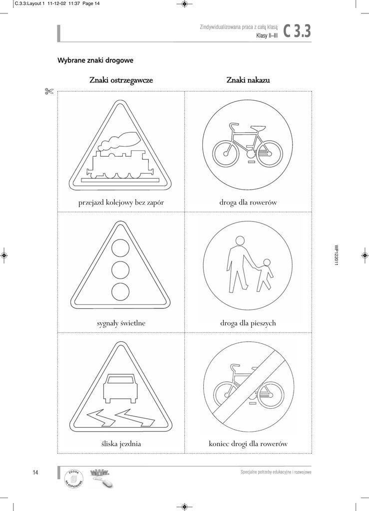 C.3.3:Layout 1 11-12-02 11:37 Page 14 Zindywidualizowana praca z całà klasà Klasy II–III C 3.3 Wybrane znaki drogowe Znaki ostrzegawcze Znaki nakazu przejazd kolejowy bez zapór droga dla rowerów sygnały Êwietlne droga dla pieszych Êliska jezdnia koniec drogi dla rowerów ✄ WP122011 NA KO Specjalne potrzeby edukacyjne i rozwojowe ODA E ZG NI 14 PIO WA C.3.3:Layout 1 11-12-02 11:37 Page 15 C 3.3 Zindywidualizowana praca z całà klasà Klasy II–III Znaki zakazu Znaki informacyjne zakaz wjazdu rowerów przejazd dla rowerzystów zakaz ruchu pieszych przejÊcie dla pieszych zakaz u˝ywania sygnałów dêwi´kowych przystanek autobusowy WP122011 ✄ NA KO 15 ODA E ZG NI Specjalne potrzeby edukacyjne i rozwojowe PIO WA C.3.3:Layout 1 11-12-02 11:37 Page 16 Zindywidualizowana praca z całà klasà Klasy II–III C 3.3 Szablon sygnalizacji Êwietlnej WP122011 NA KO Specjalne potrzeby edukacyjne i rozwojowe ODA E ZG NI 16 PIO WA C.3.3:Layout 1 11-12-02 11:37 Page 17 C 3.3 Zindywidualizowana praca z całà klasà Klasy II–III Ania i Basia idà do szkoły – opowiadanie Ania i Basia idà do szkoły – Oh, patrz – krzykn´ła Ania – jakie pi´kne maki rosnà po drugiej stronie drogi! – RzeczywiÊcie – zachwyciła si´ Basia i a˝ stan´ła wpatrzona – jak fajnie by było, gdybyÊmy mogły je zobaczyç z bliska! Niestety, od łàki usianej makami dzieliła dziewczynki ruchliwa ulica, a przejÊcie znajdowało si´ prawie przy samej szkole. Gdyby dziewczynki poszły tamt´dy na łàk´, na pewno nie zdà˝yłyby na lekcje. – Co tu robiç – szepn´ła Basia – tak bardzo chciałabym im si´ lepiej przyjrzeç, mogłybyÊmy je narysowaç albo zerwaç dla pani… – rozmarzyła si´. W tym momencie Ania wpadła na pewien pomysł… Specjalne potrzeby edukacyjne i rozwojowe NA KO 17 ODA E ZG NI WP122011 Zaczàł si´ pi´kny i słoneczny dzieƒ. Ania i Basia, uczennice III klasy szkoły podstawowej, jak co dzieƒ umówiły si´ na wspólnà drog´ do szkoły. Droga ta nie była zbyt długa, za to bardzo ciekawa. Dziew czynki mieszkały na przedmieÊciach du˝ego miasta i w drodze do szkoły mijały jeden mały drewniany mostek, pod którym płynàł szumiàcy strumyczek. Potem najcz´Êciej szły chodnikiem biegnàcym wzdłu˝ ruchliwej ulicy, po której jeêdziło zwykle wiele samochodów zmierzajàcych ka˝dego ranka do miasta. Z obu stron tej ruchliwej szosy znajdowały si´ przepi´kne łàki. Wiosnà i latem mieniły si´ one ró˝nymi kolorami – a to ˝ółte, zielone, a to niebieskie i chyba najpi´kniejsze – te czerwone – od maków. PIO WA C.3.3:Layout 1 11-12-02 11:37 Page 18 Zindywidualizowana praca z całà klasà Klasy II–III C 3.3 Karta pracy A1 Ania i Basia idà do szkoły 1 Przeczytajcie jeszcze raz historyjk´ Ania i Basia idà do szkoły, a nast´pnie: l ustalcie wspólnie w grupie, co mogło si´ dalej zdarzyç, l zapiszcie w kilku zdaniach zakoƒczenie historyjki. WP122011 NA KO Specjalne potrzeby edukacyjne i rozwojowe ODA E ZG NI 18 PIO WA C.3.3:Layout 1 11-12-02 11:37 Page 19 C 3.3 Zindywidualizowana praca z całà klasà Klasy II–III Karta pracy B1 Ania i Basia idà do szkoły 1 Przeczytajcie jeszcze raz historyjk´ Ania i Basia idà do szkoły. Wybierzcie spoÊród podanych ni˝ej zdaƒ takie, które opisuje najlepsze, Waszym zdaniem, zachowanie dziewczynek. PodkreÊlcie to zdanie. l l l 2 Zapiszcie wybrane przez Was zdanie. Dlaczego je wybraliÊcie? Specjalne potrzeby edukacyjne i rozwojowe NA KO 19 ODA E ZG NI WP122011 l Dziewczynki pobiegły pr´dko do szkoły i postanowiły, ˝e po lekcjach poproszà mam´, ˝eby wybrała si´ z nimi na spacer na t´ łàk´. Dziewczynki czekały, a˝ b´dzie jechało mniej samochodów, i przebiegły przez jezdni´. Ania i Basia długo zastanawiały si´, co zrobiç, nie mogły znaleêç dobrego pomysłu, wi´c postanowiły, ˝e spytajà o to panià w szkole. Dziewczynki postanowiły, ˝e narysujà w szkole maki, które widziały z daleka, albo wykonajà w domu podobne maki z krepiny. PIO WA C.3.3:Layout 1 11-12-02 11:37 Page 20 Zindywidualizowana praca z całà klasà Klasy II–III C 3.3 Karta pracy C1 Ania i Basia idà do szkoły 1 Przeczytajcie jeszcze raz historyjk´ Ania i Basia idà do szkoły. 2 Uzupełnijcie tekst brakujàcymi wyrazami. Mo˝ecie wykorzystaç wyrazy znajdujàce si´ w ramce. Ania i Basia długo zastanawiały się, co zrobić. Nie mogły znaleźć na pomysłu, jak się szybko przedostać stronę i postanowiły, że spytają o to w szkole. w szkole kwiaty, które widziały z daleka, albo wykonają w domu podobne maki z . postanowiły, że po lekcjach poproszą mamę, żeby wybrała się z nimi na spacer na tę łąkę. Wyrazy do wykorzystania: Ania i Basia l dobrego l panià l drugà l krepiny l narysujà NA KO Specjalne potrzeby edukacyjne i rozwojowe ODA E ZG NI 20 PIO WA WP122011 Dziewczynki postanowiły, że C.3.3:Layout 1 11-12-02 11:37 Page 21 C 3.3 Zindywidualizowana praca z całà klasà Klasy II–III Karta pracy A2 Zasady bezpiecznego zachowania si´ na drodze Miejsce na Twój rysunek: Specjalne potrzeby edukacyjne i rozwojowe NA KO 21 ODA E ZG NI WP122011 1 Wybierz jednà z zasad bezpiecznego poruszania si´ po drodze, o których dotychczas rozmawialiÊmy. Zapisz jà i narysuj do niej ilustracj´. PIO WA C.3.3:Layout 1 11-12-02 11:37 Page 22 Zindywidualizowana praca z całà klasà Klasy II–III C 3.3 Karta pracy B2 Zasady bezpiecznego zachowania si´ na drodze 1 Wska˝ ilustracj´, na której dziecko przestrzega jednej z zasad bezpiecznego poruszania si´ po drodze. Pokoloruj t´ ilustracj´. WP122011 2 Zapisz, jaka to jest zasada – czego ona dotyczy. NA KO Specjalne potrzeby edukacyjne i rozwojowe ODA E ZG NI 22 PIO WA C.3.3:Layout 1 11-12-02 11:37 Page 23 C 3.3 Zindywidualizowana praca z całà klasà Klasy II–III Karta pracy C2 Zasady bezpiecznego zachowania si´ na drodze WP122011 1 Wska˝ ilustracj´, na której dziecko przestrzega jednej z zasad bezpiecznego 