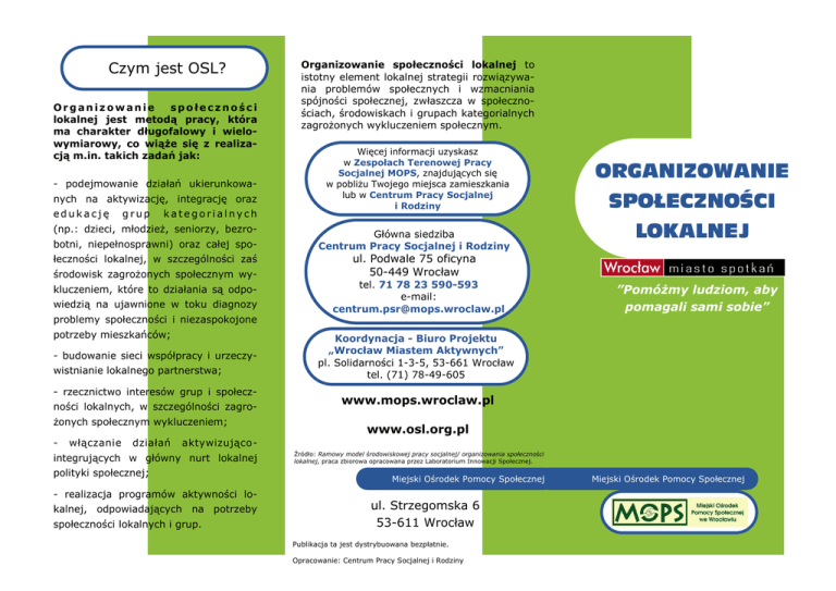 Czym jest OSL? Organizowanie społeczności lokalnej jest metodą pracy, która ma charakter długofalowy i wielowymiarowy, co wiąże się z realizacją m.in. takich zadań jak: - podejmowanie działań ukierunkowanych na aktywizację, integrację oraz edukację grup kategorialnych (np.: dzieci, młodzież, seniorzy, bezrobotni, niepełnosprawni) oraz całej społeczności lokalnej, w szczególności zaś środowisk zagrożonych społecznym wykluczeniem, które to działania są odpowiedzią na ujawnione w toku diagnozy problemy społeczności i niezaspokojone potrzeby mieszkańców; - budowanie sieci współpracy i urzeczywistnianie lokalnego partnerstwa; - rzecznictwo interesów grup i społeczności lokalnych, w szczególności zagrożonych społecznym wykluczeniem; - włączanie działań Organizowanie społeczności lokalnej to istotny element lokalnej strategii rozwiązywania problemów społecznych i wzmacniania spójności społecznej, zwłaszcza w społecznościach, środowiskach i grupach kategorialnych zagrożonych wykluczeniem społecznym. Więcej informacji uzyskasz w Zespołach Terenowej Pracy Socjalnej MOPS, znajdujących się w pobliżu Twojego miejsca zamieszkania lub w Centrum Pracy Socjalnej i Rodziny Główna siedziba Centrum Pracy Socjalnej i Rodziny ORGANIZOWANIE SPOŁECZNOŚCI LOKALNEJ ul. Podwale 75 oficyna 50-449 Wrocław tel. 71 78 23 590-593 e-mail: [email protected] ”Pomóżmy ludziom, aby pomagali sami sobie” Koordynacja - Biuro Projektu „Wrocław Miastem Aktywnych” pl. Solidarności 1-3-5, 53-661 Wrocław tel. (71) 78-49-605 www.mops.wroclaw.pl www.osl.org.pl aktywizująco- integrujących w główny nurt lokalnej polityki społecznej; - realizacja programów aktywności lokalnej, odpowiadających na potrzeby społeczności lokalnych i grup. Źródło: Ramowy model środowiskowej pracy socjalnej/ organizowania społeczności lokalnej, praca zbiorowa opracowana przez Laboratorium Innowacji Społecznej. Miejski Ośrodek Pomocy Społecznej ul. Strzegomska 6 53-611 Wrocław Publikacja ta jest dystrybuowana bezpłatnie. Opracowanie: Centrum Pracy Socjalnej i Rodziny Miejski Ośrodek Pomocy Społecznej Wdrażane w Ośrodku PROGRAMY AKTYWNOŚCI LOKALNEJ jako narzędzia OSL: AKTYWNY SZCZEPIN Zespół Terenowej Pracy Socjalnej Nr 1 pl. Legionów 4-5 tel. 71 78 22 486 [email protected] AKTWNA LEŚNICA Zespół Terenowej Pracy Socjalnej Nr 2 ul. Średzka 42, tel. 71 34 92 859, [email protected] AKTYWNY GĄDÓW Zespół Terenowej Pracy Socjalnej Nr 3 ul. Oficerska 9 a, tel. 71 78 22 432 [email protected] AKTYWNE GAJOWICE Zespół Terenowej Pracy Socjalnej Nr 4 ul. Oficerska 9 a, tel. 71 78 22 450 [email protected] AKTYWNE HUBY Zespół Terenowej Pracy Socjalnej Nr 5 ul. Kniaziewicza 29 a, tel. 71 33 52 377 [email protected] AKTYWNE PRZEDMIEŚCIE OŁAWSKIE Zespół Terenowej Pracy Socjalnej Nr 6 ul. Kniaziewicza 29, tel.71 33 52 385, [email protected] AKTYWNY OŁBIN Zespół Terenowej Pracy Socjalnej Nr 8 ul. Nowowiejska 29, tel. 71 78 23 555 [email protected] Człowiek - najlepsza inwestycja AKTYWNY PLAC GRUNWALDZKI Zespół Terenowej Pracy Socjalnej Nr 9 ul. Nowowiejska 102, tel. 71 78 23 562 [email protected] PAL– NOCLEGOWNIA Zespół ds. Osób Bezdomnych i Uchodźców ul. Zachodnia 3, tel. 71 78 23 584 [email protected] AKTYWNE NADODRZE Zespół Terenowej Pracy Socjalnej Nr 7 pl. Św. Macieja 4 tel. 71 78 22 422/425 [email protected] Programy Aktywności Lokalnej są częścią projektu „Wrocław Miastem Aktywnych” współfinansowanego ze środków Unii Europejskiej w ramach Europejskiego Funduszu Społecznego Publikacja ta jest dystrybuowana bezpłatnie. AKTYWNA POLANKA i AKTYWNY ZAKRZÓW Zespół Terenowej Pracy Socjalnej Nr 10 ul. Braniborska 6/8, tel. 71 77 25 991 [email protected]