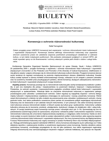 BIURO BADAŃ I ANALIZ BIULETYN nr 88 (333) • 6 grudnia 2005 • © PISM • nr egz. ............................................ Redakcja: Sławomir Dębski (redaktor naczelny), Adam Eberhardt, Maciej Krzysztofowicz, Łukasz Kulesa, Emil Pietras (sekretarz Redakcji), Edyta Posel-Częścik Konwencja o ochronie różnorodności kulturowej Rafał Tarnogórski Celem przyjętej przez UNESCO konwencji jest wspieranie i ochrona różnorodności treści kulturowych i wypowiedzi artystycznych. Konwencja zawiera definicję różnorodności kulturowej oraz zapewnia stronom suwerenne prawo do udzielenia wsparcia podmiotom prowadzącym działalność w zakresie kultury, w tym także instytucjom publicznym. Nie podważa zobowiązań podjętych w ramach WTO, ale może wywołać spory co do finansowania i ochrony własnych rynków jeśli chodzi o dobra i usługi kulturalne. Konferencja Generalna Organizacji Narodów Zjednoczonych do spraw Oświaty, Nauki i Kultury (UNESCO) 20 października 2005 r. przyjęła Konwencję o wspieraniu i ochronie różnorodności treści kulturowych i wypowiedzi artystycznych (Convention on the Protection and Promotion of the Diversity of Cultural Expressions). Zdefiniowano w niej główne zasady i pojęcia odnoszące się do różnorodności kulturowej (cultural diversity). Przyjęcie konwencji stanowi wyraz tendencji do regulacji normatywnej na poziomie międzynarodowym obszaru działalności kulturalnej. Kwestie kultury zostały wpisane w szerszy kontekst zrównoważonego rozwoju, wskazano na ich związek z prawami człowieka oraz na suwerenny charakter praw przysługujących państwu, stronie konwencji, służących zabezpieczeniu różnorodności treści kulturowych i wypowiedzi artystycznych na jego terytorium. Aspekty prawne. Konwencja powołuje się na różnorodność kulturową jako cechę konstytutywną ludzkości i podkreśla, iż jest ona niezbędna dla pokoju i bezpieczeństwa na poziomach lokalnym, krajowym i międzynarodowym. Potwierdza, że wolność wyrażania i rozpowszechniania poglądów umożliwia rozkwit treści kulturowych i wypowiedzi artystycznych w społeczeństwie. Wskazuje także na znaczenie różnorodności kulturowej w zapewnieniu pełnego przestrzegania praw człowieka i podstawowych wolności. Celem regulacji są najogólniej wsparcie i ochrona dialogu między kulturami i międzynarodowa współpraca zmierzająca do zachowania i rozwoju przedmiotu konwencji. Wśród zasad sformułowanych w tekście nie tylko znalazło się poszanowanie praw człowieka i podstawowych wolności, równej godności kultur, lecz także podkreślono suwerenne prawo państw do prowadzenia polityki wspierającej różnorodność kulturową oraz do stosowania w tym zakresie różnych instrumentów, w tym prawnych. Dla celów konwencji różnorodność kulturowa oznacza różnorodność działań, w których wyraża się kultura grup i społeczeństw. Instrumenty i polityka kulturalna odnoszą się do tworzenia, produkcji, udostępniania, dystrybucji i dostępu do działalności, dóbr i usług kulturalnych. W swojej zasadniczej części konwencja normuje prawa i obowiązki stron (art. 5–19). Sprowadzają się one do potwierdzenia suwerennego prawa do opracowania, utrzymania i wdrażania polityk i instrumentów wspierania i ochrony różnorodności kulturowej dla umocnienia międzynarodowej współpracy w osiągnięciu celów konwencji. Każda ze stron może podjąć na swoim terytorium takie środki (w postaci odpowiednich polityk i instrumentów), jakie zapewnią wsparcie i ochronę różnorodności treści kulturowych i wypowiedzi artystycznych. Na mocy konwencji tworzy się Międzynarodowy Fundusz Różnorodności Kulturowej oraz organy konwencji w postaci Konferencji Stron oraz Komitetu Międzyrządowego. Obsługę administracyjną zapewni sekretariat UNESCO, strony konwencji zobowiązane są do cyklicznego (co 4 lata) składania raportów z zastosowania środków w przedmiocie regulowanym przez konwencję. Szeroko określono zakres podmiotowy konwencji, umożliwiając przystąpienie do niej nie tylko państwom, lecz także organizacjom regionalnej integracji ekonomicznej oraz samozarządzającym terytoriom mającym zdolność traktatową, lecz jeszcze nie niepodle- 1568 Polski Instytut Spraw Międzynarodowych głym (art. 27). Wejście w życie określono datą złożenia 30 instrumentu ratyfikacyjnego bądź innego aktu, za pomocą którego strona konwencji wyraża zgodę na związanie się jej postanowieniami. Konwencja przewiduje możliwość zgłaszania poprawek i wypowiedzenia. Rozbudowane przepisy określają kwestie członkostwa organizacji regionalnej integracji ekonomicznej, podając zasady głosowania przez organizację i jej członków. Prawa organizacji i jej członków nie mogą być wykonywane jednocześnie. Organizacja dysponuje liczbą głosów równą liczbie jej członków, prawo głosu zaś przysługuje, albo organizacji jako całości albo jej członkom. Aspekty polityczne. Pod tekstem konwencji podpisało się 148 członków UNESCO, sprzeciw wyraziły tylko Stany Zjednoczone i Izrael. Argumenty sformułowane przez Francję i Kanadę, państwa najbardziej aktywne w promowaniu tego aktu, wsparte autorytetem Komisji Europejskiej, okazały się bardziej przekonujące dla większości. Mimo uznania przez konwencję różnorodności kulturowej jako wartości chronionej przez społeczność międzynarodową, głównym celem regulacji jest usankcjonowanie możliwości wsparcia podmiotów krajowych prowadzących działalność w zakresie kultury (cel protekcjonistyczny). Zważywszy na podwójny, gospodarczy i kulturalny zarazem, charakter usług i dóbr kulturalnych, państwa sprzeciwiły się przede wszystkim poddaniu zasadom rynkowym wrażliwego sektora audiowizualnego. Dodatkowym czynnikiem jest to, iż w UE powszechnie dotuje się produkty kulturalne w imię różnorodności językowej lub kulturowej, co można postrzegać jako zakłócenie k