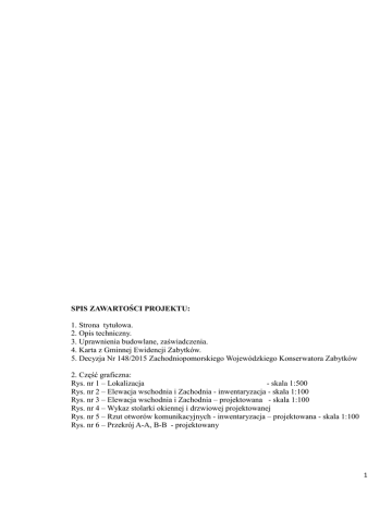 SPIS ZAWARTOŚCI PROJEKTU: 1. Strona tytułowa. 2. Opis techniczny. 3. Uprawnienia budowlane, zaświadczenia. 4. Karta z Gminnej Ewidencji Zabytków. 5. Decyzja Nr 148/2015 Zachodniopomorskiego Wojewódzkiego Konserwatora Zabytków 2. Część graficzna: Rys. nr 1 – Lokalizacja - skala 1:500 Rys. nr 2 – Elewacja wschodnia i Zachodnia - inwentaryzacja - skala 1:100 Rys. nr 3 – Elewacja wschodnia i Zachodnia – projektowana - skala 1:100 Rys. nr 4 – Wykaz stolarki okiennej i drzwiowej projektowanej Rys. nr 5 – Rzut otworów komunikacyjnych - inwentaryzacja – projektowana - skala 1:100 Rys. nr 6 – Przekrój A-A, B-B - projektowany 1 1. DANE OGÓLNE. 1.1. Lokalizacja obiektu budowlanego. 73-200 Choszczno ul. Westerplatte 1 dz. nr 258/3 obr. 3 m. Choszczno. 1.2. Inwestor robót budowlanych. Publiczne Gimnazjum 73-200 Choszczno ul. Westerplatte 1 1.3. Podstawa opracowania. - zlecenie opracowania dokumentacji projektowo – kosztorysowej, - uzgodnienia z inwestorem zakresu robót budowlanych, - wizja terenowa i pomiary inwentaryzacyjne remontowanego obiektu, - przedmiar robót budowlanych, - podstawy kosztorysowania robót budowlanych – m.in. KNR, KSNR, - wyceny indywidualne robót budowlanych nieokreślonych w KNR, KSNR, 1.4. Zakres remontu. Remont obejmuje wymianę istniejącej stolarki okiennej i drzwiowej oraz wykonanie poszerzenia dwóch otworów komunikacyjnych w budynku dydaktycznym „A” Publicznego Gimnazjum w Choszcznie. Roboty remontowe obejmują wymianę istniejącej drewnianej stolarki okiennej i drzwiowej na nową stolarkę okienną i drzwiową z profili PCV oraz poszerzenie dwóch otworów komunikacyjnych. W trakcie wymiany stolarki jak i wykonaniu poszerzeń przewidziano również remont – naprawę parapetów zewnętrznych oraz roboty naprawcze po wymianie stolarki i wykonaniu poszerzeń otworów komunikacyjnych polegające na odtworzeniu okładzin ściennych i ich malowania farbami emulsyjnymi. 2. ZAKRES ROBÓT BUDOWLANYCH. Zakresem robót remontowych w budynku Gimnazjum jest: - demontaż i montaż stolarki okiennej zewnętrznej, - demontaż i montaż stolarki drzwiowej zewnętrznej do budynku, - demontaż i montaż nadproży dwóch otworów komunikacyjnych z ich poszerzeniem, - oczyszczenie i pomalowanie zewnętrznych parapetów blaszanych, - wykonanie napraw wyprawy tynkarskiej wraz z pomalowaniem. Projekt obejmuje montaż okiennej z ciepłych, wysokoudarowych profili PCV. Szyby bezpieczne. Nowa stolarka okienna i drzwiowa o podziale identycznym jak obecna. Okienne wewnętrzne jak i uzupełnienie braków w tynku przy otworach i drzwiowe ościeża komunikacyjnych otynkowane i pomalowane farbami emulsyjnymi. 3. DANE DOTYCZĄCE MATERIAŁÓW BUDOWLANYCH. 3.1. DANE OGÓLNE. Podstawowe wymagania dla drzwi i okien zwarte w art. 5.1. Prawa budowlanego dotyczą: • bezpieczeństwa konstrukcji, • bezpieczeństwa użytkowania, • bezpieczeństwa pożarowego, • ochrony przed hałasem i drganiami, • oszczędności energii i odpowiedniej izolacyjności cieplnej, • odpowiednich warunków higieniczno-zdrowotnych i ochrony środowiska. 2 Zgodnie z Prawem Budowlanym za dopuszczone do obrotu i stosowania, w przypadku okien i drzwi uznaje się takie wyroby, na które: • wystawiono certyfikat zgodności zgodnie z dokumentacją odniesienia (norma wyrobu, a w przypadku jej braku aprobata techniczna ITB), • zostały w określonym trybie dopuszczone do jednostkowego stosowania, • oznaczono je znakiem budowlanym „B”. Stolarka budowlana powinna odpowiadać ocenie zgodności z normą zharmonizowaną PNEN 14351-1:2006 „Okna i drzwi zewnętrzne bez właściwości dotyczących odporności ogniowej i dymoszczelności”. Ocena drzwi i okien pod względem bezpieczeństwa konstrukcji i użytkowania dokonywana jest na podstawie normy zharmonizowanej PN-EN 14351-1:2006. Ocenie zgodności z normą, podlegają cechy stolarki, które zdecydowanie wpływają na bezpieczeństwo, ale także na warunki klimatyczne i komfort pomieszczeń, podczas całego okresu użytkowania. Cechami jakimi powinna odznaczać się stolarka są: • odporność na obciążenie wiatrem - czyli zdolność do przenoszenia sił parcia i ssania, jakie działają na poszczególne elementy stolarki. Badanie odporności na obciążenie wiatrem przeprowadza się wg PN-EN 12211:2001 „Okna i drzwi. Odporność na obciążenie wiatrem. Metoda badania”, • wodoszczelność - okna i drzwi powinny być odporne na przepuszczanie wody pod ciśnieniem. Jego wysokość uzależniona jest od siły wiatru przypisanej danej strefie obciążenia wiatrem oraz wysokości budynku. Badanie wodoszczelności przeprowadza się zgodnie z normą PN-EN 1027:2001 „Okna i drzwi. Wodoszczelność. Klasyfikacja” na całych zestawach okienno drzwiowych lub na poszczególnych elementach, • przepuszczalność powietrza - stolarka powinna przepuszczać powietrze w taki sposób, aby zapewnić odpowiednie wietrzenie pomieszczenia przy jednoczesnym ograniczeniu strat ciepła. Badanie szczelności przeprowadza się zgodnie z normą PN-EN 12207:2001 „Okna i drzwi. Przepuszczalność powietrza .Klasyfikacja”, • przenikalność cieplna - jest bardzo ważną cechą stolarki okiennej i drzwiowej. Wpływa znacząco na koszty ogrzewania budynku; wyraża się ją współczynnikiem przenikania ciepła U ; jego wartość jest zależna od strefy klimatycznej rodzaju i wysokości budynku co jest zawarte w przepisach techniczno prawnych, • przenikalność akustyczna - okna i drzwi mają za zadanie skutecznie chronić przed dźwiękami docierającymi z zewnątrz do wnętrza budynku; ich zdolności pochłaniania dźwięku powinna być dostosowane do warunków jakie wymusza otoczenie danego obiektu. Oprócz wszystkich parametrów technicznych jakie cechują stolarkę, musi być wygodna, estetyczna łatwa w utrzymaniu i użytkowaniu. Funkcjonalność i wygoda użytkowania stolarki zależy od sposobu otwierania skrzydeł. 3.1. STOLARKA OKI