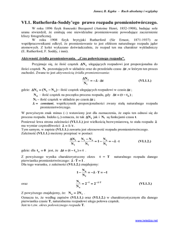Janusz B. Kępka – Ruch absolutny i względny VI.1. Rutheforda-Soddy’ego prawo rozpadu promieniotwórczego. W roku 1896 fizyk francuski Becquerel (Antoine Henri, 1852-1908), badając sole uranu stwierdził, że emitują one niewidzialne promieniowanie powodujące zaczernienie kliszy fotograficznej. W roku 1908 fizyk brytyjski Rutherford (Sir Ernest, 1871-1937) ze współpracownikami odkrył, że promieniowanie to jest efektem naturalnego rozpadu jąder atomowych. Z kolei wykazano doświadczalnie, że rozpad ten ma charakter wykładniczy (E. Rutherford, F. Soddy, i inni). Aktywność źródła promieniowania. „Czas połowicznego rozpadu”. Przyjmuje się, że ilość cząstek DN t ulegających rozpadowi jest proporcjonalna do ilości cząstek Nt pozostających w układzie oraz do przedziału czasu Dt ,w którym ten proces zachodzi. Zwane to jest aktywnością źródła promieniowania: DN t = - l × Dt Nt (VI.1.1.) gdzie: DN t = ( N t - N o ) – ilość cząstek ulegających rozpadowi w czasie Dt ; N o – ilość cząstek na początku procesu rozpadu, gdy Dt = (t - t o ) ; Nt – ilość cząstek w układzie po czasie Dt ; l = constant, współczynnik proporcjonalności zwany stałą naturalnego rozpadu promieniotwórczego. W powyższym znak minus (-) wstawiony jest dla zaznaczenia, że zapis ten odnosi się do procesu rozpadu. Indeks (t ) oznacza, że tak DN t jak i Nt są funkcjami czasu t. Ponieważ lewa strona zależności (VI.1.1.) jest wielkością bezwymiarową, to stała rozpadu l ma wymiar częstodliwości: l = 1 / t . Tym samym, w zapisie (VI.1.1.) zawarta jest okresowość rozpadu promieniotwórczego. Zależność (VI.1.1.) możemy przepisać w postaci: DN t N t - N o N = = 1 - o = -l × t Nt Nt Nt (VI.1.2.) gdzie: dla t o = 0 jest, że Dt = (t - t o ) = t . Z powyższego wynika charakterystyczny okres t = T pierwiastka promieniotwórczego: l × T = 1 . Dla tego warunku, z zależności (VI.1.2.) znajdujemy: 1oraz naturalnego rozpadu danego No = - l × T = -1 Nt Nt = 2 -1 = 2 - l ×T No (VI.1.3.) Z powyższego znajdujemy, że: N o = 2N t . Oznacza to, że według zapisów (VI.1.1.) oraz (VI.1.2.) w charakterystycznym dla danego pierwiastka czasie T, naturalnemu rozpadowi ulega połowa cząstek. Jest to t.zw. okres połowicznego rozpadu T. www.iwiedza.net Janusz B. Kępka – Ruch absolutny i względny Z bezpośrednich obserwacji wynika, że dla różnych pierwiastków różne są okresy T, a tym samym różne są stałe rozpadu l = 1 / T . Z zapisów (VI.1.2.) oraz (VI.1.3.) wynika, że dla dowolnego czasu t możemy napisać: N t = N o × 2 - h×t (VI.1.4.) gdzie, dla ułatwienia dalszych rozważań, zmieniliśmy oznaczenie stałej l na h. Fig. VI.1.1. Rozpad promieniotwórczy według zależności (V.1.4), gdzie: R = Nt/No . Tak więc, powyższa zależność, podana tutaj po raz pierwszy w literaturze przedmiotu, jest złożeniem okresowości rozpadu (okres połowicznego rozpadu) według przyjętej zależności (VI.1.1.), oraz wykładniczego charakteru tego rozpadu według Rutherforda-Soddy’ego. „Literaturowe prawo rozpadu promieniotwórczego ”. W t.zw. „literaturze przedmiotu” wykładniczy charakter rozpadu promieniotwórczego wywodzi się z zależności (VI.1.1.), przy narzuconych warunkach: - DN ® - dN Dt ® dt üï ý ïþ co może budzić poważne wątpliwości, ponieważ dla cząstek materialnych o skończonych wymiarach i istniejących w skończonym czasie, nie istnieje coś takiego jak: dN czy dt. Pozostawiono natomiast oznaczenie stałej l naturalnego rozpadu promieniotwórczego. Tak więc, tylko i wyłącznie ze sztucznie narzuconego formalizmu matematycznego (ale nie jako prawo przyrody!), zależność (VI.1.1.) przepisywana jest w postaci: dN = - l dt N Całkując obydwie strony powyższego równania, znajdujemy: ln N t = - l × t + constant Przyjmuje się, że dla t = 0 całkowita ilość jąder przed rozpadem wynosi No , i mamy: ln N t = - l × t + ln N o czyli www.iwiedza.net Janusz B. Kępka – Ruch absolutny i względny N t = N o × e - l ×t (VI.1.5.) Zależność (VI.1.5.) przedstawiana jest w „literaturze przedmiotu” jako zapis wykładniczego rozpadu pierwiastków promieniotwórczych według Rutherforda, Soddy’ego, i innych. W powyższym występuje okresowość t = t rozpadu promieniotwórczego: t = 1 / l . Dla tego warunku, z zależności (VI.1.5.), znajdujemy: Nt 1 = = 0,3678... No e gdzie: Nt – ilość cząstek jaka pozostaje w układzie po okresie t rozpadu. A to oznacza, że w okresie czasu t rozpadowi ulega znacznie więcej niż połowa cząstek znajdujących się na początku procesu rozpadu danego pierwiastka. A to także oznacza, że według zależności (VI.1.5.) nie istnieje okres T połowicznego rozpadu (patrz: zależność VI.1.3.). Z tego właśnie względu, dla zależności (VI.1.5.) wprowadzono „poprawkę” w postaci czasu połowicznego rozpadu T: ü ï ï ý ï ï þ NT 1 lT = e- × = No 2 T= ln 2 l (VI.1.6.) Uwzględniając powyższe, zależność (VI.1.5.) można, a nawet należy przepisać w postaci: Nt = No × e - l ×t = No × e -(ln 2 )× t T = N o × (e ln 2 ) - t T = N o × 2 - h×t (VI.1.7.) Ale to oznacza, że za pomocą warunków (VI.1.6.) zależność (VI.1.5.) sprowadzona jest do zależności (VI.1.4.). Pytanie: jeżeli rzeczywiście istnieje okres połowicznego naturalnego rozpadu pierwiastków promieniotwórczych, który można opisać prostą zależnością (VI.1.4.), to po co w nauce stosowana jest zależność (VI.1.5.) ze sztucznie narzuconym warunkiem (VI.1.6.) ? „That is the question”! Z powyższego wprost wynika, że opis rozpadu pierwiastków promieniotwórczych za pomocą równań (VI.1.5.) oraz (VI.1.6) może budzić poważne wątpliwości merytoryczne. www.iwiedza.net