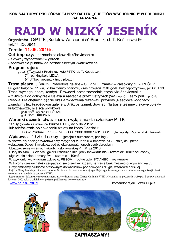 KOMISJA TURYSTYKI GÓRSKIEJ PRZY O/PTTK „SUDETÓW WSCHODNICH” W PRUDNIKU ZAPRASZA NA RAJD W NIZKÝ JESENÍK Organizator: O/PTTK „Sudetów Wschodnich” Prudnik, ul. T. Kościuszki 56, tel.77 4363941 Termin: 11.06. 2016r. Cel imprezy: - poznanie szlaków Nizkého Jesenika - aktywny wypoczynek w górach - zdobywanie punktów do odznak turystyki kwalifikowanej Program rajdu: godz. 700wyjazd z Prudnika, koło PTTK, ul. T. Kościuszki 705 parking koło LIDLA 900 Jiříkov, początek trasy pieszej Trasa piesza: JIŘIKOV, Pradědova galerie – SOVINEC, zamek – Valšovský dúl - REŠOV Długość trasy: ok. 11 km, 260m różnicy poziomu, czas przejścia: 3.00 godz. bez odpoczynków, pkt GOT 13. Trasa wymaga dobrej kondycji. Prowadzi przez zachodnią część Nizkého Jesenika – z Jiříkova do doliny rzeki Oslava a następnie przez Ostrý vrch (520 mnpm) i Lesný (540mnpm) do Rešova. Dla chętnych będzie okazja zwiedzenia rezerwatu przyrody „Rešovské vodopády”. Zwiedzimy też Pradědovou galerie w Jiříkove, zamek Sovinec. Na trasie też inne ciekawe obiekty krajoznawcze, miejsca widokowe 00 godz.18 wyjazd z REŠOVA 00 godz.20 PRUDNIK Warunki uczestnictwa: impreza wyłącznie dla członków PTTK Zapisy (opłata za udział) w Biurze PTTK, do 5.06 2016r. lub telefonicznie po dokonaniu wpłaty na konto Oddziału: BS w Prudniku nr 06 8905 0000 2000 0000 1401 0001 tytuł wpłaty: Rajd w Niski Jesionik Wpisowe: 40 zł od osoby - (przejazd autobusem, parkingi) Wpisowe nie podlega zwrotowi przy rezygnacji z udziału w imprezie na 7 i mniej dni przed wyjazdem. Dzieci i młodzież pod opieką upoważnionych osób dorosłych. Ubezpieczenie w ramach składki członkowskiej PTTK za 2016r. Bilety do zamku Sovinec i galerii Pradziada kupujemy indywidualnie – razem ok. 150kč od osoby, ulgowe dla dzieci i emerytów – razem ok. 100kč Wyżywienie we własnym zakresie, REŠOV – restauracja, SOVINEC – restauracje W korony czeskie należy zaopatrzyć się przed wyjazdem, na trasie brak możliwości wymiany walut. Przypominamy o ubiorze stosownym do warunków pogodowych i długiej wędrówki górskiej. Rajd w Nizky Jesenik jest imprezą non-profit, nie ma charakteru komercyjnego. Rajd organizowany jest na zasadach samoorganizacji siłami wolontariatu , zgodnie ze statutem PTTK. Regulamin jest dokumentem wewnętrznym, zatwierdzonym przez Zarząd Oddziału PTTK w Prudniku na podstawie art.10 pkt. 3 ustawy z dnia 24 kwietnia 2003 roku o działalności pożytku publicznego i o wolontariacie. komandor rajdu: Józek Hupka www.prudnik.pttk.pl ZAPRASZAMY!