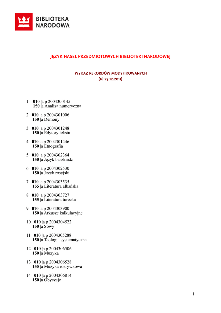 JĘZYK HASEŁ PRZEDMIOTOWYCH BIBLIOTEKI NARODOWEJ WYKAZ REKORDÓW MODYFIKOWANYCH (16-23.12.2011) 1 010 |a p 2004300145 150 |a Analiza numeryczna 2 010 |a p 2004301006 150 |a Demony 3 010 |a p 2004301248 150 |a Edytory tekstu 4 010 |a p 2004301446 150 |a Etnografia 5 010 |a p 2004302364 150 |a Język baszkirski 6 010 |a p 2004302530 150 |a Język rosyjski 7 010 |a p 2004303535 155 |a Literatura albańska 8 010 |a p 2004303727 155 |a Literatura turecka 9 010 |a p 2004303900 150 |a Arkusze kalkulacyjne 10 010 |a p 2004304522 150 |a Sowy 11 010 |a p 2004305288 150 |a Teologia systematyczna 12 010 |a p 2004306506 150 |a Muzyka 13 010 |a p 2004306528 155 |a Muzyka rozrywkowa 14 010 |a p 2004306814 150 |a Obyczaje 1 15 010 |a p 2004307412 150 |a Poczta elektroniczna 16 010 |a p 2004307996 150 |a Ptaki drapieżne 17 010 |a p 2004308133 150 |a Religioznawstwo 18 010 |a p 2004308921 150 |a Sokoły 19 010 |a p 2004308944 150 |a Biurowość |x oprogramowanie 20 010 |a p 2004309036 155 |a Rap 21 010 |a p 2004309642 155 |a Rock 22 010 |a p 2004312211 150 |a Bielik (zool.) 23 010 |a p 2004313435 155 |a Poezja albańska 24 010 |a p 2004314595 110 2. |a Światło-Życie 25 010 |a p 2004315842 155 |a Literatura dziecięca turecka 26 010 |a p 2004316682 155 |a Opowiadanie tureckie 27 010 |a p 2004318337 150 |a Sprawa Dreyfusa 28 010 |a p 2004318401 150 |a Marketing elektroniczny 29 010 |a p 2004318980 150 |a Diagnostyka prenatalna 30 010 |a p 2004319019 150 |a Ustalanie ojcostwa 31 010 |a p 2004321200 150 |a Rzeki |z Polska 32 010 |a p 2004321475 150 |a Genetyka molekularna 33 010 |a p 2004321998 150 |a Krogulec 34 010 |a p 2004322098 2 150 |a Prezentacje i wystąpienia 35 010 |a p 2004322571 150 |a Jastrząb 36 010 |a p 2004322671 150 |a Myszołów 37 010 |a p 2004322905 150 |a Programy graficzne 38 010 |a p 2004324211 155 |a Opowiadanie albańskie 39 010 |a p 2004325113 150 |a Rybołów 40 010 |a p 2004325829 150 |a Kania ruda 41 010 |a p 2004325830 150 |a Kania czarna 42 010 |a p 2004326732 150 |a Medycyna molekularna 43 010 |a p 2004327625 151 |a Wilno (Litwa ; okręg) |y 1918-1939 r. 44 010 |a p 2004328759 150 |a Błotniak stawowy 45 010 |a p 2004400483 151 |a Brześć (Białoruś ; okręg) 46 010 |a p 2004400624 151 |a Czarnogóra 47 010 |a p 2004401198 151 |a Pińsk (Białoruś ; okręg) 48 010 |a p 2004403305 151 |a Tarnopol (Ukraina ; okręg) 49 010 |a p 2004403784 151 |a Lwów (Ukraina ; okręg) 50 010 |a p 2004404872 151 |a Iwano-Frankowsk (Ukraina ; okręg) 51 010 |a p 2004405124 151 |a Nowogródek (Białoruś ; okręg) 52 010 |a p 2004405863 151 |a Wilno (Litwa ; okręg) 53 010 |a p 2004405948 151 |a Łuck (Ukraina ; okręg) 3 54 010 |a p 2004407078 110 2. |a Action Française 55 010 |a p 2004407084 110 2. |a Uniwersytet Ekonomiczny (Katowice) 56 010 |a p 2004408809 100 1. |a Havel, Václav |d (1936-2011) 57 010 |a p 2004419600 100 1. |a Godecka-Kostka, Aniela |d (1861-1937) 58 010 |a p 2004421439 110 2. |a Przedsiębiorstwo Budownictwa Przemysłowego KPBP-BICK (Kielce) 59 010 |a p 2004425931 100 3. |a Dittrich |c (rodzina) 60 010 |a p 2004427022 100 1. |a Kim, Jong Il |d (1942-2011) 61 010 |a p 2004433701 151 |a Japońskie, Morze 62 010 |a p 2004434740 100 1. |a Havelange, João |d (1916- ) 63 010 |a p 2004438418 100 1. |a Evora, Cesaria |d (1941-2011) 64 010 |a p 2004443745 110 2. |a Zespół Szkół Mechanicznych - Centrum Kształcenia Praktycznego Nr 2 im. św. Józefa (Białystok) 65 010 |a p 2004500028 150 |a Słowacy za granicą |z Stany Zjednoczone |y 20 w. 66 010 |a p 2004517237 150 |a Choroby dziedziczne |x diagnostyka 67 010 |a p 2004519170 150 |a Cudzoziemcy |x wojsko |z Hiszpania |y 20 w. 68 010 |a p 2004522411 150 |a Demonologia |x historia 69 010 |a p 2004522412 150 |a Demonologia |x katolicyzm 70 010 |a p 2004522414 150 |a Demonologia |x katolicyzm |x historia |y 13-20 w. 71 010 |a p 2004522415 150 |a Demonologia |x katolicyzm |y 15 w. 72 010 |a p 2004522416 150 |a Demonologia |x protestantyzm 73 010 |a p 2004531644 4 150 |a Epidemiolodzy |z Polska 74 010 |a p 2004538981 150 |a Genetyka |x metody 75 010 |a p 2004581205 150 |a Małżeństwo |x katolicyzm 76 010 |a p 2004591494 150 |a Monarchizm |x organizacje |z Francja |y 20 w. 77 010 |a p 2004591496 150 |a Monarchizm |x historia |z Francja |y 19 w. 78 010 |a p 2004594934 150 |a Nacjonalizm |x organizacje |z Francja |y 20 w. 79 010 |a p 2004600311 150 |a Niewidomi |x rehabilitacja |z Polska |y 19-20 w. 80 010 |a p 2004612421 150 |a Pianiści włoscy |y od 1945 r. 81 010 |a p 2004612422 150 |a Pianiści rosyjscy |y od 1991 r. 82 010 |a p 2004612436 150 |a Pianiści rumuńscy |y 20 w. 83 010 |a p 2004613962 150 |a Piosenkarze portorykańscy |y od 1989 r. 84 010 |a p 2004613968 150 |a Piosenkarze czescy |y 1945-1992 r. 85 010 |a p 2004613990 150 |a Piosenkarze kanadyjscy |y od 1989 r. 86 010 |a p 2004633307 150 |a Producenci filmowi |z Stany Zjednoczone 87 010 |a p 2004635508 150 |a Psychiatrzy |z Szwajcaria |y 20 w. 88 010 |a p 2004635524 150 |a Psychiatrzy |z Rosja |y 19-20 w. 89 010 |a p 2004636029 150 |a Pszczelarze |z Europa |y 19-20 w. 90 010 |a p 2004636031 150 |a Pszczelarze |z Polska 91 010 |a p 2004648930 150 |a Samochody ciężarowe |x obsługa i eksploatacja 92 010 |a p 2004650291 150 |a Saperzy |y 19-20 w. 5 93 010 |a p 2004651523 110 2. |a Serafitki |x biografie |z Polska 94 010 |a p 2004652140 150 |a Sikhowie |y 15-18 w. 95 010 |a p 2004653218 150 |a Skrzypkowie włoscy |y 18 w. 96 010 |a p 2004653221 150 |a Skrzypkowie węgierscy |y 19-20 w. 97 010 |a p 2004653224 150 |a Skrzypkowie rumuńscy |y 20 w. 98 010 |a p 2004659509 150 |a Studenci |z Polska |y 16-18 w. 99 010 |a p 2004659510 150 |a Studenci |z Polska |y 18-19 w. 100 010 |a p 2004660093 150 |a Surdopedagodzy |z Polska |y od 1944 r. 101 010 |a p 2004660094 150 |a Surdopedagodzy |z Polska |y 18-19 w. 102 010 |a p 2004667153 150 |a Śpiewacy włoscy |y od 1945 r. 103 010 |a p 2004667154 150 |a Śpiewacy polscy |y 17-18 w. 104 010 |a p 2004667155 150 |a Śpiewa