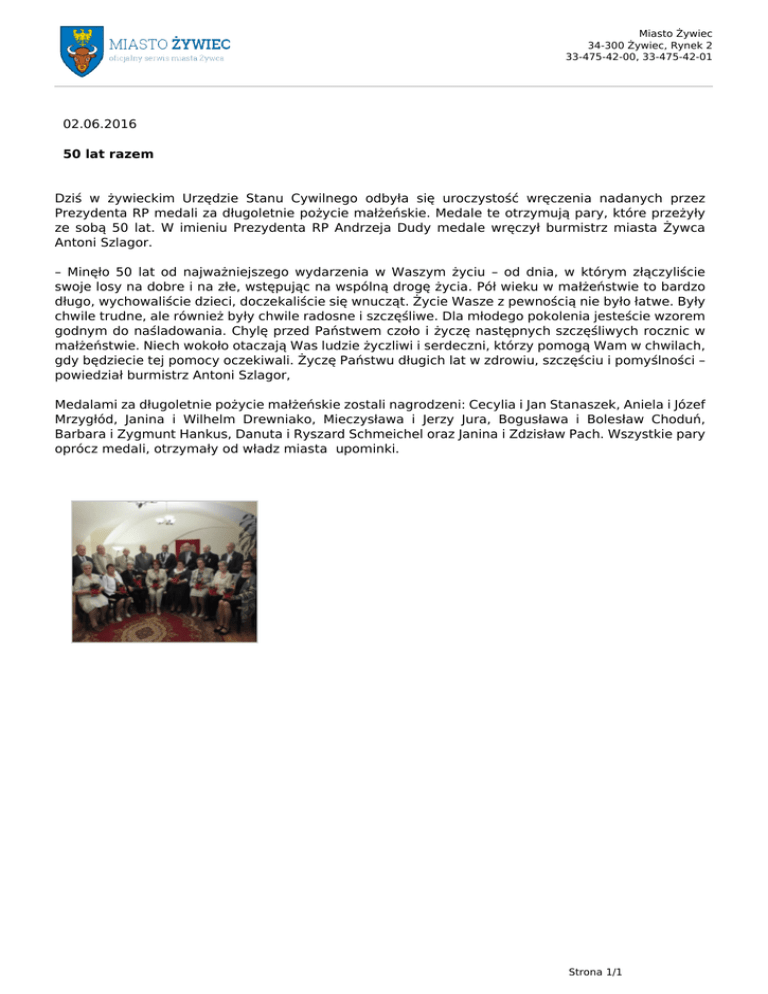 Miasto Żywiec 34-300 Żywiec, Rynek 2 33-475-42-00, 33-475-42-01 02.06.2016 50 lat razem Dziś w żywieckim Urzędzie Stanu Cywilnego odbyła się uroczystość wręczenia nadanych przez Prezydenta RP medali za długoletnie pożycie małżeńskie. Medale te otrzymują pary, które przeżyły ze sobą 50 lat. W imieniu Prezydenta RP Andrzeja Dudy medale wręczył burmistrz miasta Żywca Antoni Szlagor. – Minęło 50 lat od najważniejszego wydarzenia w Waszym życiu – od dnia, w którym złączyliście swoje losy na dobre i na złe, wstępując na wspólną drogę życia. Pół wieku w małżeństwie to bardzo długo, wychowaliście dzieci, doczekaliście się wnucząt. Życie Wasze z pewnością nie było łatwe. Były chwile trudne, ale również były chwile radosne i szczęśliwe. Dla młodego pokolenia jesteście wzorem godnym do naśladowania. Chylę przed Państwem czoło i życzę następnych szczęśliwych rocznic w małżeństwie. Niech wokoło otaczają Was ludzie życzliwi i serdeczni, którzy pomogą Wam w chwilach, gdy będziecie tej pomocy oczekiwali. Życzę Państwu długich lat w zdrowiu, szczęściu i pomyślności – powiedział burmistrz Antoni Szlagor, Medalami za długoletnie pożycie małżeńskie zostali nagrodzeni: Cecylia i Jan Stanaszek, Aniela i Józef Mrzygłód, Janina i Wilhelm Drewniako, Mieczysława i Jerzy Jura, Bogusława i Bolesław Choduń, Barbara i Zygmunt Hankus, Danuta i Ryszard Schmeichel oraz Janina i Zdzisław Pach. Wszystkie pary oprócz medali, otrzymały od władz miasta upominki. Strona 1/1 Powered by TCPDF (www.tcpdf.org)