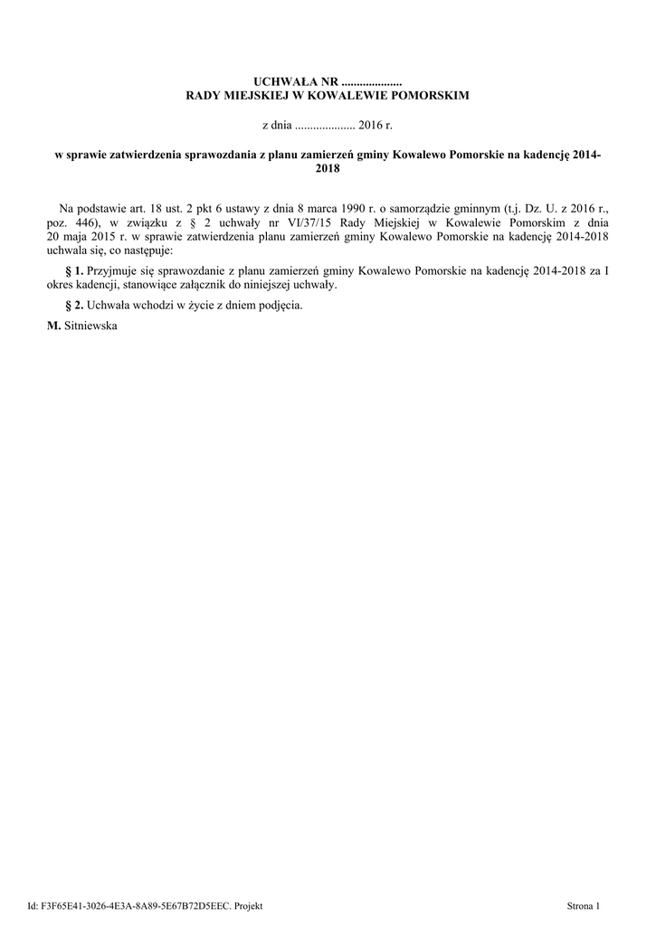 UCHWAŁA NR .................... RADY MIEJSKIEJ W KOWALEWIE POMORSKIM z dnia .................... 2016 r. w sprawie zatwierdzenia sprawozdania z planu zamierzeń gminy Kowalewo Pomorskie na kadencję 20142018 Na podstawie art. 18 ust. 2 pkt 6 ustawy z dnia 8 marca 1990 r. o samorządzie gminnym (t.j. Dz. U. z 2016 r., poz. 446), w związku z § 2 uchwały nr VI/37/15 Rady Miejskiej w Kowalewie Pomorskim z dnia 20 maja 2015 r. w sprawie zatwierdzenia planu zamierzeń gminy Kowalewo Pomorskie na kadencję 2014-2018 uchwala się, co następuje: § 1. Przyjmuje się sprawozdanie z planu zamierzeń gminy Kowalewo Pomorskie na kadencję 2014-2018 za I okres kadencji, stanowiące załącznik do niniejszej uchwały. § 2. Uchwała wchodzi w życie z dniem podjęcia. M. Sitniewska Id: F3F65E41-3026-4E3A-8A89-5E67B72D5EEC. Projekt Strona 1 Uzasadnienie Zgodnie z art. 18 ust. 2 pkt 6 ustawy z dnia 8 marca 1990 r. o samorządzie gminnym (t.j. Dz.U. z 2016 r., poz. 446), do wyłącznej kompetencji rady gminy należy uchwalanie programów gospodarczych. Rada Miejska w Kowalewie Pomorskim, uchwałą nr VI/37/15 Rady Miejskiej w Kowalewie Pomorskim z dnia 20 maja 2015 r. zatwierdziła plan zamierzeń gminy Kowalewo Pomorskie na kadencję 2014 –2018, określający w sposób ogólny, główne zadania, które gmina będzie realizowała w w/w okresie. Plan zamierzeń jest narzędziem realizacji działań dotyczących kierunków strategicznego rozwoju miasta i gminy Kowalewo Pomorskie. Analizę wykonania planu kadencyjnego, zgodnie z § 2 uchwały nr VI/37/15 Rady Miejskiej w Kowalewie Pomorskim, ustalono na drugie półrocze 2016 r. (za I okres kadencji). Mając powyższe na uwadze, podjęcie niniejszej uchwały jest zasadne. M. Sitniewska Id: F3F65E41-3026-4E3A-8A89-5E67B72D5EEC. Projekt Strona 1 SPRAWOZDANIE Z PLANU ZAMIERZEŃ GMINY KOWALEWO POMORSKIE NA KADENCJĘ 2014 – 2018 I część sprawozdania – listopad 2014 – czerwiec 2016 Kowalewo Pomorskie, wrzesień 2016 1 1. DZIAŁANIA O ZNACZENIU PONAD LOKALNYM Budowa obwodnicy dla miasta Kowalewa Pomorskiego W dniu 13 listopada 2014 r. premier Ewa Kopacz i Marszałek Województwa Piotr Całbecki podpisali Kontrakt Terytorialny dla Województwa Kujawsko-Pomorskiego. Zawiera on 60 zadań inwestycyjnych na kwotę 25 miliardów złotych. Wśród najważniejszych są budowa kujawsko-pomorskich odcinków s-5 i s-10 z węzłem autostradowym w Czerniewicach, BiT City 2 i rewitalizacja Bydgoskiego Węzła Wodnego. W pakiecie projektów dotyczących infrastruktury drogowej znalazła się także obwodnica Kowalewa Pomorskiego. Zadanie wpisane jest również do strategii województwa kujawsko-pomorskiego. Obecnie trwają prace związane z aktualizacją części technicznej i środowiskowej. Po zakończeniu całość dokumentów zostanie przekazana do KOPI – celem ostatecznego wyboru wariantu. Kolejny etap to uzyskanie decyzji środowiskowej. Dalsze działania Gminy skupiać się będą na współpracy z Generalną Dyrekcją Dróg Krajowych i Autostrad w celu jak najszybszego przyjęcia do realizacji przedmiotowej inwestycji, współdziałania z właścicielami gruntów, przez grunty których przebiegać będzie inwestycja oraz innymi instytucjami współodpowiedzialnymi za jej realizację. • Modernizacja drogi wojewódzkiej Kowalewo Pomorskie – Golub-Dobrzyń Zadanie przewidziane do wspólnej realizacji samorządów tj. Powiatu GolubskoDobrzyńskiego, Gminy Kowalewo Pomorskie, Gminy Golub-Dobrzyń oraz Miasta GolubDobrzyń. Od współdziałania tych jednostek uzależniony będzie efekt końcowy tj. stworzenie bezpiecznego i szybkiego dojazdu do siedziby Powiatu Golubsko-Dobrzyńskiego oraz do węzła autostradowego A1 w Turznie, poprzez planowaną docelowo obwodnicę Kowalewa Pomorskiego. Opracowany został projekt Kujawsko-pomorskiego planu spójności komunikacji drogowej i kolejowej 2014 – 2020, zawierający planowane zadania inwestycyjne w zakresie budowy i przebudowy dróg wojewódzkich, budowy obwodnic oraz inwestycji kolejowych. Droga wojewódzka Chełmża - Kowalewo Pomorskie - Golub-Dobrzyń zakwalifikowana została do trzeciej grupy, a mianowicie Bieżące utrzymanie/remont. Gmina Kowalewo Pomorskie wniosła uwagi i wnioski do projektu Planu spójności komunikacji drogowej i kolejowej 2014-2020, które przesłano do Departamentu Rozwoju Regionalnego Urzędu Marszałkowskiego Województwa Kujawsko-Pomorskiego w Toruniu, z prośbą o ich uwzględnienie w ostatecznym dokumencie. Przeniesienie drogi wojewódzkiej nr 554 z Grupy 3 do Grupy 1 (odcinek Frydrychowo - GolubDobrzyń) uzasadniano w sposób następujący: „Po wybudowaniu Autostrady A-1 oraz węzła autostradowego w Turznie wzrósł nieporównywalnie, niewspółmiernie, ruch na krajowej „15” a dalej drogą wojewódzką 554 w kierunku Golubia-Dobrzynia, Rypina, Sierpca, Warszawy. Przebudowa drogi 554 podniesie bezpieczeństwo ruchu drogowego dla pojazdów i pieszych oraz poprawi jakość infrastruktury drogowej w tym rejonie województwa”. Wnioskowana do przebudowy droga na odcinku z Frydrychowa do Golubia-Dobrzynia stanowić będzie połączenie przebudowanej DW 534 Grudziądz-Radomin oraz planowanej obwodnicy miasta Kowalewo Pomorskie. Wyżej wskazane przedsięwzięcia będą realizowane we współpracy z Generalną Dyrekcją Dróg Krajowych i Autostrad (Proponowany program obwodnic i obejść miejscowości na ciągach drogowych w województwie kujawsko-pomorskim). Realizacja tego zadania to kontynuacja realizacji zadań prowadzonych przez Zarząd Województwa w latach 2007-2014 (DW 534 Radomin - Rypin; DW 534 Grudziądz – Radomin). Pozwoli na zapewnienie sprawnych i funkcjonalnych połączeń komunikacyjnych, zwiększy mobilność lokalnej społeczności, poprawi warunki dla działalności inwestycyjnych oraz przyczyni się do usprawnienia 2 połączenia drogowego pomiędzy miastami Rypinem, Golubiem-Dobrzyniem, Kowalewem Pomorskim a Toruniem. Ponadto, zapewni sprawne połącze