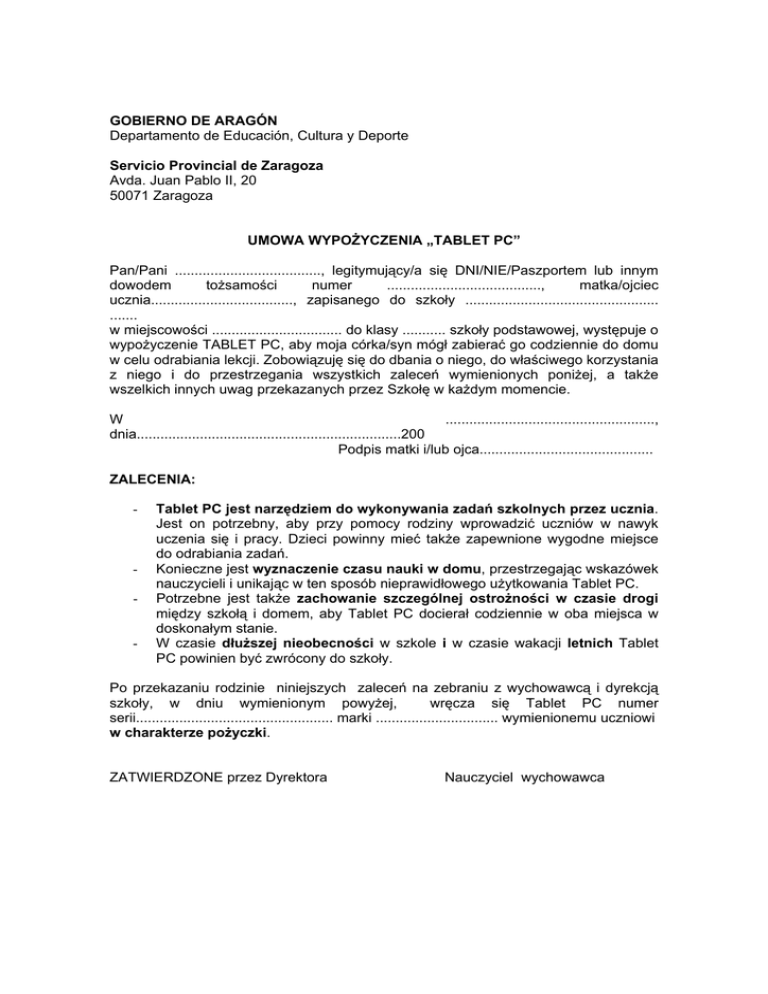 GOBIERNO DE ARAGÓN Departamento de Educación, Cultura y Deporte Servicio Provincial de Zaragoza Avda. Juan Pablo II, 20 50071 Zaragoza UMOWA WYPOŻYCZENIA „TABLET PC” Pan/Pani ....................................., legitymujący/a się DNI/NIE/Paszportem lub innym dowodem tożsamości numer ......................................., matka/ojciec ucznia...................................., zapisanego do szkoły ................................................. ....... w miejscowości ................................. do klasy ........... szkoły podstawowej, występuje o wypożyczenie TABLET PC, aby moja córka/syn mógł zabierać go codziennie do domu w celu odrabiania lekcji. Zobowiązuję się do dbania o niego, do właściwego korzystania z niego i do przestrzegania wszystkich zaleceń wymienionych poniżej, a także wszelkich innych uwag przekazanych przez Szkołę w każdym momencie. W ....................................................., dnia...................................................................200 Podpis matki i/lub ojca............................................ ZALECENIA: - - - Tablet PC jest narzędziem do wykonywania zadań szkolnych przez ucznia. Jest on potrzebny, aby przy pomocy rodziny wprowadzić uczniów w nawyk uczenia się i pracy. Dzieci powinny mieć także zapewnione wygodne miejsce do odrabiania zadań. Konieczne jest wyznaczenie czasu nauki w domu, przestrzegając wskazówek nauczycieli i unikając w ten sposób nieprawidłowego użytkowania Tablet PC. Potrzebne jest także zachowanie szczególnej ostrożności w czasie drogi między szkołą i domem, aby Tablet PC docierał codziennie w oba miejsca w doskonałym stanie. W czasie dłuższej nieobecności w szkole i w czasie wakacji letnich Tablet PC powinien być zwrócony do szkoły. Po przekazaniu rodzinie niniejszych zaleceń na zebraniu z wychowawcą i dyrekcją szkoły, w dniu wymienionym powyżej, wręcza się Tablet PC numer serii.................................................. marki ............................... wymienionemu uczniowi w charakterze pożyczki. ZATWIERDZONE przez Dyrektora Nauczyciel wychowawca