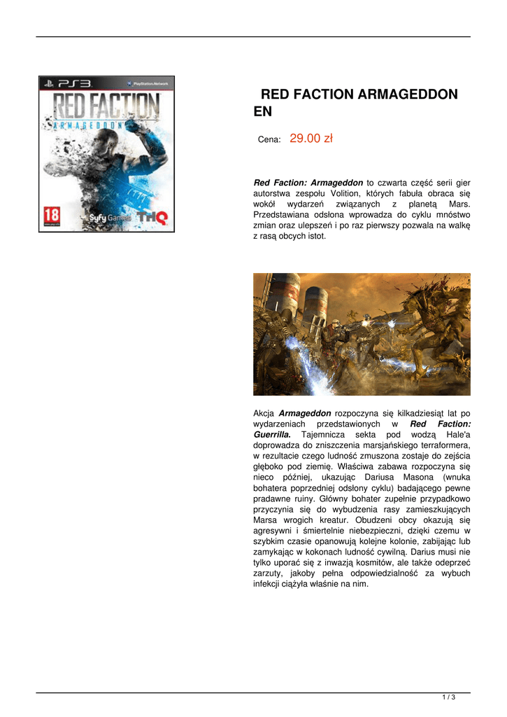 RED FACTION ARMAGEDDON EN Cena: 29.00 zł Red Faction: Armageddon to czwarta część serii gier autorstwa zespołu Volition, których fabuła obraca się wokół wydarzeń związanych z planetą Mars. Przedstawiana odsłona wprowadza do cyklu mnóstwo zmian oraz ulepszeń i po raz pierwszy pozwala na walkę z rasą obcych istot. Akcja Armageddon rozpoczyna się kilkadziesiąt lat po wydarzeniach przedstawionych w Red Faction: Guerrilla. Tajemnicza sekta pod wodzą Hale'a doprowadza do zniszczenia marsjańskiego terraformera, w rezultacie czego ludność zmuszona zostaje do zejścia głęboko pod ziemię. Właściwa zabawa rozpoczyna się nieco później, ukazując Dariusa Masona (wnuka bohatera poprzedniej odsłony cyklu) badającego pewne pradawne ruiny. Główny bohater zupełnie przypadkowo przyczynia się do wybudzenia rasy zamieszkujących Marsa wrogich kreatur. Obudzeni obcy okazują się agresywni i śmiertelnie niebezpieczni, dzięki czemu w szybkim czasie opanowują kolejne kolonie, zabijając lub zamykając w kokonach ludność cywilną. Darius musi nie tylko uporać się z inwazją kosmitów, ale także odeprzeć zarzuty, jakoby pełna odpowiedzialność za wybuch infekcji ciążyła właśnie na nim. 1/3 Red Faction: Armageddon stanowi świeże podejście do tematyki serii. Znana z Guerrilli swoboda poruszania została zastąpiona bardziej liniową strukturą gry, z naciskiem położonym na fabułę oraz filmowe podejście do jej przedstawienia. Powraca element rozpoznawczy całego cyklu, czyli możliwość niszczenia terenu, co możliwe jest dzięki wyposażeniu nas w zestaw potężnych narzędzi. Najcenniejsze urządzenie w grze to Magnet Gun, czyli Karabin Magnetyczny. Zasada jego działania jest bardzo prosta i polega na przyciąganiu pierwszego trafionego obiektu do drugiego celu. Oznacza to, że możemy np. oderwać kawałek ściany i posłać w stronę atakującego nas kosmity lub też odwracając kolejność celów sprawić, że obcy z impetem uderzy w sufit. Wśród innych ciekawych broni pojawiają się takie ciekawe zabawki jak działo szynowe, karabin plazmowy, czy generator czarnych dziur. Mason może ponadto korzystać z nano-kuźni, odpychając z jej pomocą potwory lub odbudowując zniszczone konstrukcje. Z czasem nawet tak wymyślne gadżety okazują się niewystarczające. Wtedy do gry wkraczają egzoszkielety, wielkie maszyny kroczące, a nawet myśliwiec, za sterami którego możemy siać destrukcję na jeszcze większą skalę. 2/3 Zobacz wideo: Szczegóły wersja językowa ANGIELSKA 3/3 Powered by TCPDF (www.tcpdf.org)