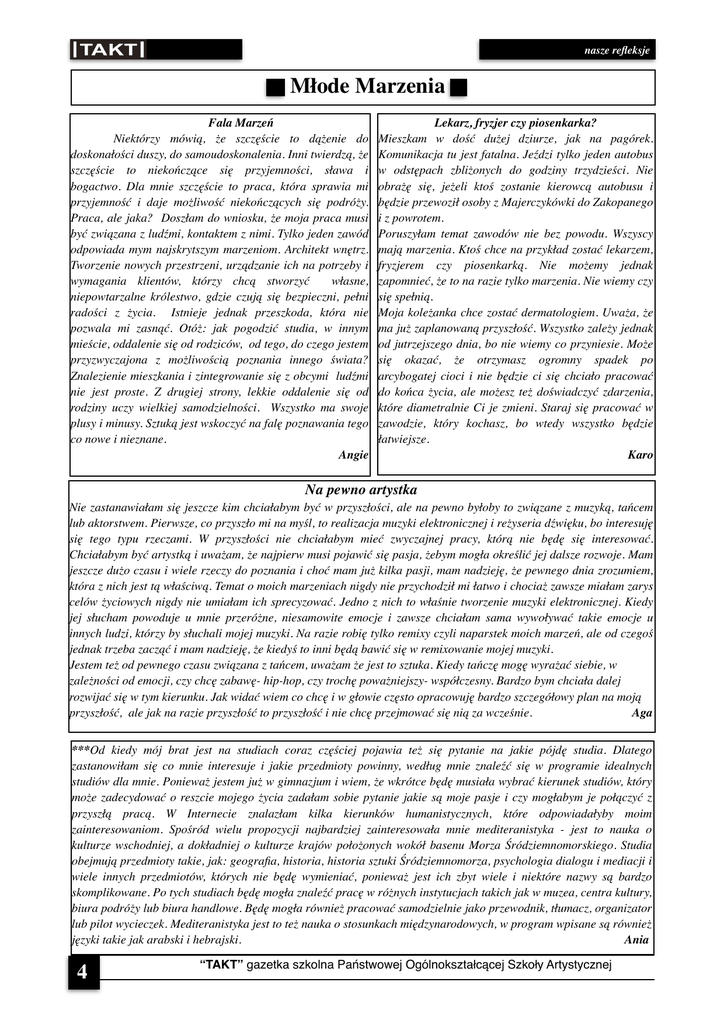nasze refleksje Młode Marzenia Fala Marzeń Niektórzy mówią, że szczęście to dążenie do doskonałości duszy, do samoudoskonalenia. Inni twierdzą, że szczęście to niekończące się przyjemności, sława i bogactwo. Dla mnie szczęście to praca, która sprawia mi przyjemność i daje możliwość niekończących się podróży. Praca, ale jaka? Doszłam do wniosku, że moja praca musi być związana z ludźmi, kontaktem z nimi. Tylko jeden zawód odpowiada mym najskrytszym marzeniom. Architekt wnętrz. Tworzenie nowych przestrzeni, urządzanie ich na potrzeby i wymagania klientów, którzy chcą stworzyć własne, niepowtarzalne królestwo, gdzie czują się bezpieczni, pełni radości z życia. Istnieje jednak przeszkoda, która nie pozwala mi zasnąć. Otóż: jak pogodzić studia, w innym mieście, oddalenie się od rodziców, od tego, do czego jestem przyzwyczajona z możliwością poznania innego świata? Znalezienie mieszkania i zintegrowanie się z obcymi ludźmi nie jest proste. Z drugiej strony, lekkie oddalenie się od rodziny uczy wielkiej samodzielności. Wszystko ma swoje plusy i minusy. Sztuką jest wskoczyć na falę poznawania tego co nowe i nieznane. Angie Lekarz, fryzjer czy piosenkarka? Mieszkam w dość dużej dziurze, jak na pagórek. Komunikacja tu jest fatalna. Jeździ tylko jeden autobus w odstępach zbliżonych do godziny trzydzieści. Nie obrażę się, jeżeli ktoś zostanie kierowcą autobusu i będzie przewoził osoby z Majerczykówki do Zakopanego i z powrotem. Poruszyłam temat zawodów nie bez powodu. Wszyscy mają marzenia. Ktoś chce na przykład zostać lekarzem, fryzjerem czy piosenkarką. Nie możemy jednak zapomnieć, że to na razie tylko marzenia. Nie wiemy czy się spełnią. Moja koleżanka chce zostać dermatologiem. Uważa, że ma już zaplanowaną przyszłość. Wszystko zależy jednak od jutrzejszego dnia, bo nie wiemy co przyniesie. Może się okazać, że otrzymasz ogromny spadek po arcybogatej cioci i nie będzie ci się chciało pracować do końca życia, ale możesz też doświadczyć zdarzenia, które diametralnie Ci je zmieni. Staraj się pracować w zawodzie, który kochasz, bo wtedy wszystko będzie łatwiejsze. Karo Na pewno artystka Nie zastanawiałam się jeszcze kim chciałabym być w przyszłości, ale na pewno byłoby to związane z muzyką, tańcem lub aktorstwem. Pierwsze, co przyszło mi na myśl, to realizacja muzyki elektronicznej i reżyseria dźwięku, bo interesuję się tego typu rzeczami. W przyszłości nie chciałabym mieć zwyczajnej pracy, którą nie będę się interesować. Chciałabym być artystką i uważam, że najpierw musi pojawić się pasja, żebym mogła określić jej dalsze rozwoje. Mam jeszcze dużo czasu i wiele rzeczy do poznania i choć mam już kilka pasji, mam nadzieję, że pewnego dnia zrozumiem, która z nich jest tą właściwą. Temat o moich marzeniach nigdy nie przychodził mi łatwo i chociaż zawsze miałam zarys celów życiowych nigdy nie umiałam ich sprecyzować. Jedno z nich to właśnie tworzenie muzyki elektronicznej. Kiedy jej słucham powoduje u mnie przeróżne, niesamowite emocje i zawsze chciałam sama wywoływać takie emocje u innych ludzi, którzy by słuchali mojej muzyki. Na razie robię tylko remixy czyli naparstek moich marzeń, ale od czegoś jednak trzeba zacząć i mam nadzieję, że kiedyś to inni będą bawić się w remixowanie mojej muzyki. Jestem też od pewnego czasu związana z tańcem, uważam że jest to sztuka. Kiedy tańczę mogę wyrażać siebie, w zależności od emocji, czy chcę zabawę- hip-hop, czy trochę poważniejszy- współczesny. Bardzo bym chciała dalej rozwijać się w tym kierunku. Jak widać wiem co chcę i w głowie często opracowuję bardzo szczegółowy plan na moją przyszłość, ale jak na razie przyszłość to przyszłość i nie chcę przejmować się nią za wcześnie. Aga ***Od kiedy mój brat jest na studiach coraz częściej pojawia też się pytanie na jakie pójdę studia. Dlatego zastanowiłam się co mnie interesuje i jakie przedmioty powinny, według mnie znaleźć się w programie idealnych studiów dla mnie. Ponieważ jestem już w gimnazjum i wiem, że wkrótce będę musiała wybrać kierunek studiów, który może zadecydować o reszcie mojego życia zadałam sobie pytanie jakie są moje pasje i czy mogłabym je połączyć z przyszłą pracą. W Internecie znalazłam kilka kierunków humanistycznych, które odpowiadałyby moim zainteresowaniom. Spośród wielu propozycji najbardziej zainteresowała mnie mediteranistyka - jest to nauka o kulturze wschodniej, a dokładniej o kulturze krajów położonych wokół basenu Morza Śródziemnomorskiego. Studia obejmują przedmioty takie, jak: geografia, historia, historia sztuki Śródziemnomorza, psychologia dialogu i mediacji i wiele innych przedmiotów, których nie będę wymieniać, ponieważ jest ich zbyt wiele i niektóre nazwy są bardzo skomplikowane. Po tych studiach będę mogła znaleźć pracę w różnych instytucjach takich jak w muzea, centra kultury, biura podróży lub biura handlowe. Będę mogła również pracować samodzielnie jako przewodnik, tłumacz, organizator lub pilot wycieczek. Mediteranistyka jest to też nauka o stosunkach międzynarodowych, w program wpisane są również języki takie jak arabski i hebrajski. Ania 4 “TAKT” gazetka szkolna Państwowej Ogólnokształcącej Szkoły Artystycznej