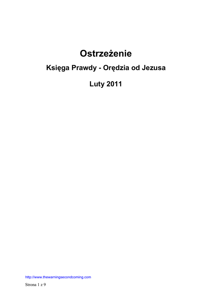 Ostrzeżenie Księga Prawdy - Orędzia od Jezusa Luty 2011 http://www.thewarningsecondcoming.com Strona 1 z 9 Miłość jest drogą do Zbawienia ......................................................................................... 3 Globalne nawrócenie wkrótce nastąpi ............................................................................. 3 Publikuj Moje orędzia na całym świecie........................................................................... 4 Przesłanie od Ducha Świętego ......................................................................................... 5 Pilne ostrzeżenie ................................................................................................................. 6 Ostatnie przesłanie dla 1 tomu „Ostrzeżenie”................................................................. 7 Strona 2 z 9 Miłość jest drogą do Zbawienia Orędzie nr 45 z serii Ostrzeżenie. Otrzymano, 5 luty 2011, godz. 11.50 Moja ukochana córko, otrzymałaś dziś specjalne łaski, abyś mogła zbliżyć się bardziej do Mnie. Bo tylko poprzez bycie blisko Mnie będziesz w stanie doświadczyć pokoju, miłości i radości w sercu. Tylko przez modlitwę i uchwycenie się Mnie pomimo swoich kłopotów pozostaniesz w jedności ze Mną. Kiedy poddajesz się Mnie i pokładasz ufność we Mnie, wtedy możesz zrozumieć miłość, jaką mam ku tobie w Moim Sercu. I kiedy tak uczynisz, twoja miłość ku Mnie wzrasta. Tylko jeżeli oddasz Mi swoje troski i powierzysz je w Moje dłonie, będą one przezwyciężone. Tylko kochając Mnie, możesz okazywać miłość innym. Tylko poprzez miłość będziesz pobłogosławiona darem patrzenia na innych poprzez Moje Serce, które jest pełne miłości i współczucia. Tylko kiedy okazujesz Mi prawdziwą miłość twoje życie się zmienia, a radość wypełnia codzienne życie. Nigdy się nie lękajcie, Moje kochane dzieci. To wszystko jest dla was pod dostatkiem, jeżeli tylko poprosicie o to. Kiedy otrzymacie tę miłość, nie zatrzymujcie jej dla siebie. Zanoście ją wszędzie, tak aby wszyscy, zwłaszcza dusze letnie mogły zaprosić Mnie do siebie. To jedyna droga do zbawienia. Wasz kochający Zbawiciel Jezus Chrystus Globalne nawrócenie wkrótce nastąpi Orędzie nr 46 z serii Ostrzeżenie Otrzymane w niedzielę, 6 luty 2011, godz. 13.40-14.00 Ukochana córko, to jest jedno z ostatnich przesłań, które mają być dołączone do pierwszej części Moich przekazów, zatytułowanych „Ostrzeżenie”. Moje ukochane dzieci, wkrótce zostaniecie uświadomieni o Mojej obecności poprzez surowe upomnienie. Już niedługo zarówno wierzący we Wszechmocnego Boga jak i ateiści otrzymają ostatnią szansę przed dniem chwały, w którym powrócę jako Sędzia. To wielkie wydarzenie otworzy wasze serca i będziecie patrzeć z bojaźnią na wspaniałą miłość, jaką wam okażę w tym akcie Mego Miłosierdzia. Wielu z was nie zdaje sobie sprawy, że Ja, czy Mój Przedwieczny Ojciec istniejemy. Moje Miłosierdzie rozszerzy się na wiele takich niewinnych dusz w czasie Ostrzeżenia. Bez względu na to jak będziecie Mnie chcieli nazwać, nowe zrozumienie obejmie wasze dusze. Bądźcie wdzięczni kiedy to się stanie bo Upomnienie będzie waszym Ratunkiem. Strona 3 z 9 Kiedy to wydarzenie się zakończy, wszyscy wierzący oraz ci którzy będą się radować, że w końcu poznali prawdę, staną się Moją „nową armią” na ziemi. Każdy z was, kto doświadczy przebaczenia grzechów, które wcześniej zostaną wam ukazane, będzie chciał zanieść prawdę tym, którzy pozostaną w ciemności. Ten dar, moje dzieci umocni wasze serca, gdy będziecie wyśmiewani z powodu Mojego Imienia. Bądźcie wdzięczni, gdy tak się będzie działo, bo wtedy będziecie wiedzieć, że jesteście Moimi prawdziwymi uczniami. Będziecie ze mną w Niebie, kiedy czas przeminie. Nie trwóżcie się, moi ukochani. Gdybyście mogli przez chwilę doświadczyć tej wspaniałości, tego światła i chwały, którą Mój Ojciec przygotował dla was w Raju, wasze ludzkie oczy nie mogłyby tego znieść. Raz tego doświadczywszy, błagalibyście Mnie, abym was zabrał z tej ziemi, która też jest piękna, bo też została stworzona przez Boga. Przesłanie Miłości dla ateistów Słuchajcie mnie niewierzący, zapamiętajcie te Moje ostatnie słowa, pomimo że wydają się one wam trudne. Każde z Moich dzieci na tej ziemi odczuwa w różnym stopniu miłość w swoim życiu. Kiedy odczuwacie to w swoim sercu, nie możecie tego zobaczyć, dotknąć, czasami nawet opisać. Nie ma żadnej naukowej metody opisania miłości. Miłość czyni was pokornymi, szczodrymi. Miłość może wam pomóc znieść wiele poświęceń. Miłość jest rzeczą skomplikowaną, ale pasjonującą. Nie jest wytworem człowieka, ale darem Boga. Miłość pochodzi tylko z jednego źródła. Miłość jest Bogiem. Bóg jest Miłością. To takie proste. Otwórzcie serca na czystą miłość, którą Ja i Mój Przedwieczny Ojciec mamy dla każdego z was. Patrzcie na Mnie tak jak dziecko patrzyłoby na swego rodzica. Wzywajcie Mnie, a wypełnię wasze serca. Kiedy to nastąpi, już nigdy nie powrócicie do tego, co było przedtem. Wasz kochający Zbawiciel Jezus Chrystus Publikuj Moje orędzia na całym świecie Orędzie nr 47 z serii Ostrzeżenie Otrzymano poniedziałek, 7 luty 2011, godz. 22.00 Moja córko, czułaś się trochę zagubiona i teraz prosisz o siłę, pewność i odwagę, aby wykonywać Moje polecenia. To jest dobre. Daj Mi swój czas, jak prosi Moja Ukochana Matka, ponieważ twoja dusza musi pozostać czysta, kiedy przekazujesz Moje słowo. Muszę Cię teraz prosić, abyś zaczęła publikować Moje cenne Ostrzeżenie, dar dla każdego pojedynczego człowieka na ziemi. Ludzie muszą poznać szczegóły do końca lutego, przez internet i na całym świecie. Pośpiesz się, dziecko, zrób co ma być zrobione, tak aby jak najwięcej ludzi miało szansę ich 