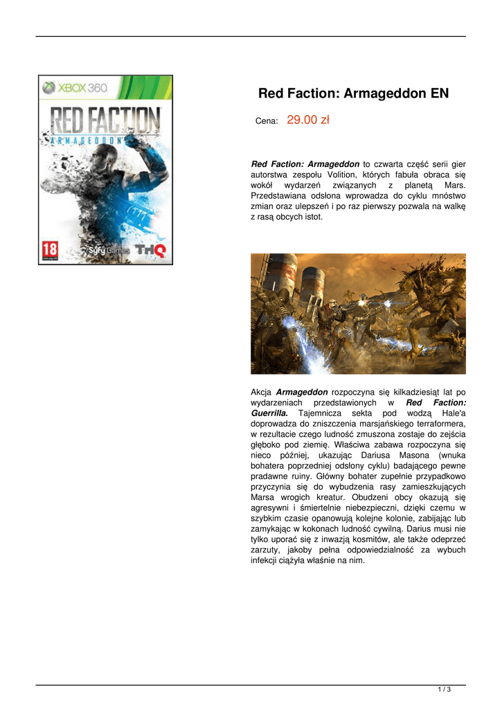 Red Faction: Armageddon EN Cena: 29.00 zł Red Faction: Armageddon to czwarta część serii gier autorstwa zespołu Volition, których fabuła obraca się wokół wydarzeń związanych z planetą Mars. Przedstawiana odsłona wprowadza do cyklu mnóstwo zmian oraz ulepszeń i po raz pierwszy pozwala na walkę z rasą obcych istot. Akcja Armageddon rozpoczyna się kilkadziesiąt lat po wydarzeniach przedstawionych w Red Faction: Guerrilla. Tajemnicza sekta pod wodzą Hale'a doprowadza do zniszczenia marsjańskiego terraformera, w rezultacie czego ludność zmuszona zostaje do zejścia głęboko pod ziemię. Właściwa zabawa rozpoczyna się nieco później, ukazując Dariusa Masona (wnuka bohatera poprzedniej odsłony cyklu) badającego pewne pradawne ruiny. Główny bohater zupełnie przypadkowo przyczynia się do wybudzenia rasy zamieszkujących Marsa wrogich kreatur. Obudzeni obcy okazują się agresywni i śmiertelnie niebezpieczni, dzięki czemu w szybkim czasie opanowują kolejne kolonie, zabijając lub zamykając w kokonach ludność cywilną. Darius musi nie tylko uporać się z inwazją kosmitów, ale także odeprzeć zarzuty, jakoby pełna odpowiedzialność za wybuch infekcji ciążyła właśnie na nim. 1/3 Red Faction: Armageddon stanowi świeże podejście do tematyki serii. Znana z Guerrilli swoboda poruszania została zastąpiona bardziej liniową strukturą gry, z naciskiem położonym na fabułę oraz filmowe podejście do jej przedstawienia. Powraca element rozpoznawczy całego cyklu, czyli możliwość niszczenia terenu, co możliwe jest dzięki wyposażeniu nas w zestaw potężnych narzędzi. Najcenniejsze urządzenie w grze to Magnet Gun, czyli Karabin Magnetyczny. Zasada jego działania jest bardzo prosta i polega na przyciąganiu pierwszego trafionego obiektu do drugiego celu. Oznacza to, że możemy np. oderwać kawałek ściany i posłać w stronę atakującego nas kosmity lub też odwracając kolejność celów sprawić, że obcy z impetem uderzy w sufit. Wśród innych ciekawych broni pojawiają się takie ciekawe zabawki jak działo szynowe, karabin plazmowy, czy generator czarnych dziur. Mason może ponadto korzystać z nano-kuźni, odpychając z jej pomocą potwory lub odbudowując zniszczone konstrukcje. Z czasem nawet tak wymyślne gadżety okazują się niewystarczające. Wtedy do gry wkraczają egzoszkielety, wielkie maszyny kroczące, a nawet myśliwiec, za sterami którego możemy siać destrukcję na jeszcze większą skalę. 2/3 Zobacz wideo: 3/3 Powered by TCPDF (www.tcpdf.org)