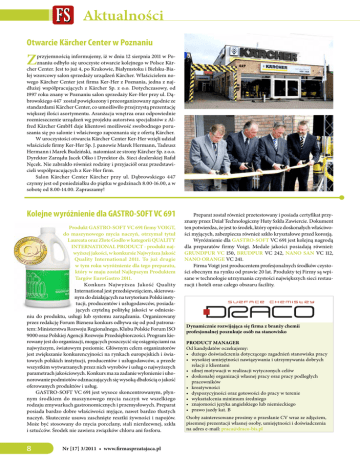 Aktualności Otwarcie Kärcher Center w Poznaniu Z przyjemnością informujemy, iż w dniu 12 sierpnia 2011 w Poznaniu odbyło się uroczyste otwarcie kolejnego w Polsce Kärcher Center. Jest to już 4, po Krakowie, Białymstoku i Bielsku-Białej wzorcowy salon sprzedaży urządzeń Kärcher. Właścicielem nowego Kärcher Center jest firma Ker-Her z Poznania, jedna z najdłużej współpracujących z Kärcher Sp. z o.o. Dotychczasowy, od 1997 roku znany w Poznaniu salon sprzedaży Ker-Her przy ul. Dąbrowskiego 447 został powiększony i przeorganizowany zgodnie ze standardami Kärcher Center, co umożliwiło przejrzystą prezentację większej ilości asortymentu. Aranżacja wnętrza oraz odpowiednie rozmieszczenie urządzeń wg projektu autorstwa specjalistów z Alfred Kärcher GmbH daje klientowi możliwość swobodnego poruszania się po salonie i właściwego zapoznania się z ofertą Kärcher. W uroczystości otwarcia Kärcher Center Ker-Her wzięli udział właściciele firmy Ker-Her Sp. J. panowie Marek Hermann, Tadeusz Hermann i Marek Budziński, natomiast ze strony Kärcher Sp. z o.o. Dyrektor Zarządu Jacek Olko i Dyrektor ds. Sieci dealerskiej Rafał Nęcek. Nie zabrakło również rodziny i przyjaciół oraz przedstawicieli współpracujących z Ker-Her firm. Salon Kärcher Center Kärcher przy ul. Dąbrowskiego 447 czynny jest od poniedziałku do piątku w godzinach 8.00-16.00, a w sobotę od 8.00-14.00. Zapraszamy! Kolejne wyróżnienie dla GASTRO-SOFT VC 691 Produkt GASTRO-SOFT VC 691 firmy VOIGT, do maszynowego mycia naczyń, otrzymał tytuł Laureata oraz Złote Godło w kategorii QUALITY INTERNATIONAL PRODUCT - produkt najwyższej jakości, w konkursie Najwyższa Jakość Quality International 2011. To już drugie w tym roku wyróżnienie dla tego preparatu, który w maju został Najlepszym Produktem Targów EuroGastro 2011. Konkurs Najwyższa Jakość Quality International jest przedsięwzięciem, skierowanym do działających na terytorium Polski instytucji, producentów i usługodawców, posiadających czytelną politykę jakości w odniesieniu do produktu, usługi lub systemu zarządzania. Organizowany przez redakcję Forum Biznesu konkurs odbywa się od pod patronatem: Ministerstwa Rozwoju Regionalnego, Klubu Polskie Forum ISO 9000 oraz Polskiej Agencji Rozwoju Przedsiębiorczości. Program kierowany jest do organizacji, mogących poszczycić się osiągnięciami na najwyższym, światowym poziomie. Głównym celem organizatorów jest zwiększanie konkurencyjności na rynkach europejskich i światowych polskich instytucji, producentów i usługodawców, a przede wszystkim wytwarzanych przez nich wyrobów i usług o najwyższych parametrach jakościowych. Konkurs ma za zadanie wyłonienie i uhonorowanie podmiotów odznaczających się wysoką dbałością o jakość oferowanych produktów i usług. GASTRO-SOFT VC 691 jest wysoce skoncentrowanym, płynnym środkiem do maszynowego mycia naczyń we wszelkiego rodzaju zmywarkach gastronomicznych i przemysłowych. Preparat posiada bardzo dobre właściwości myjące, nawet bardzo tłustych naczyń. Skutecznie usuwa zaschnięte resztki żywności i napojów. Może być stosowany do mycia porcelany, stali nierdzewnej, szkła i sztućców. Środek nie zawiera związków chloru ani fosforu. 8 Nr [17] 3/2011 • www.firmasprzatajaca.pl Preparat został również przetestowany i posiada certyfikat przyznany przez Dział Technologiczny Huty Szkła Zawiercie. Dokument ten potwierdza, że jest to środek, który oprócz doskonałych właściwości myjących, zabezpiecza również szkło kryształowe przed korozją. Wyróżnienie dla GASTRO-SOFT VC 691 jest kolejną nagrodą dla preparatów firmy Voigt. Medale jakości posiadają również: GRUNDPUR VC 150, BRUDPUR VC 242, NANO SAN VC 112, NANO ORANGE VC 241. Firma Voigt jest producentem profesjonalnych środków czystości obecnym na rynku od prawie 20 lat. Produkty tej Firmy są wpisane w technologie utrzymania czystości największych sieci restauracji i hoteli oraz całego obszaru facility. Dynamicznie rozwijająca się firma z branży chemii profesjonalnej poszukuje osób na stanowisko PRODUCT MANAGER Od kandydatów oczekujemy: • dużego doświadczenia dotyczącego zagadnień stanowiska pracy • wysokiej umiejętności nawiązywania i utrzymywania dobrych relacji z klientami • silnej motywacji w realizacji wytyczonych celów • doskonałej organizacji własnej pracy oraz pracy podległych pracowników • kreatywności • dyspozycyjności oraz gotowości do pracy w terenie • wykształcenia minimum średniego • znajomości języka angielskiego lub niemieckiego • prawo jazdy kat. B Osoby zainteresowane prosimy o przesłanie CV wraz ze zdjęciem, pisemnej prezentacji własnej osoby, umiejętności i doświadczenia na adres e-mail: [email protected] Aktualności Szkolenie Kiehl & Żegarski 12 września 2011 r. w sali konferencyjnej hotelu Gromada w Warszawie w ramach corocznych prezentacji produktów czyszcząco–pielęgnacyjnych Johannes Kiehl KG oraz technologii ich zastosowania, firma Kiehl & Żegarski – czyste rozwiązania Sp. z o. o. przeprowadziła dla managementu firm usługowych z całego kraju seminarium o tematyce: „Innowacyjność I Technologia Zastosowania Profesjonalnych Preparatów Czyszcząco – Pielęgnacyjnych Johannes Kiehl KG”. Dr Reiner Hofmann, inż. Gerald Pest oraz mgr Robert Żegarski zaprezentowali polskim liderom branży czystości najnowsze i najskuteczniejsze rozwiązania chemiczne opracowane w Laboratorium Kiehla w Odelzhausen oraz w interesujący sposób przełożyli je na język codziennej techniki użytkowej w trzech obszernych blokach tematycznych: — Co warto wiedzieć o chemii czyszczącej Johannes Kiehl KG W pierwszej części seminarium pogłębiono podstawy dotyczące chemii czyszczącej Kiehla. Obok teoretycznych podstaw przeprowadzono liczne doświadczenia, które uwidoczniły w praktyce omawiane tematy (między inny