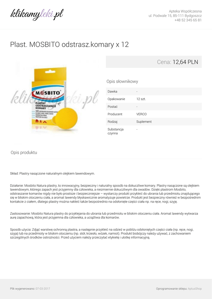 Apteka Współczesna ul. Podwale 15, 85-111 Bydgoszcz +48 52 345 65 81 Plast. MOSBITO odstrasz.komary x 12 Cena: 12,64 PLN Opis słownikowy Dawka - Opakowanie 12 szt. Postać - Producent VERCO Rodzaj Suplement Substancja czynna - Opis produktu Skład: Plastry nasączone naturalnym olejkiem lawendowym. Działanie: Mosbito Natura plastry, to innowacyjny, bezpieczny i naturalny sposób na dokuczliwe komary. Plastry nasączone są olejkiem lawendowym, którego zapach jest przyjemny dla człowieka, a niezmiernie dokuczliwym dla owadów. Dzięki plastrom Mosbito, odstraszanie komarów nigdy nie było prostsze i bezpieczniejsze – wystarczy produkt przykleić do ubrania lub przedmiotu znajdującego się w bliskim otoczeniu ciała, a aromat lawendy błyskawicznie aromatyzuje powietrze. Produkt jest bezpieczny również w bezpośrednim kontakcie z ciałem, dlatego plastry można nakleić także bezpośrednio na odsłonięte części ciała np. na ręce, nogi, szyję. Zastosowanie: Mosbito Natura plastry do przyklejania do ubrania lub przedmiotu w bliskim otoczeniu ciała. Aromat lawendy wytwarza aurę zapachową, która jest przyjemna dla człowieka, a uciążliwa dla komarów. Sposób użycia: Zdjąć warstwę ochronną plastra, a następnie przykleić na odzież w pobliżu odsłoniętych części ciała (np. ręce, nogi, szyja) lub na przedmioty w bliskim otoczeniu (np. stół, krzesło, wózek, namiot). Produkt biobójczy należy używać, z zachowaniem szczególnych środków ostrożności. Przed użyciem należy przeczytać etykietę i ulotkę informacyjną. Plik wygenerowano: 07-03-2017 Powered by TCPDF (www.tcpdf.org) Oprogramowanie sklepu: AptusShop