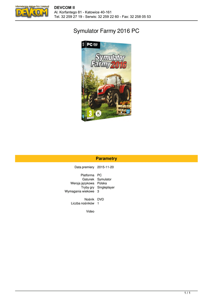 DEVCOM II Al. Korfantego 81 - Katowice 40-161 Tel. 32 259 27 19 - Serwis: 32 259 22 60 - Fax: 32 258 05 53 Symulator Farmy 2016 PC Parametry Data premiery 2015-11-20 Platforma Gatunek Wersja językowa Tryby gry Wymagania wiekowe PC Symulator Polska Singleplayer 3 Nośnik DVD Liczba nośników 1 Video 1/1 Powered by TCPDF (www.tcpdf.org)