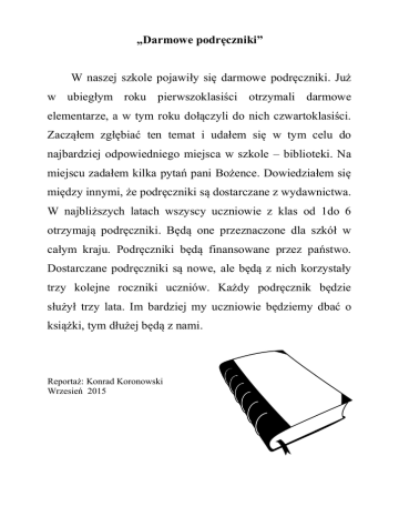 „Darmowe podręczniki” W naszej szkole pojawiły się darmowe podręczniki. Już w ubiegłym roku pierwszoklasiści otrzymali darmowe elementarze, a w tym roku dołączyli do nich czwartoklasiści. Zacząłem zgłębiać ten temat i udałem się w tym celu do najbardziej odpowiedniego miejsca w szkole – biblioteki. Na miejscu zadałem kilka pytań pani Bożence. Dowiedziałem się między innymi, że podręczniki są dostarczane z wydawnictwa. W najbliższych latach wszyscy uczniowie z klas od 1do 6 otrzymają podręczniki. Będą one przeznaczone dla szkół w całym kraju. Podręczniki będą finansowane przez państwo. Dostarczane podręczniki są nowe, ale będą z nich korzystały trzy kolejne roczniki uczniów. Każdy podręcznik będzie służył trzy lata. Im bardziej my uczniowie będziemy dbać o książki, tym dłużej będą z nami. Reportaż: Konrad Koronowski Wrzesień 2015